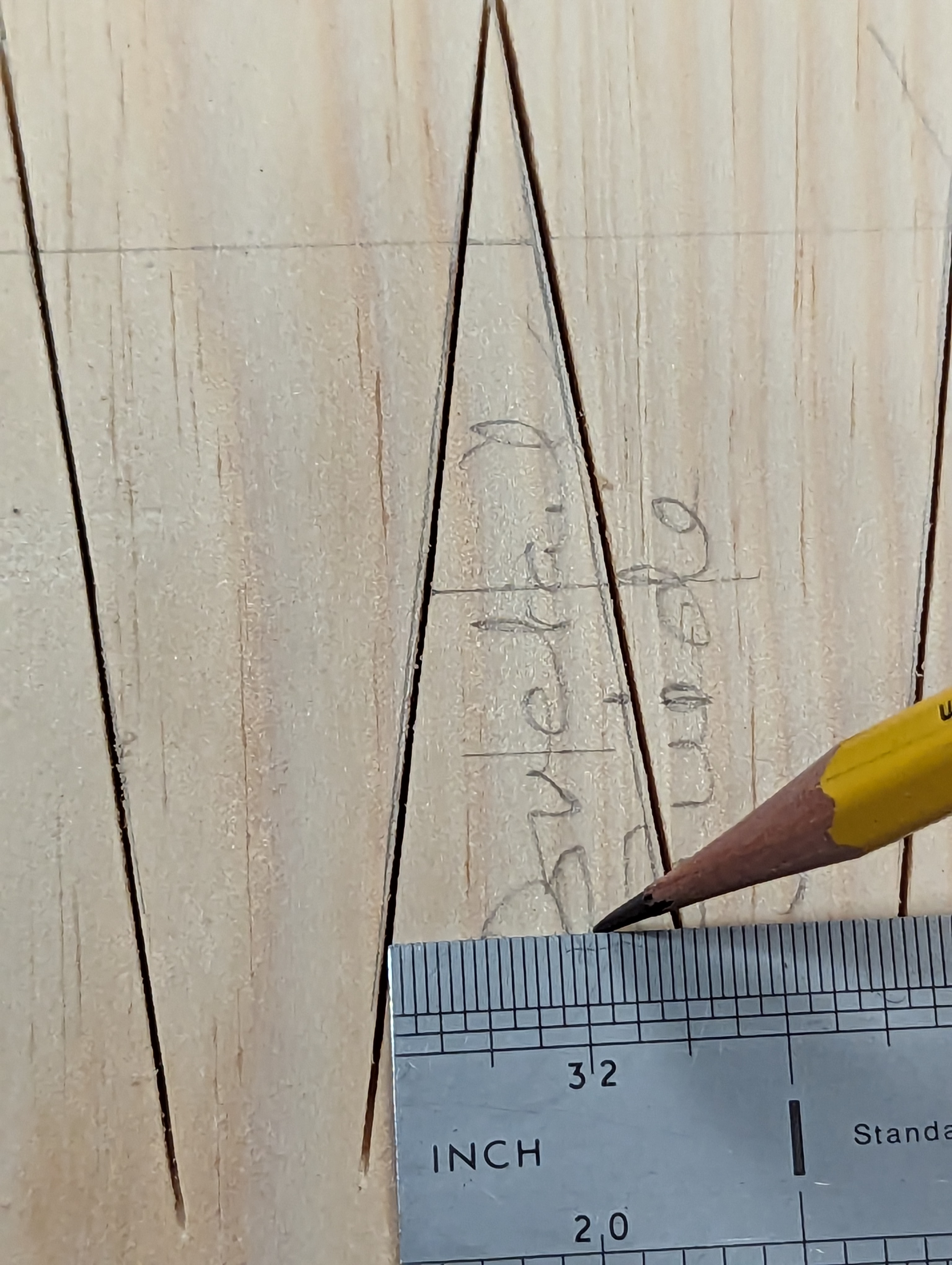 With the square-across saw kerfs in place, angle the saw to follow the pencilled guidelines.