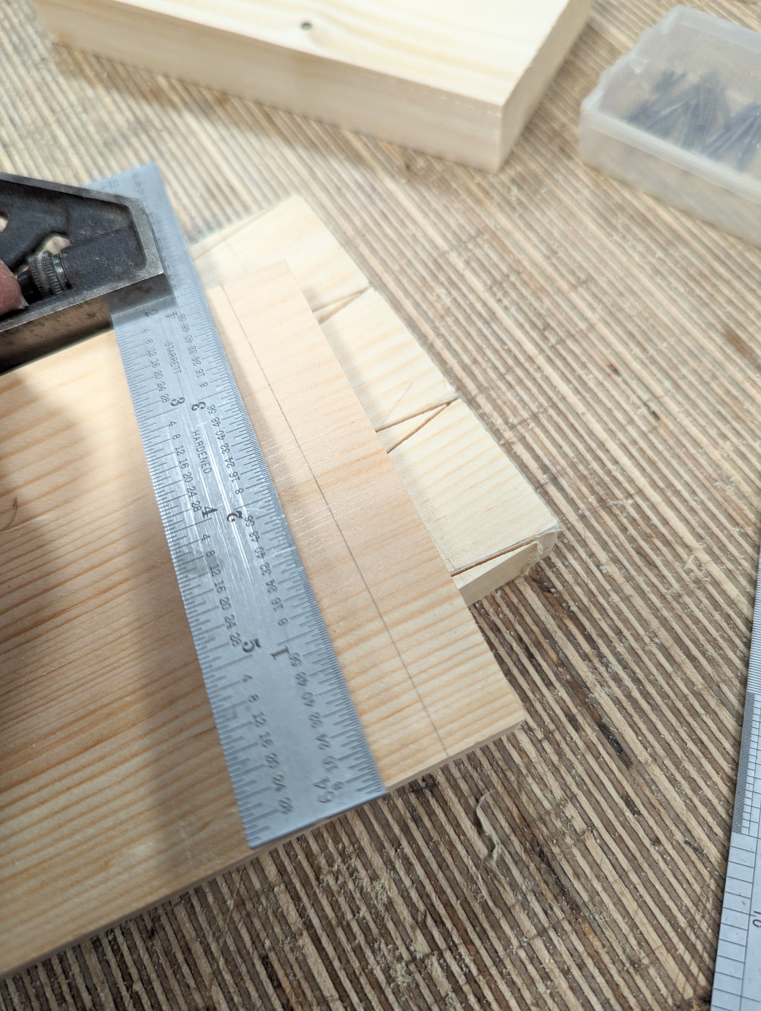 In my case, I used 4" wide wood or 102mm. If you want five dovetails divide the width by five. In my case, I want three so I divide 102mm by three and get my 34mm division for three dovetails totalling 102mm.