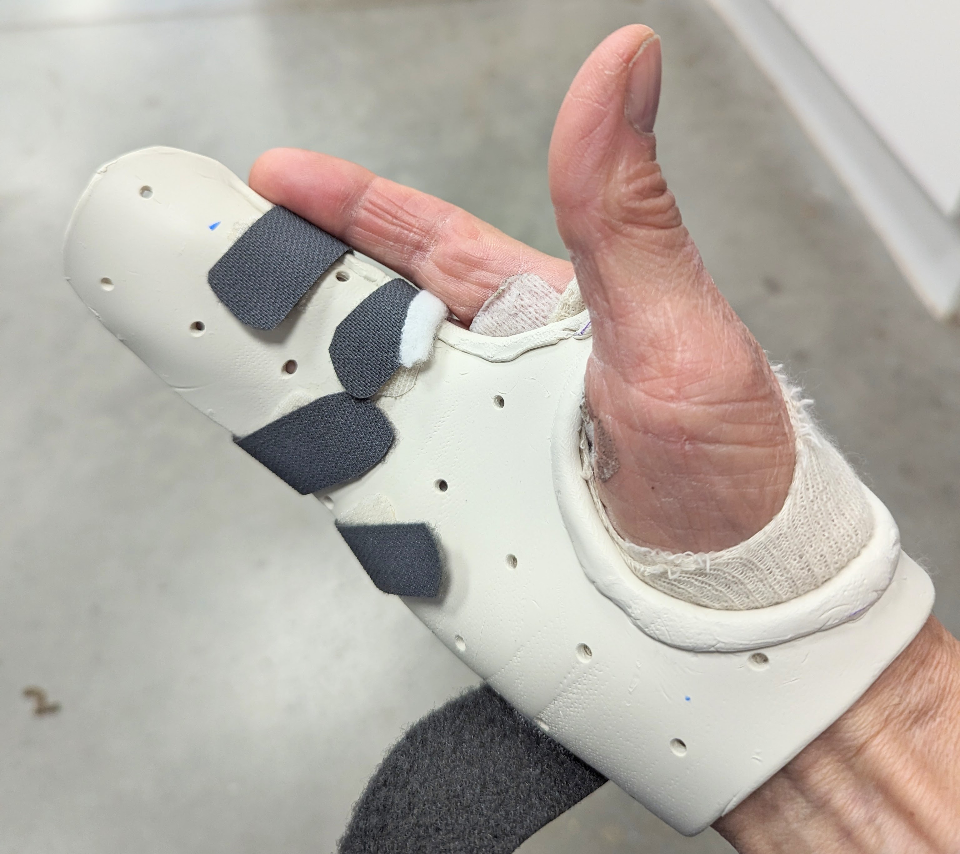 I stood up and walked out to a waiting area to go to occupational therapy for follow-up physio and splints for my fingers. This was another insightful experience watching them mould thermoplastic to my hand to add velcro straps to to keep the splints in place as I sleep. This is DIY from here on. Exercises six times a day, splints to keep my fingers straight through the night to aid recovery and stop my hands from making a fist in my sleep.