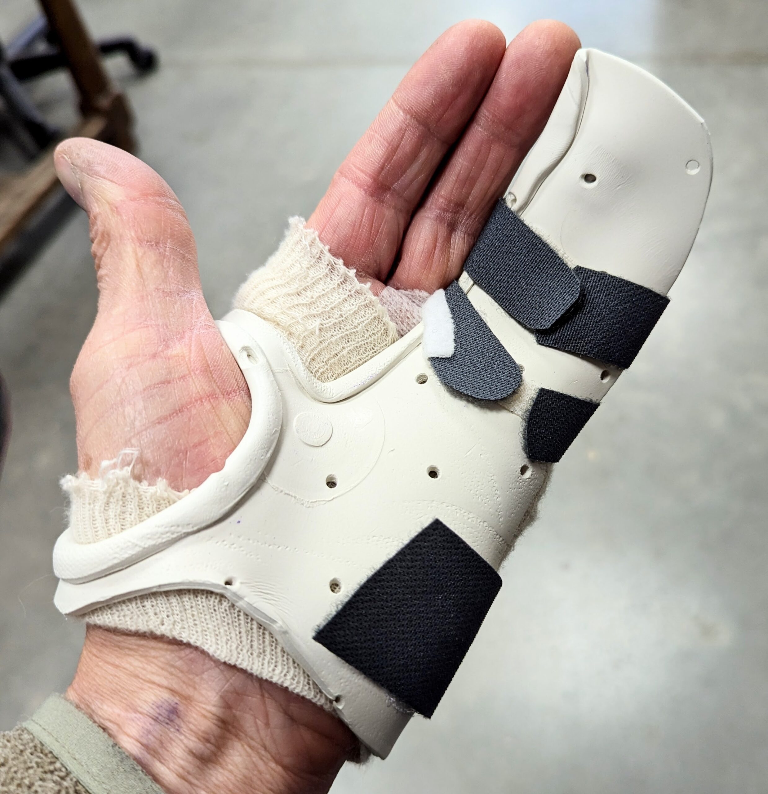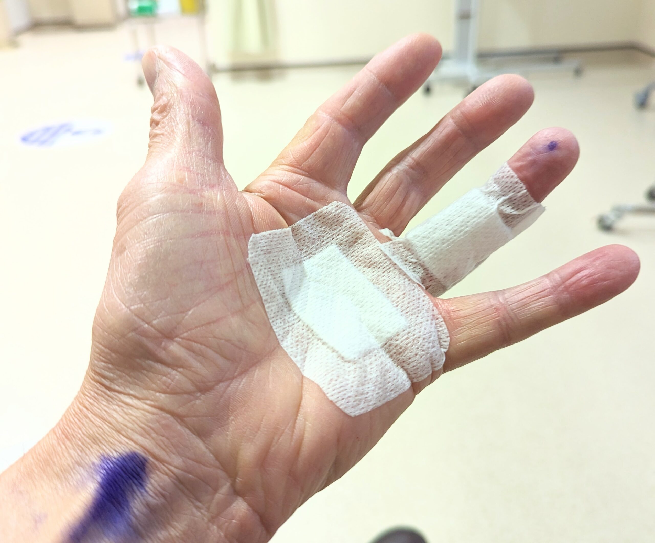 I stood up and walked out to a waiting area to go to occupational therapy for follow-up physio and splints for my fingers. This was another insightful experience watching them mould thermoplastic to my hand to add velcro straps to to keep the splints in place as I sleep. This is DIY from here on. Exercises six times a day, splints to keep my fingers straight through the night to aid recovery and stop my hands from making a fist in my sleep.