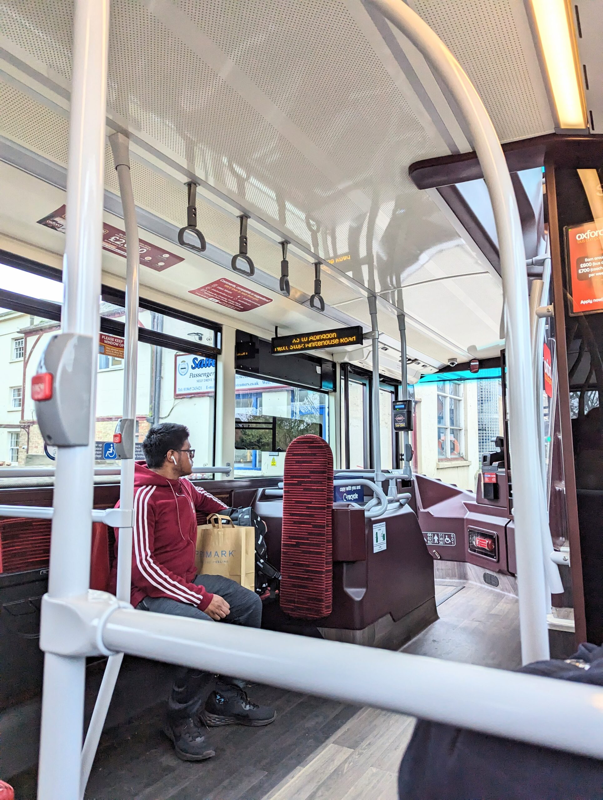 My taxi arrived to take me to the railway station and I said goodbye to Derby. The train came in on time and was zipping along the two zip-wire rails to Oxford. From there the bus outside took me into the city centre and as I got off that bus my next bus rolled up behind it.