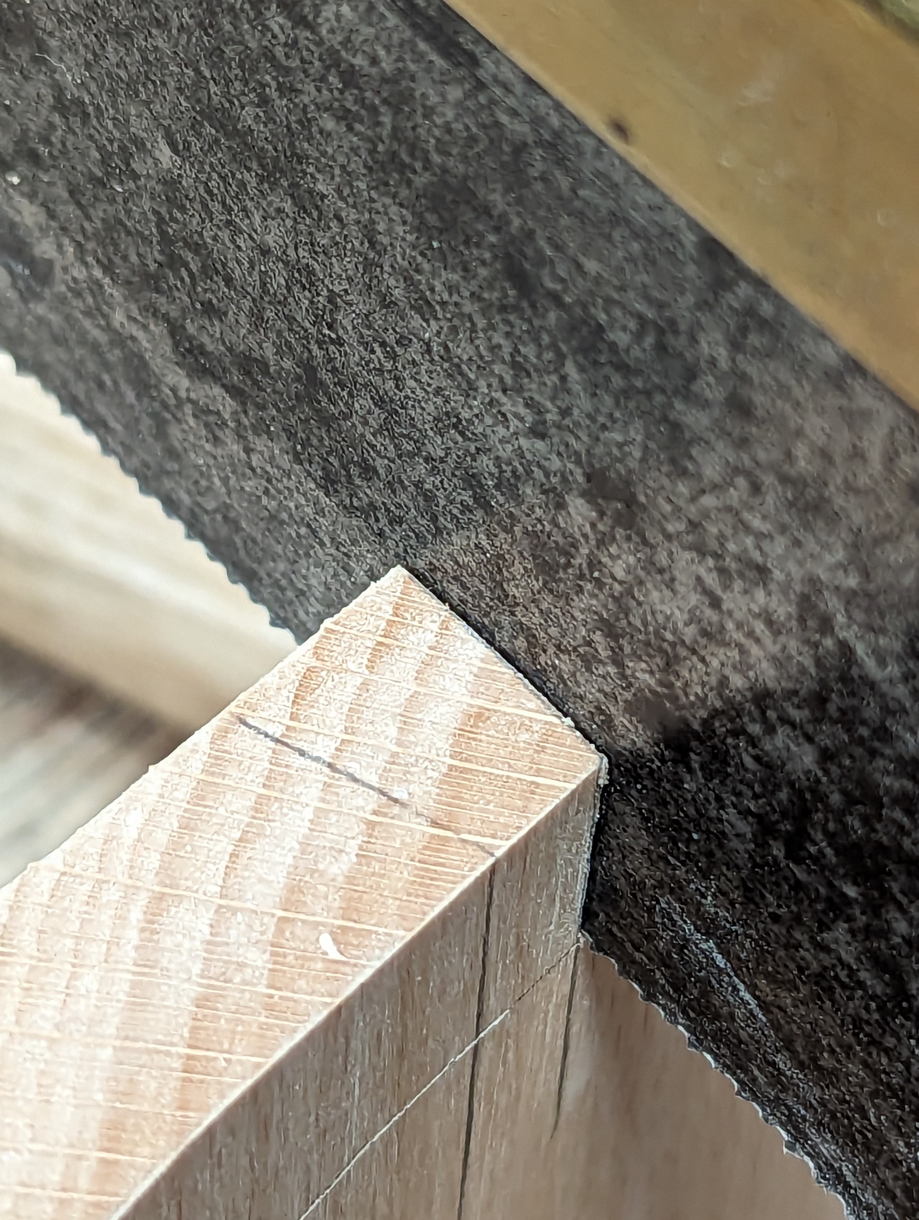 Understanding the toothing of meeting surfaces to joints, of course, means that we need to saw accurately in our cutting tight up to lines and keeping to any angles used in the joinery so that those surfaces do indeed compress evenly and the fibrous surfaces mate well. This strikes apprehension in this new to working wood because they find this requirement more challenging but are quite confident about creeping up on the final levels. Indeed, some advocates eschew off-the-saw advocacy but not for any of the valid reason I give here because, well, they just never thought of it. Of course, 99% of the woods we access will saw and give excellent toothing so why not just go ahead and use whichever we prefer between the pencil and the knife? As I said, the knife is intolerant. We tend to cut right up to this knifewall but then find the recesses are actually too tight for some really dense-grained hardwoods like ebony, rosewood and several others. These woods are not comprising, not absorbing, inflexible and stubbornly resilient. These are the hard woods to work with to get gap-free joinery with. The knife tracing around the dovetail to establish pin positioning results in absolute cut lines. The problem most often is the tightness of the joinery and especially is this so when you have many dovetails to form a corner. The pencil lines seem more tolerant, more absorbing, more flexible and so on. That does not mean we should never use one and not the other but that we make our decisions based on out intimate knowledge.