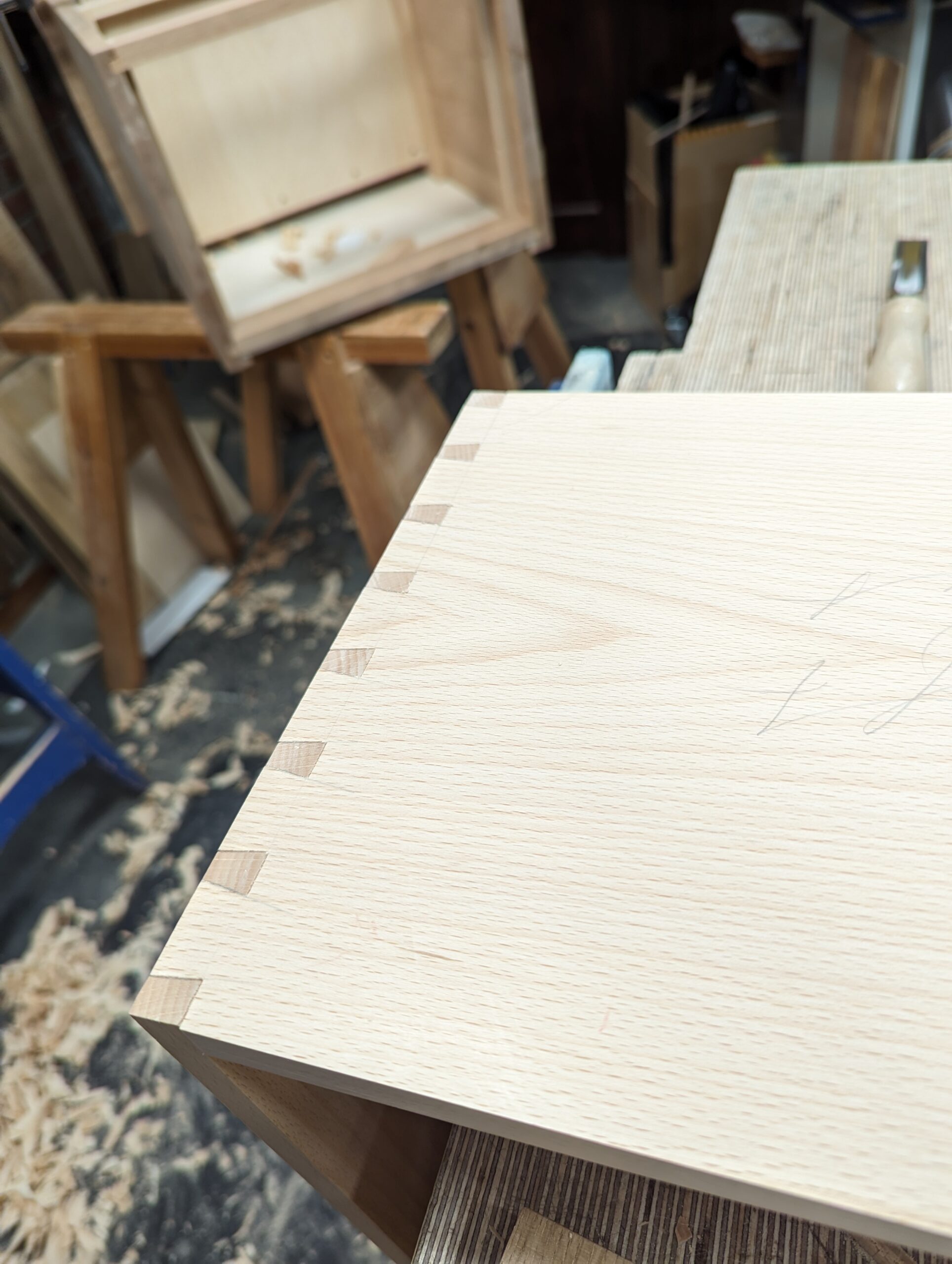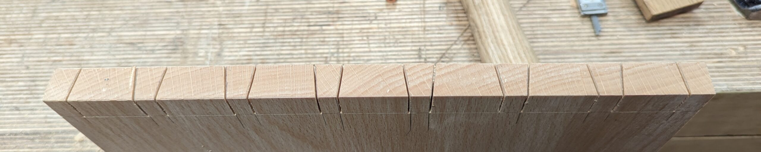 Working in the beech this past few weeks, planing the surfaces, inner wood and outer wood, sawing with and across the grain with various saws ranging from modelling saw to rip-cut handsaw and all in between gave me a wide range of different feelings and these were not at all experimental but real work. The number of knifewalls came to over a hundred and then the chop cuts from the chisels used came in the hundreds too. I gained tremendous insight to beech but that was because I was interested but not just interested. No, more than that. I was being governed by my obvious feelings, the sharpness of my tools, the distance in cuts from my delineation lines in pencil and by knife.