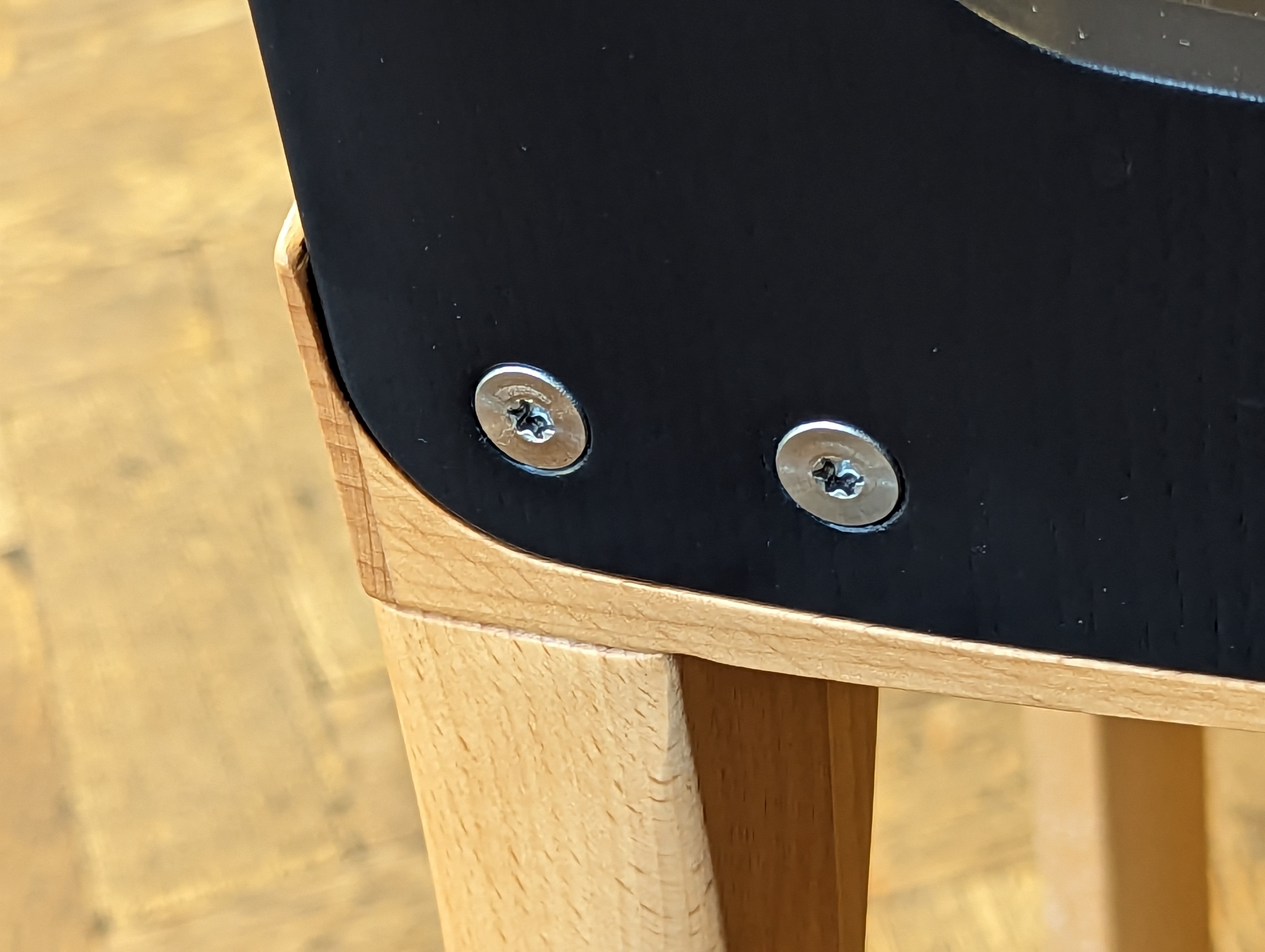 Lastly, the relief cuts in the underside of the solid seat minimise later distortion after manufacture. you retain the appearance of a solid seat above while ensuring the seat stays flat when atmospheric changes occur. See the poorly seated screw in the corner brace, that's it for securing the seat to the frame. Not greatly done but it works.