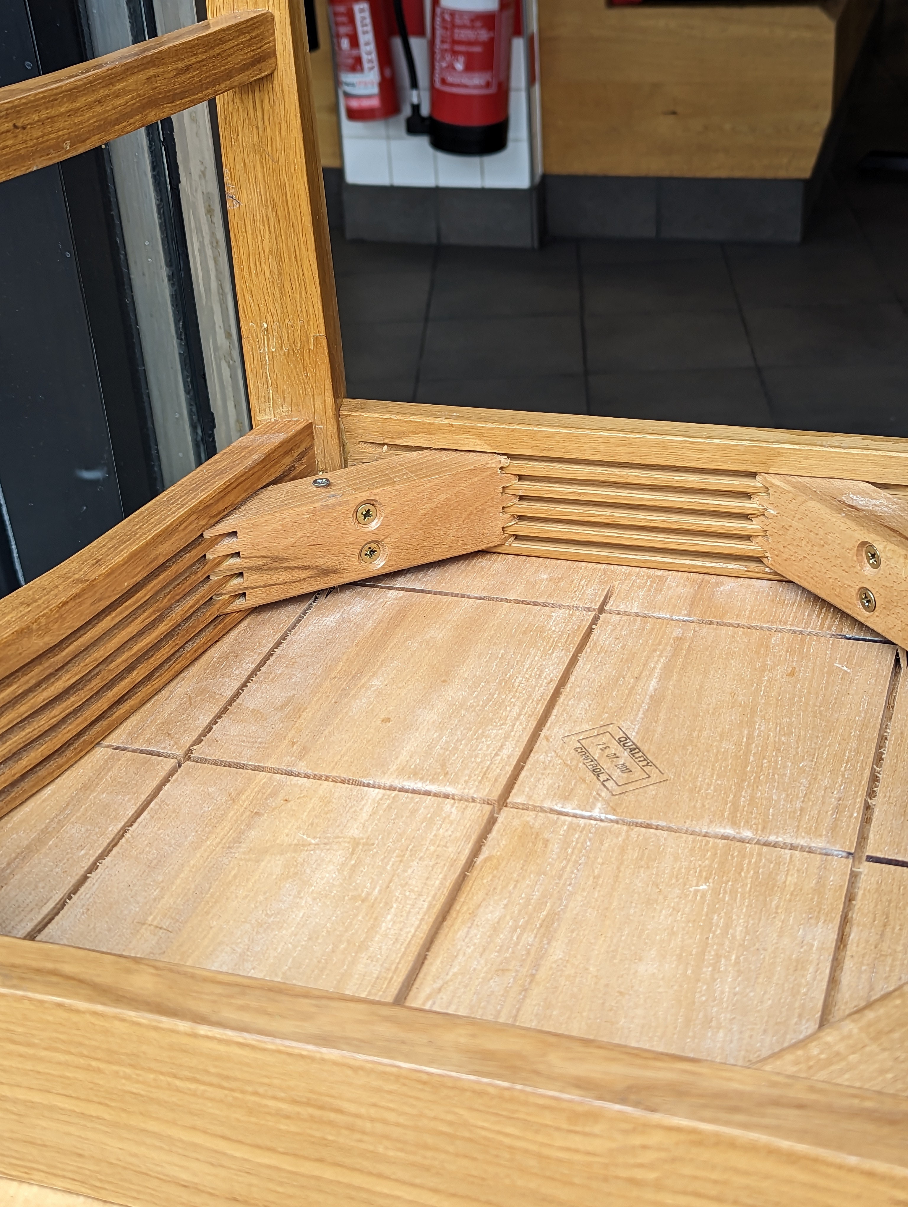 As I walk through the streets of Oxford, before the lunchtime food providers open their doors, I am always fascinated by the lines of upturned exposure of the undersides of chairs and stools used for cafe seating lining the windows. Things like this, along with art of every type, bookshops too, always stop me mid-stride. In this case, it's the ingenious multi-grooved spindle-moulder cuts in the backs of chair rails just to align the corner bracing that creatively destresses the dowelled intersections of the rail-to-leg dowelled connections. It's just plain clever.
