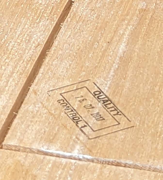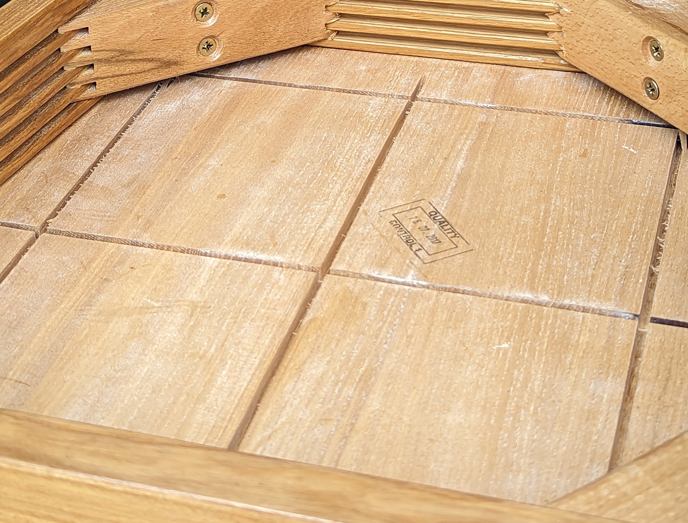 The manufacture and assembly of this solid hardwood chair will be no more than a ten man-minute-involvement in manufacture time if that. The chair shows no physical deterioration and the date stamp clearly shows a six-year span since its manufacture.