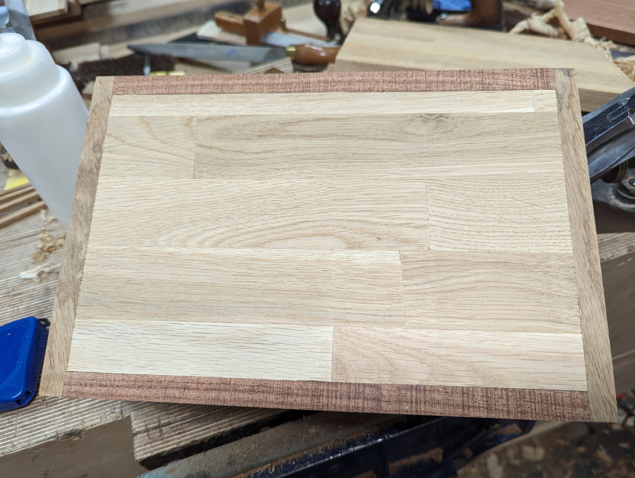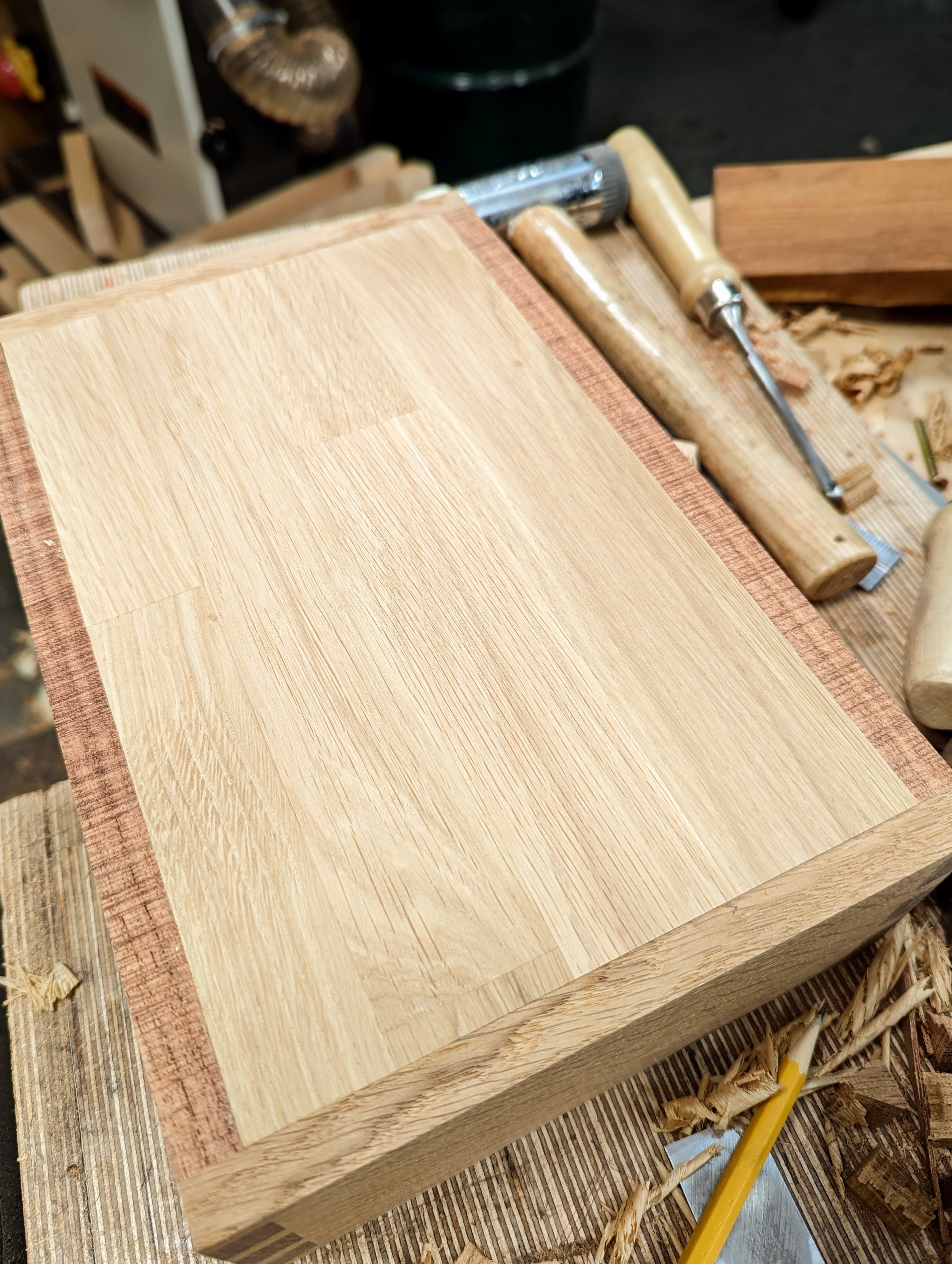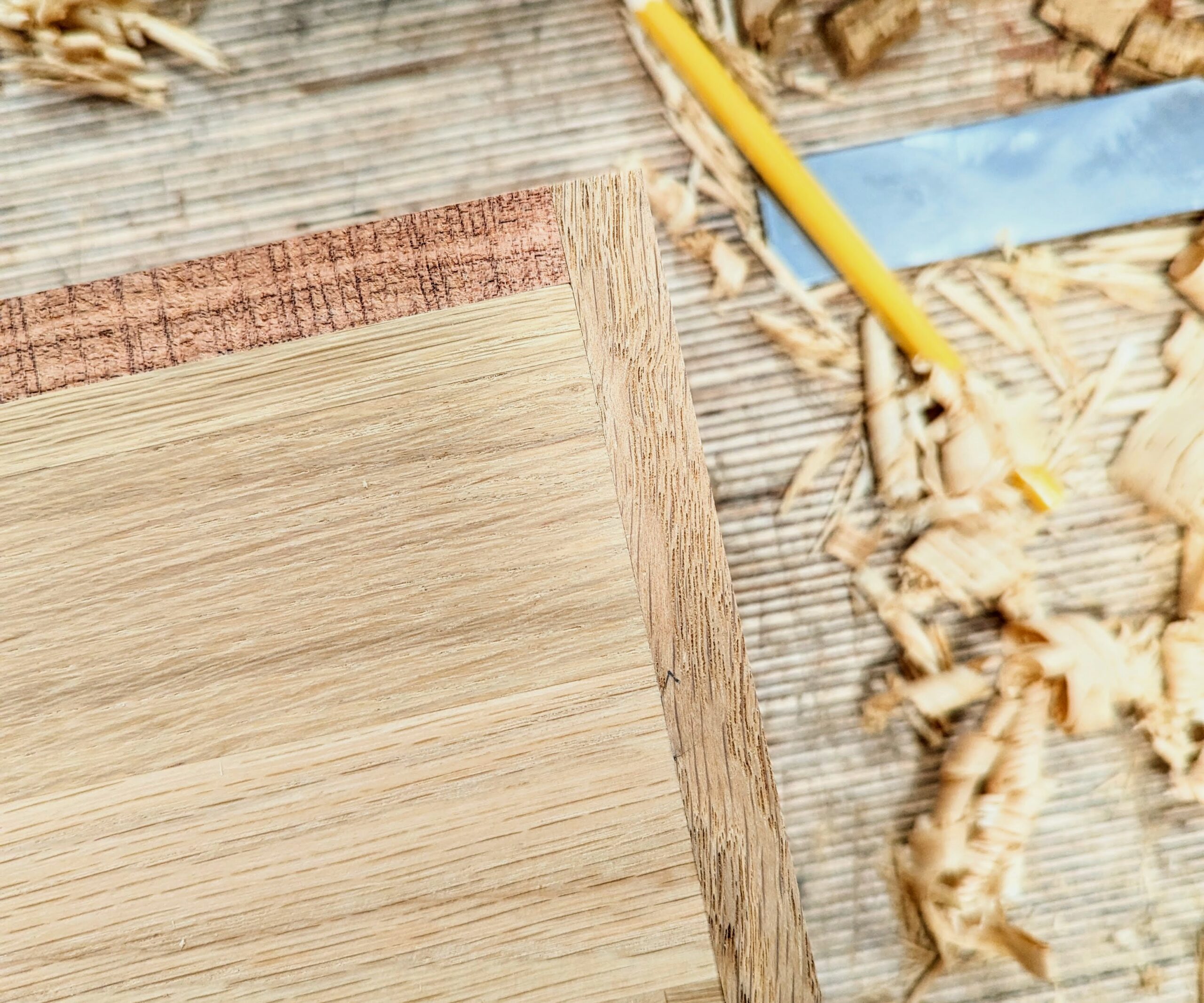 Fit the lid to the opening in the same way as the bottom with no gaps all around. We will plane the lid down by 2mm, 1 mm each side, but this we will do after we drill for the hinge screws.