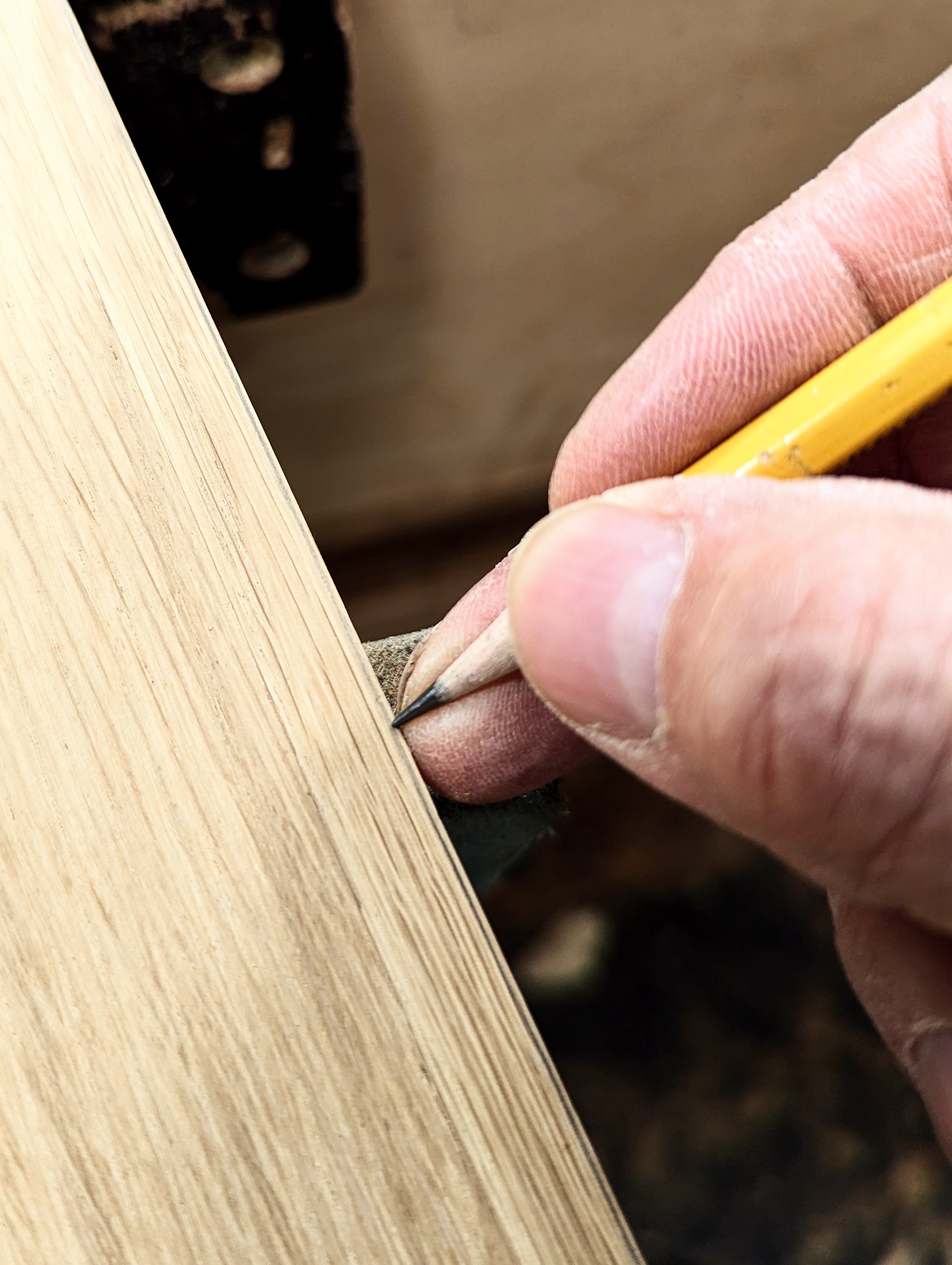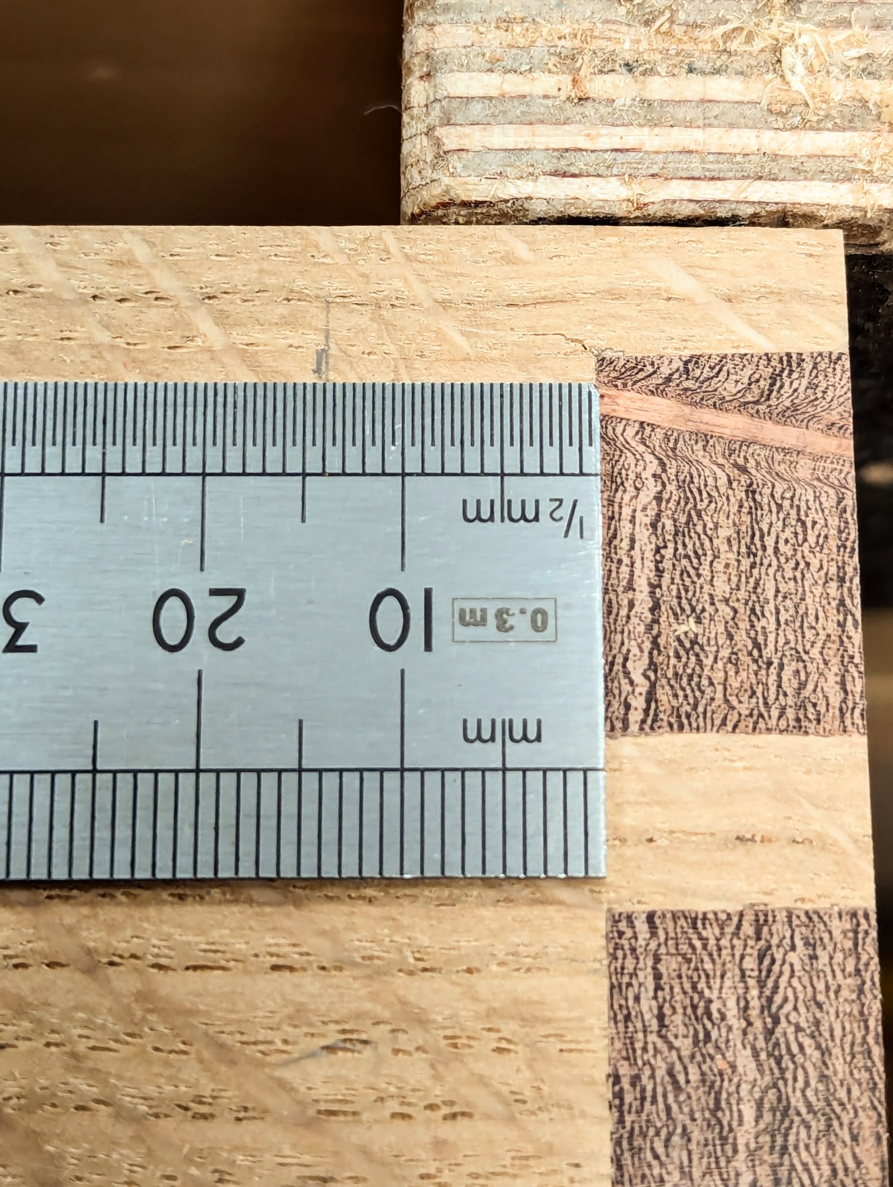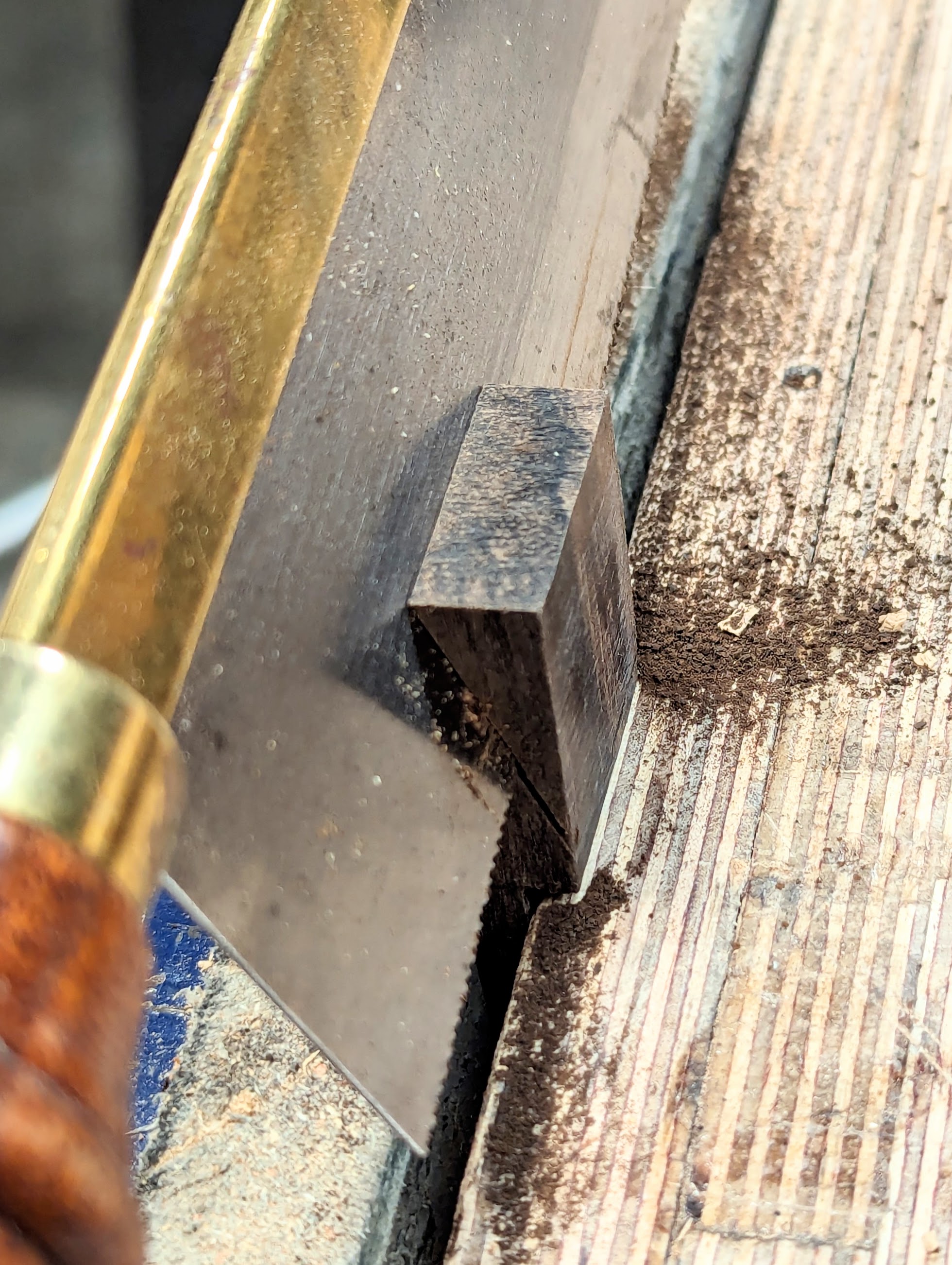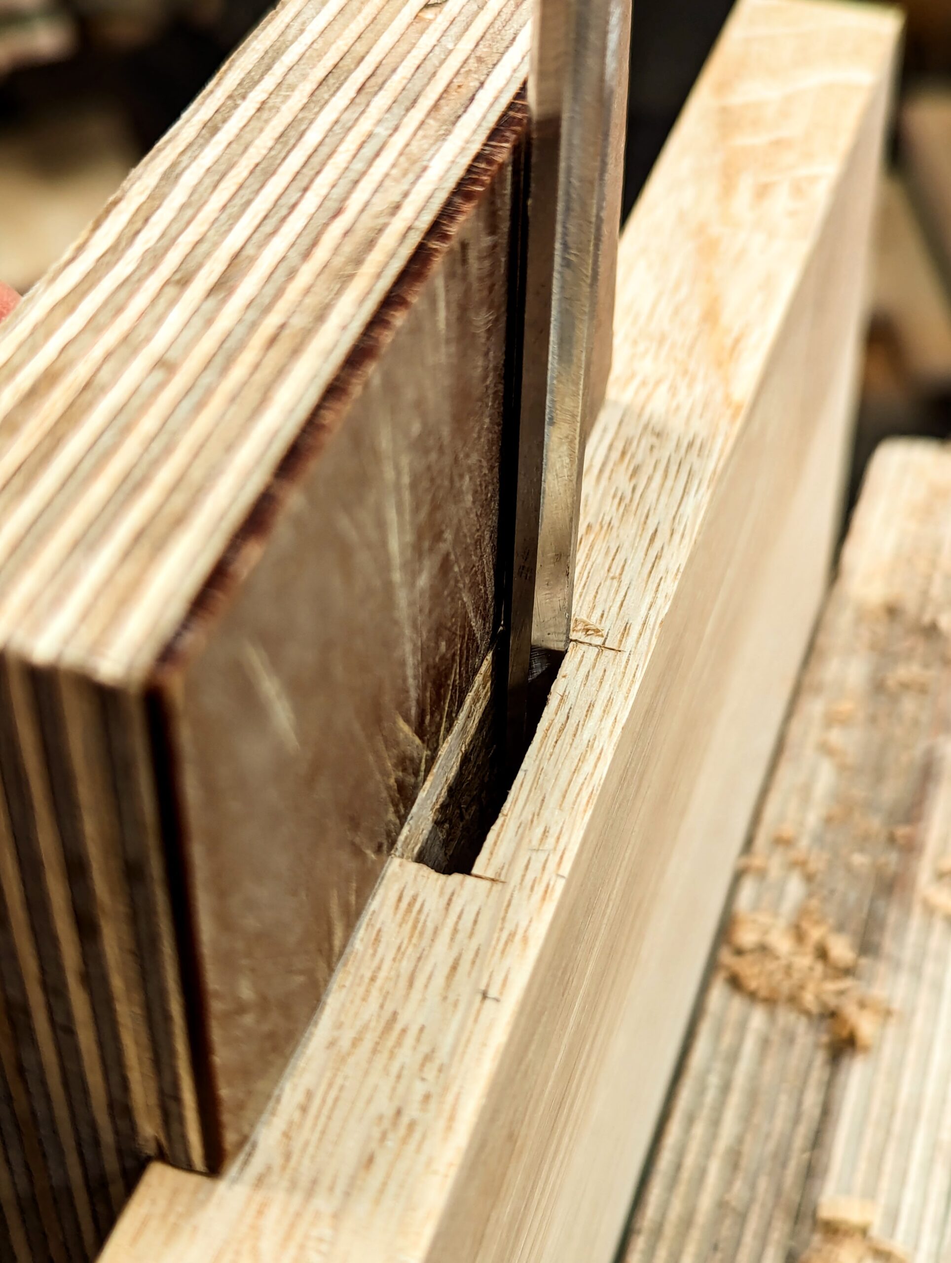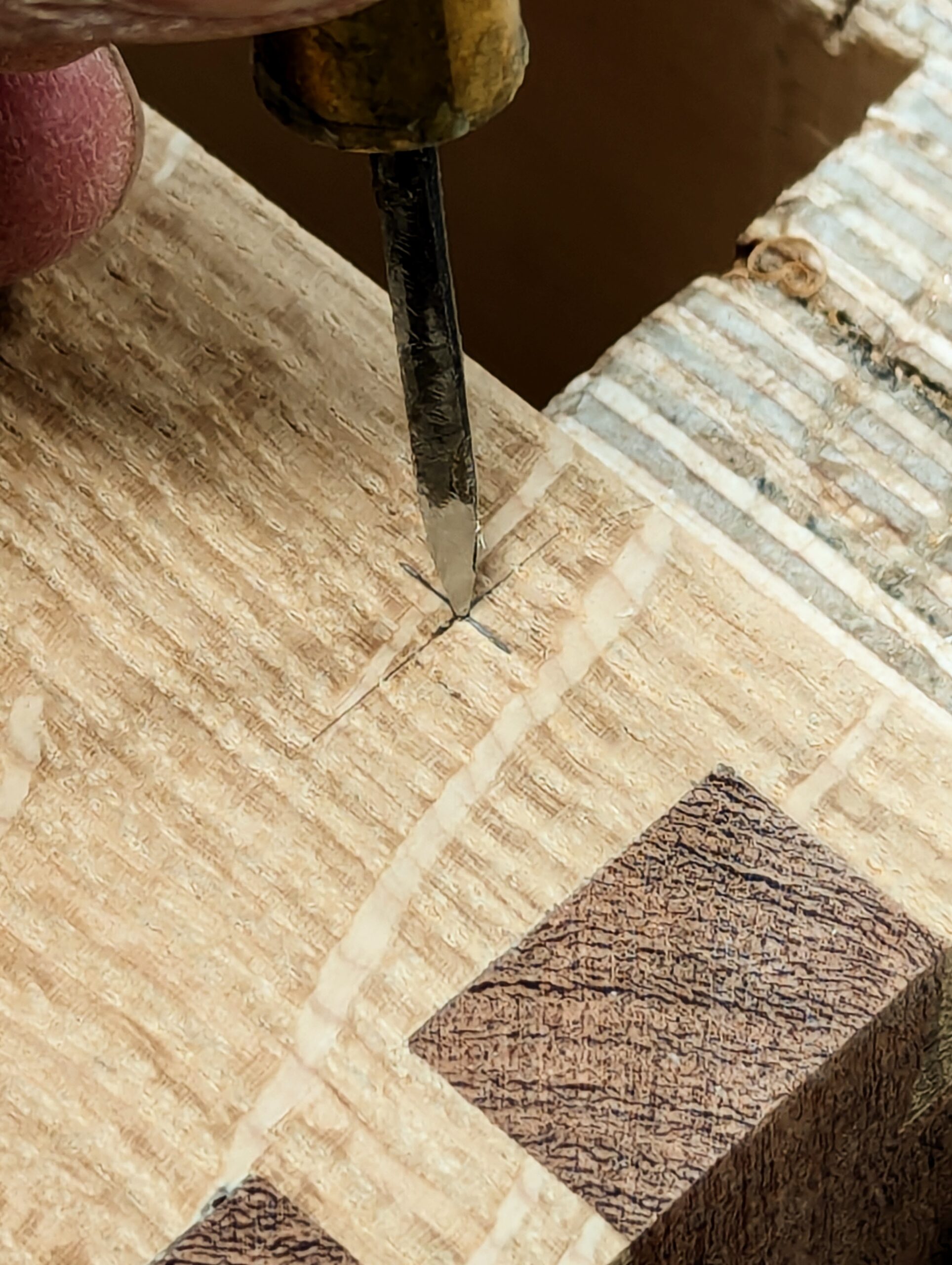 Lower the lid onto the handle to establish the position of the recessed cut you will make next. Use a 1mm shim of plastic (a card scraper is usually around 1mm too) to mark each side of the handle with a sharp knife. You will saw to this knifewall next.