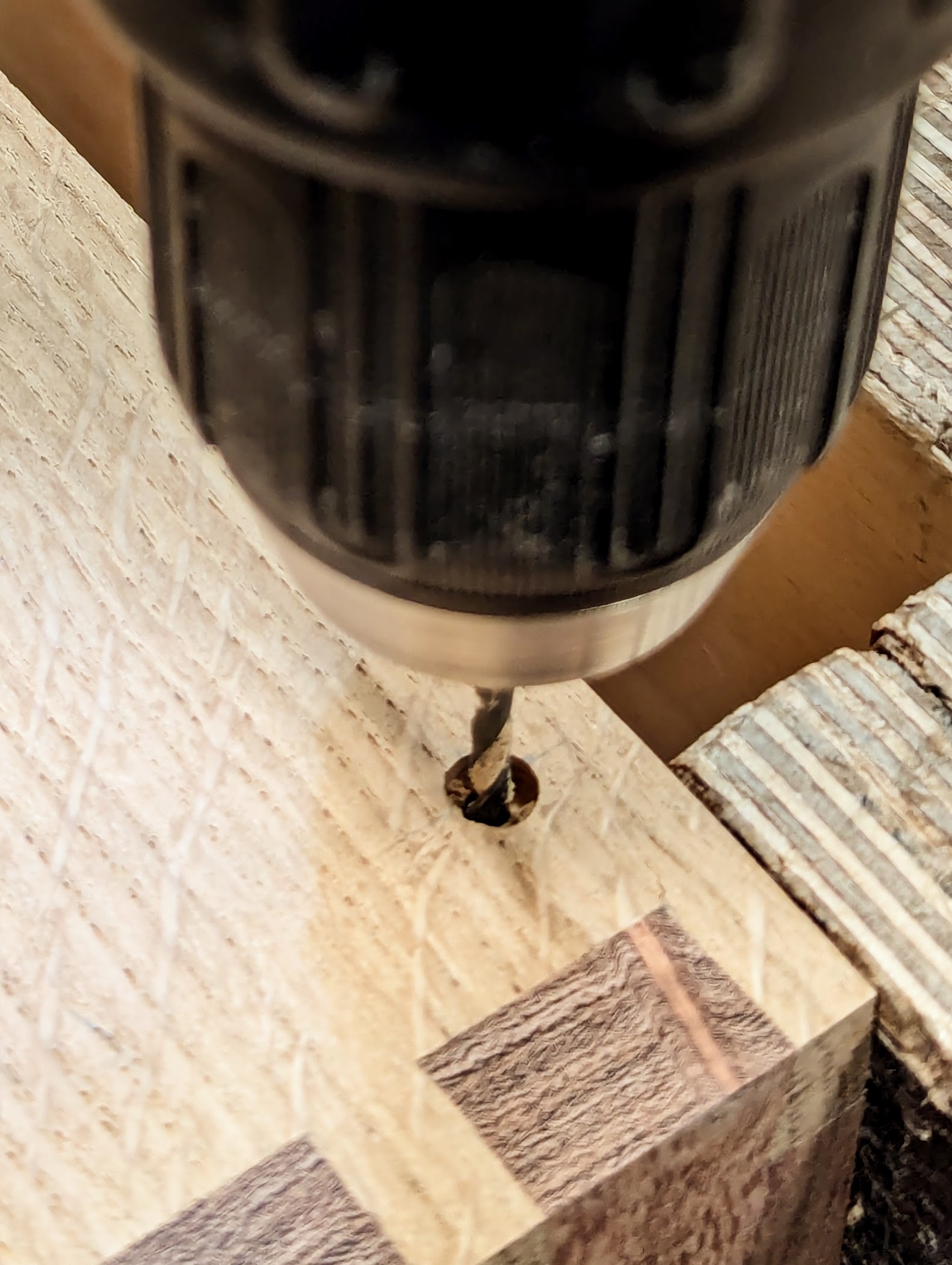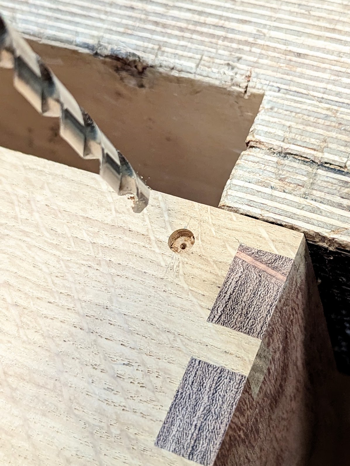 The next hole is for the box only. This hole will clear the shank of the screw close to size so that the screw rotates freely in the box part. I say close to, but dead-sized will mean there is no slop in the lid movement. But if it is too tight there will be the possibility of friction binding on the screw and the screw gradually undoing the threading into the wood.