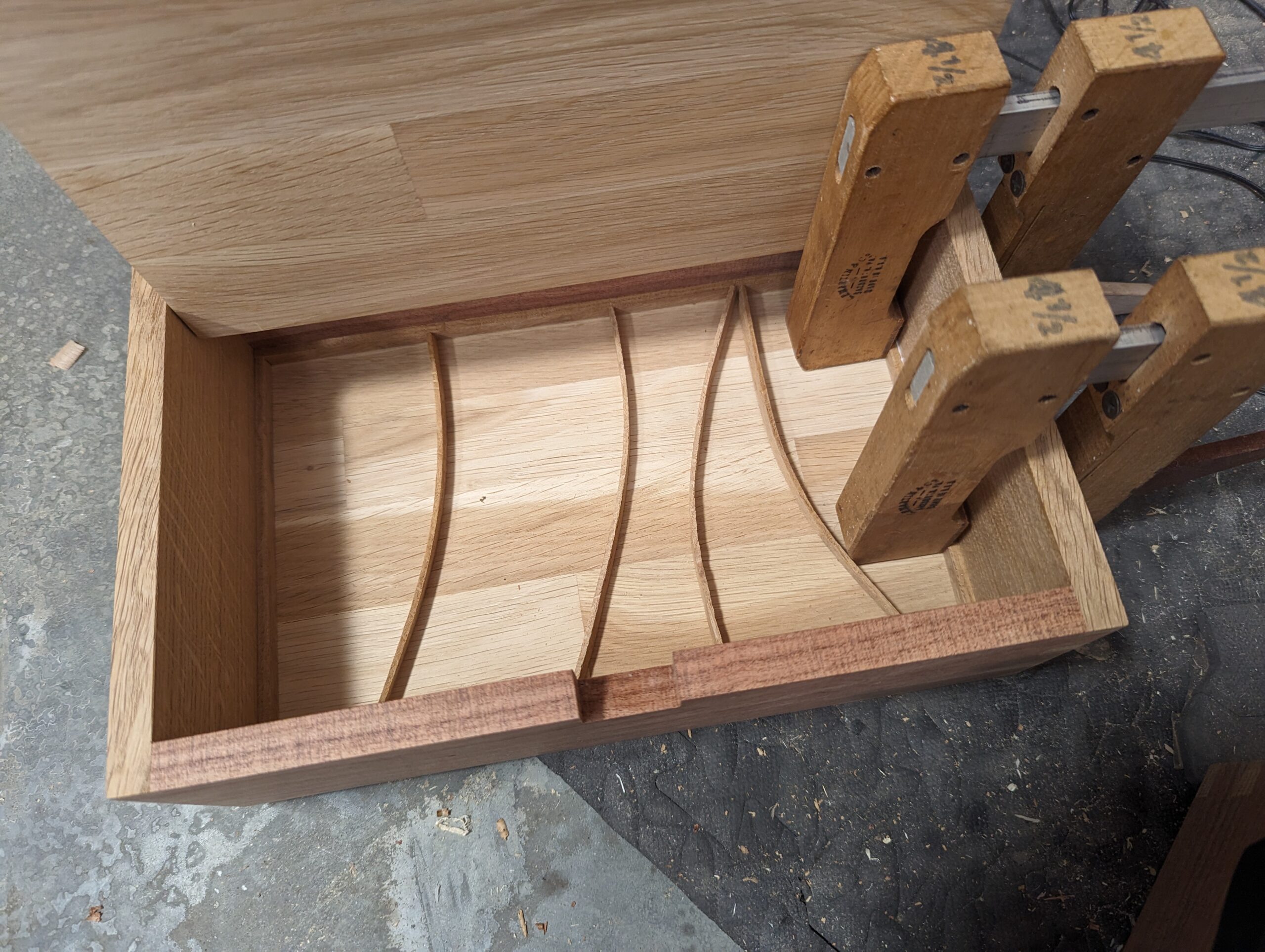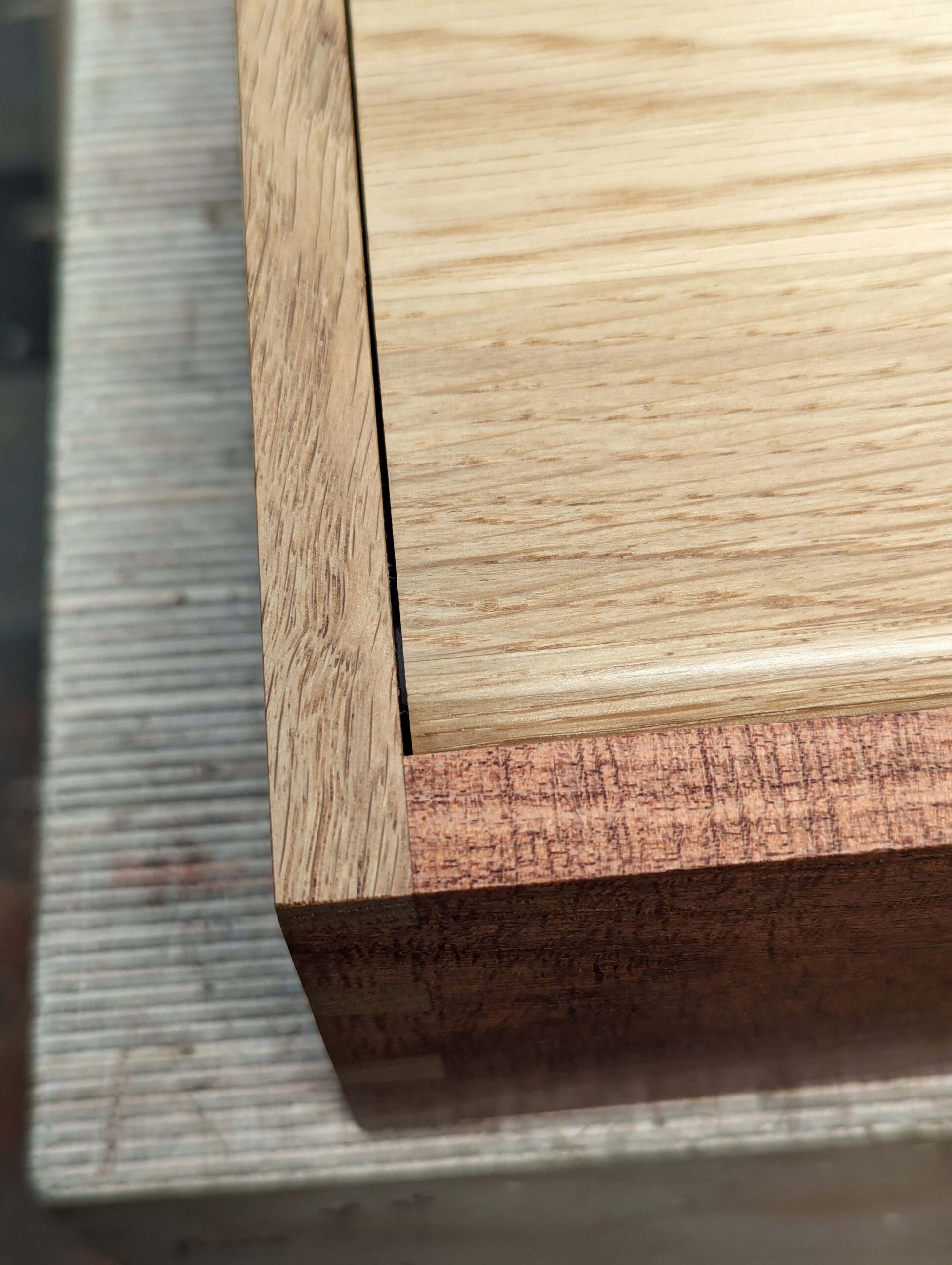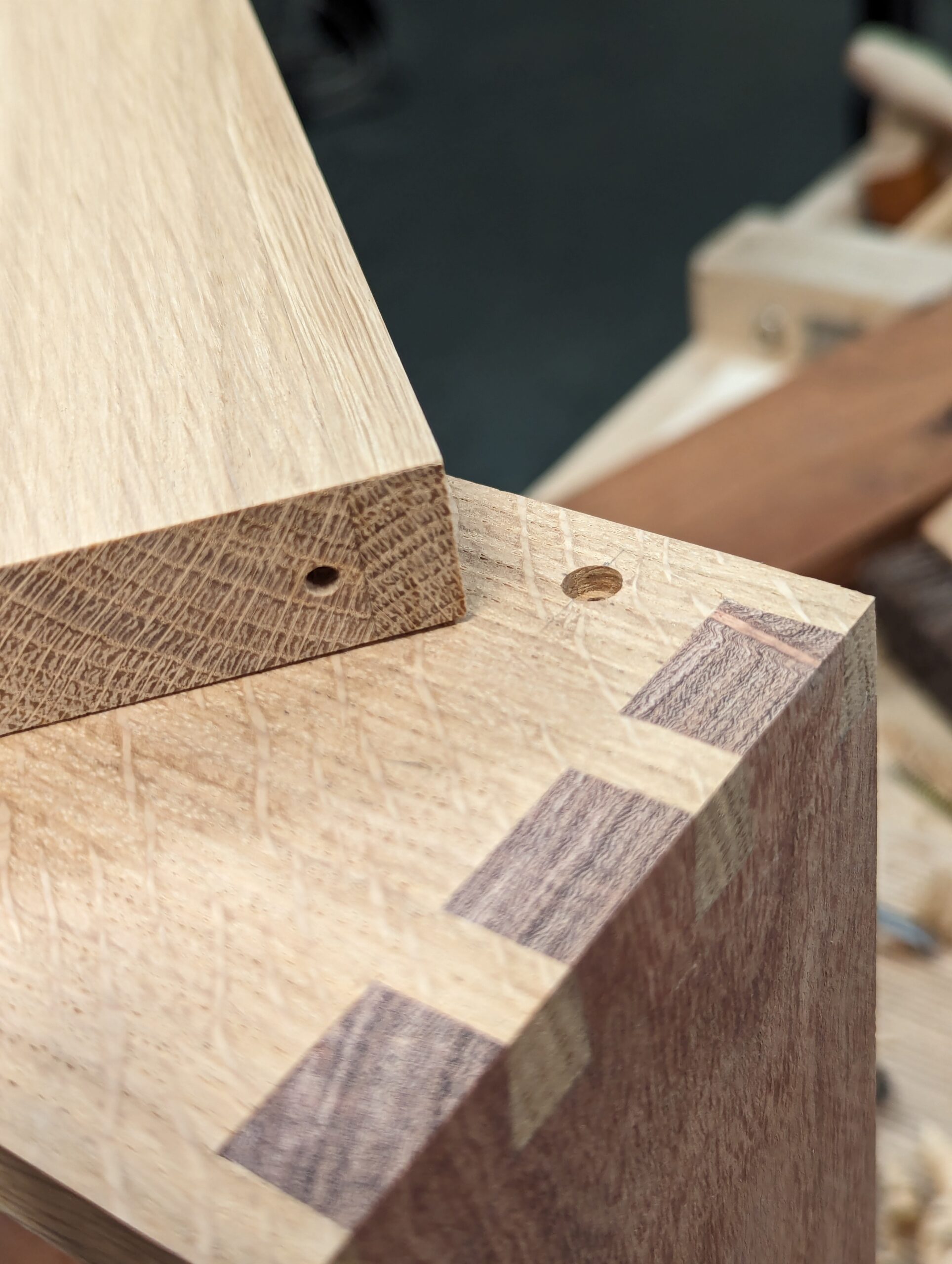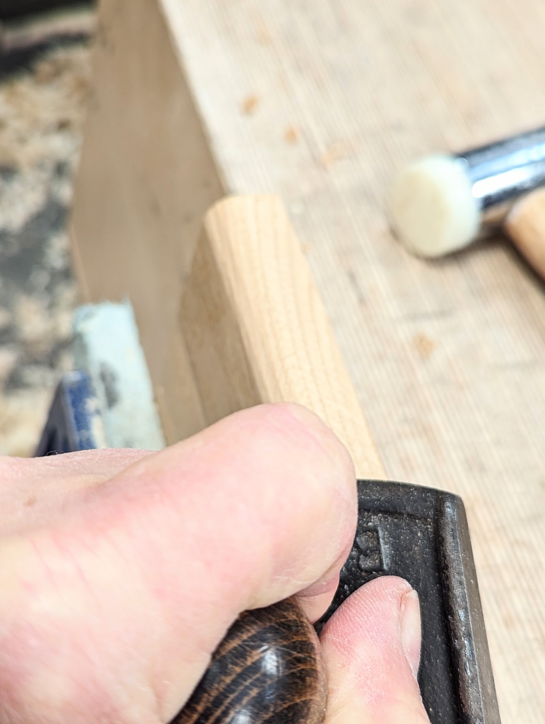The back, top corner (see pic above) will be planed to a quadrant with the bench plane following the reductions just made. By now the lid will fall in at the opening free side but it is good to try it at this stage so you can micro-adjust any discrepancy. Don't take too much off. Better to keep reinstalling and seeing how it falls back when fully open. I aim for it to be self-held when open but not much more than 10º or so from perpendicular.