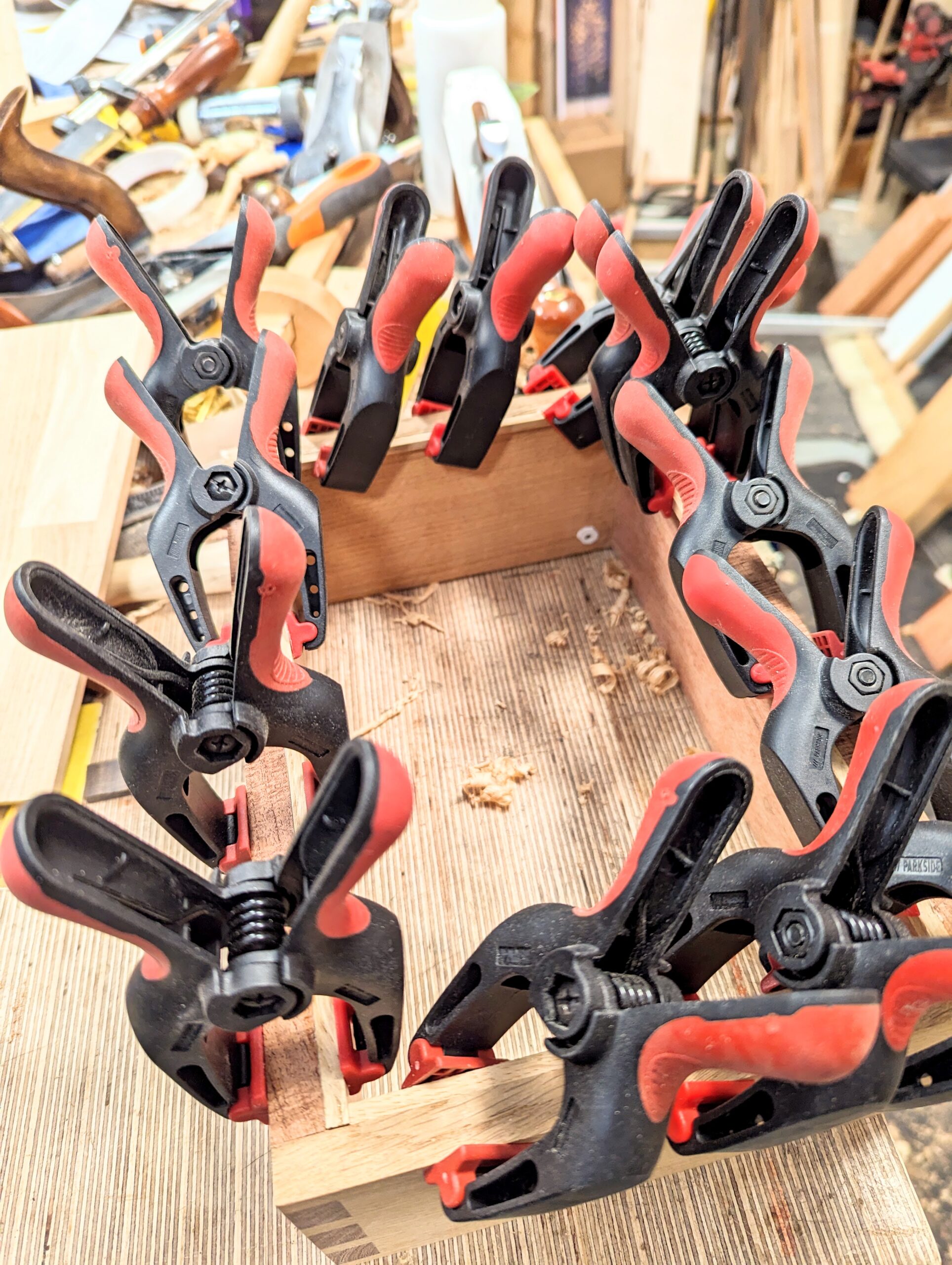 . . . and it's already fitted. We glue 3/16" by 1/4" strips to the bottom rim of the box first. Use spring clamps (above) for this. Best to leave them for a couple of hours for the glue to dry.