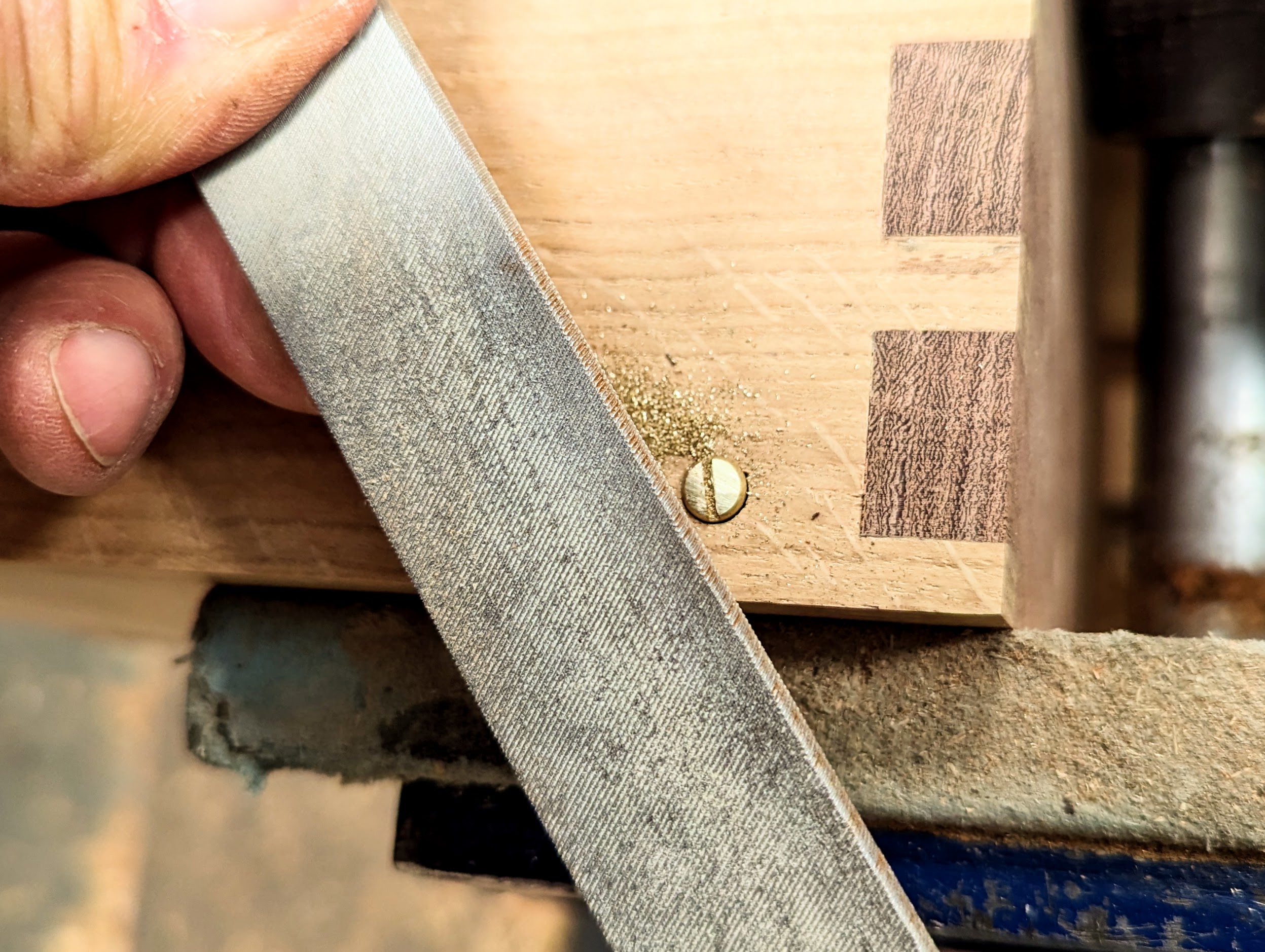 We are now able to drive the screw to test drive the fit, etc. Stop turning just after the slot of the screw is a paper thickness above the surface of the box side. It's a great idea to use some paste wax on the threads as this will reduce stress on the screws and the wood. Do not file the head down yet. `We still have much work to do.