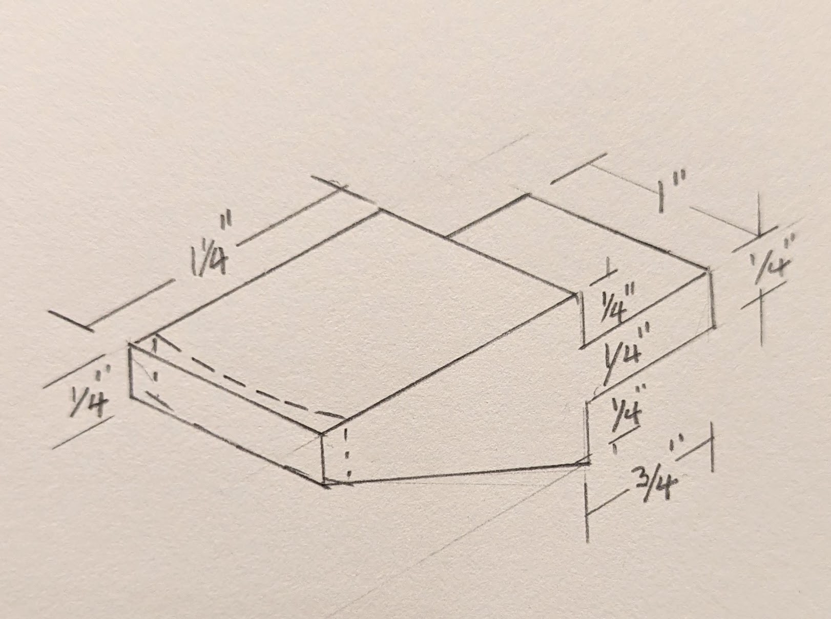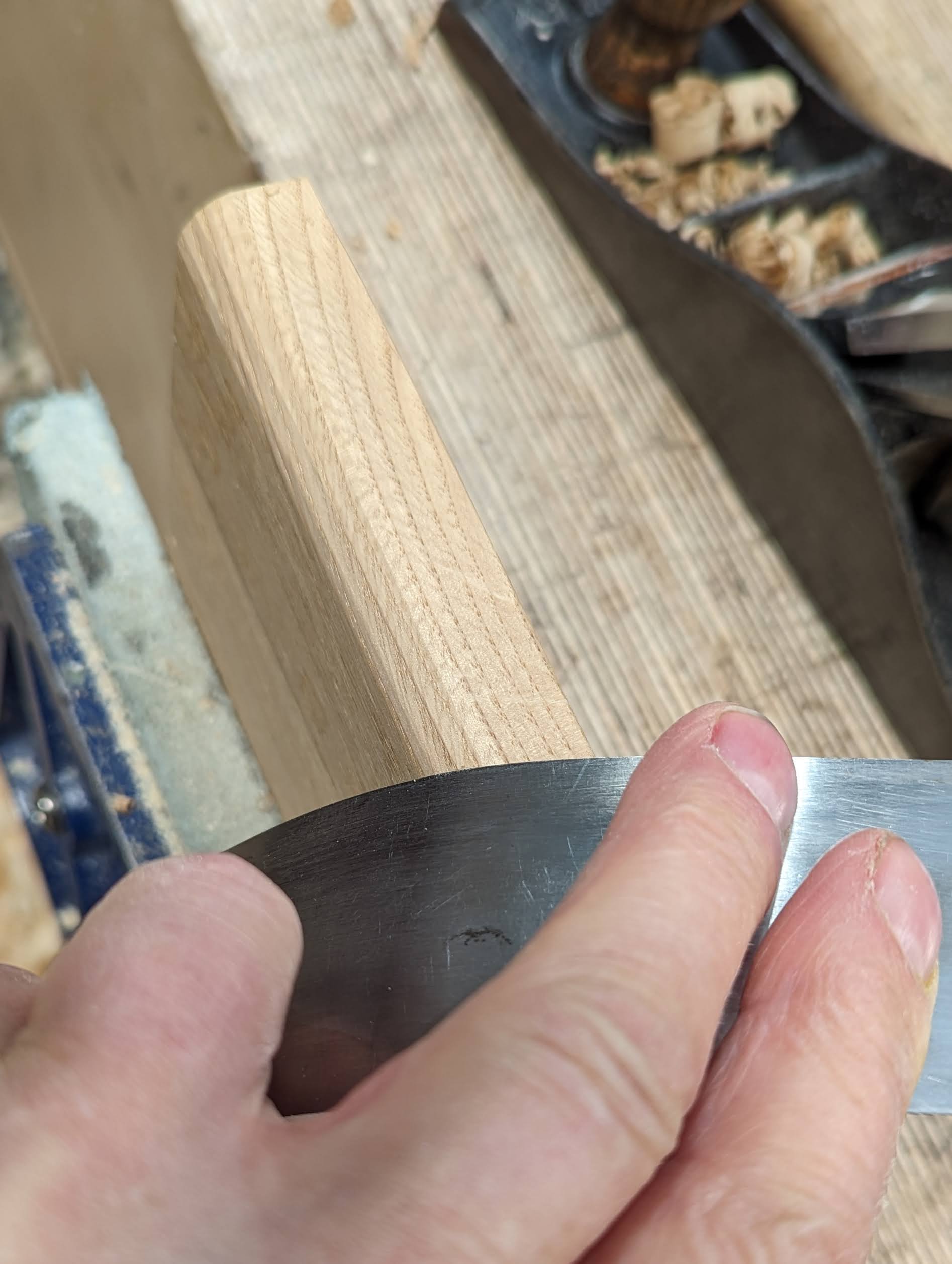 Shape the handle as per drawing using standard tenon-making procedures. The slope to the underside is best sawn with a dovetail saw and then trued up and refined with a Shinto saw rasp (or a plane if confidence levels are good) followed by a flat file. The radius I used for the fore-edge is 2 1/2".
