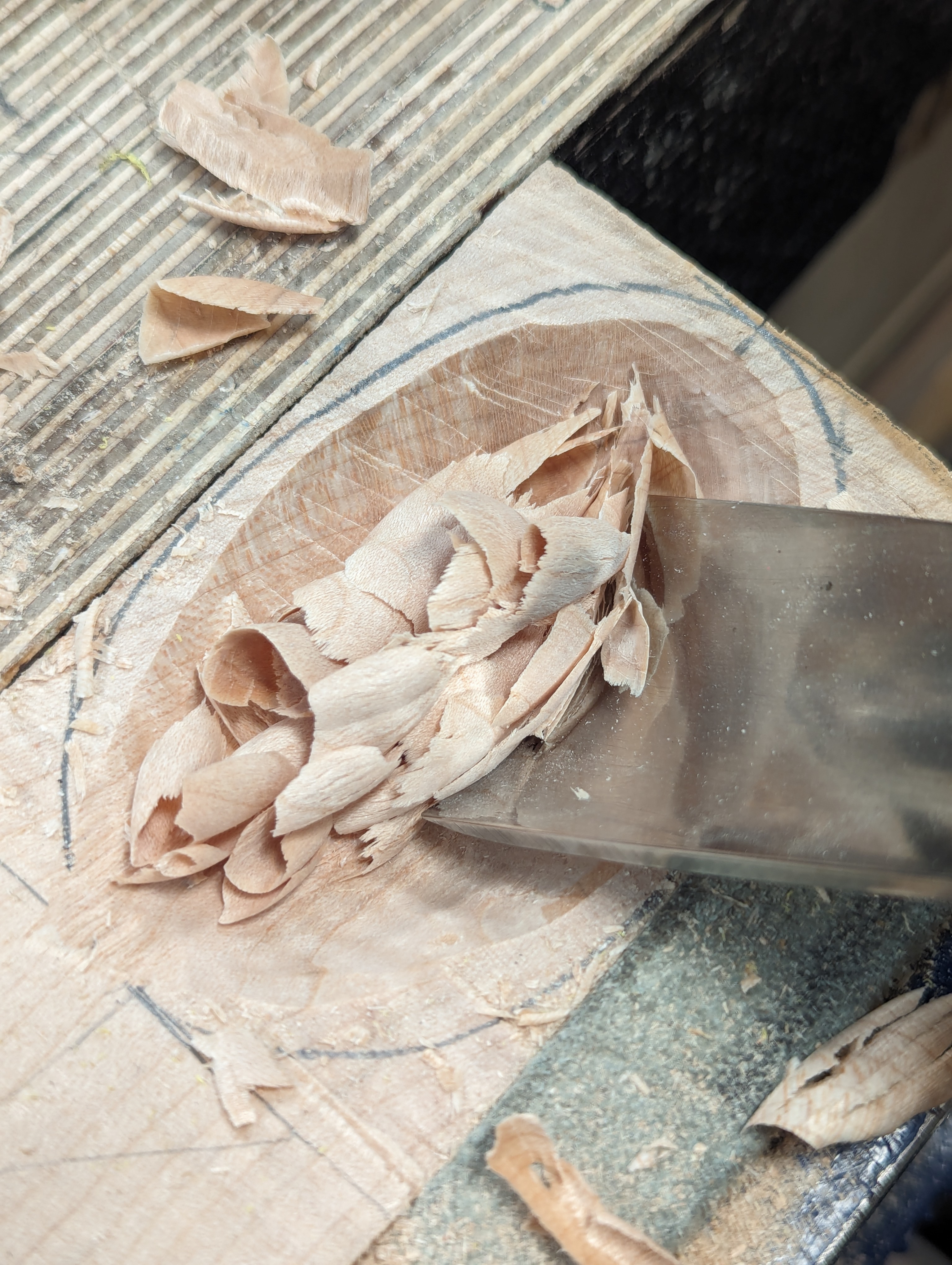 I might take an hour to scallop such a hollow but mine this week took me twenty minutes to go from flat unworked wood to its final depth and smoothness. It worked well enough with my two freshly sharpened gouges and I've made three with no need of more sharpening. The two gouges I used are a 38mm #7 and a 25mm #8. without a second gouge go less deep or more deep and wider. I used a panel saw initially to rough down the bulk of waste wood and that was straightforward. The shaping of the outside came from a spokeshave and a rasp and for further refining, I relied on a card scraper shaped to smooth out the scallop.
