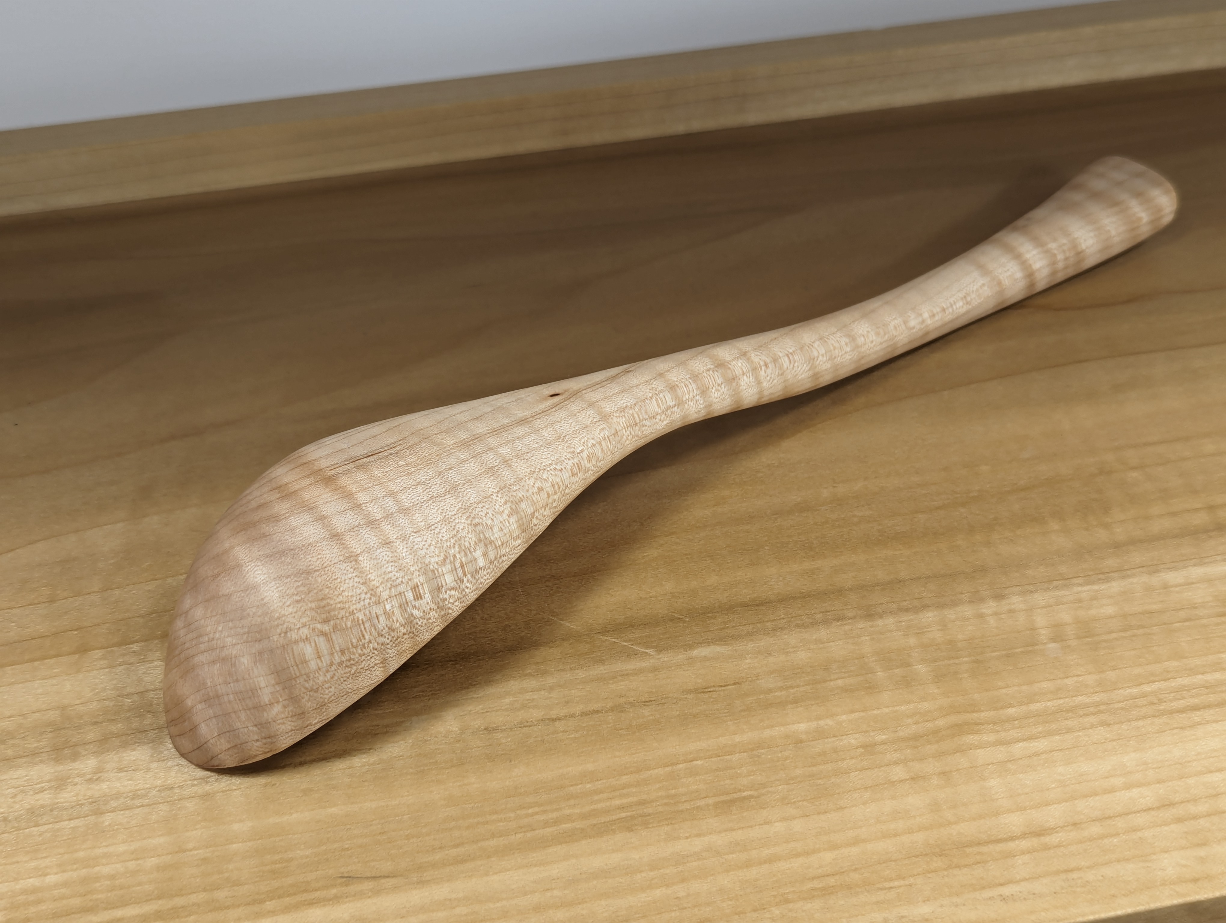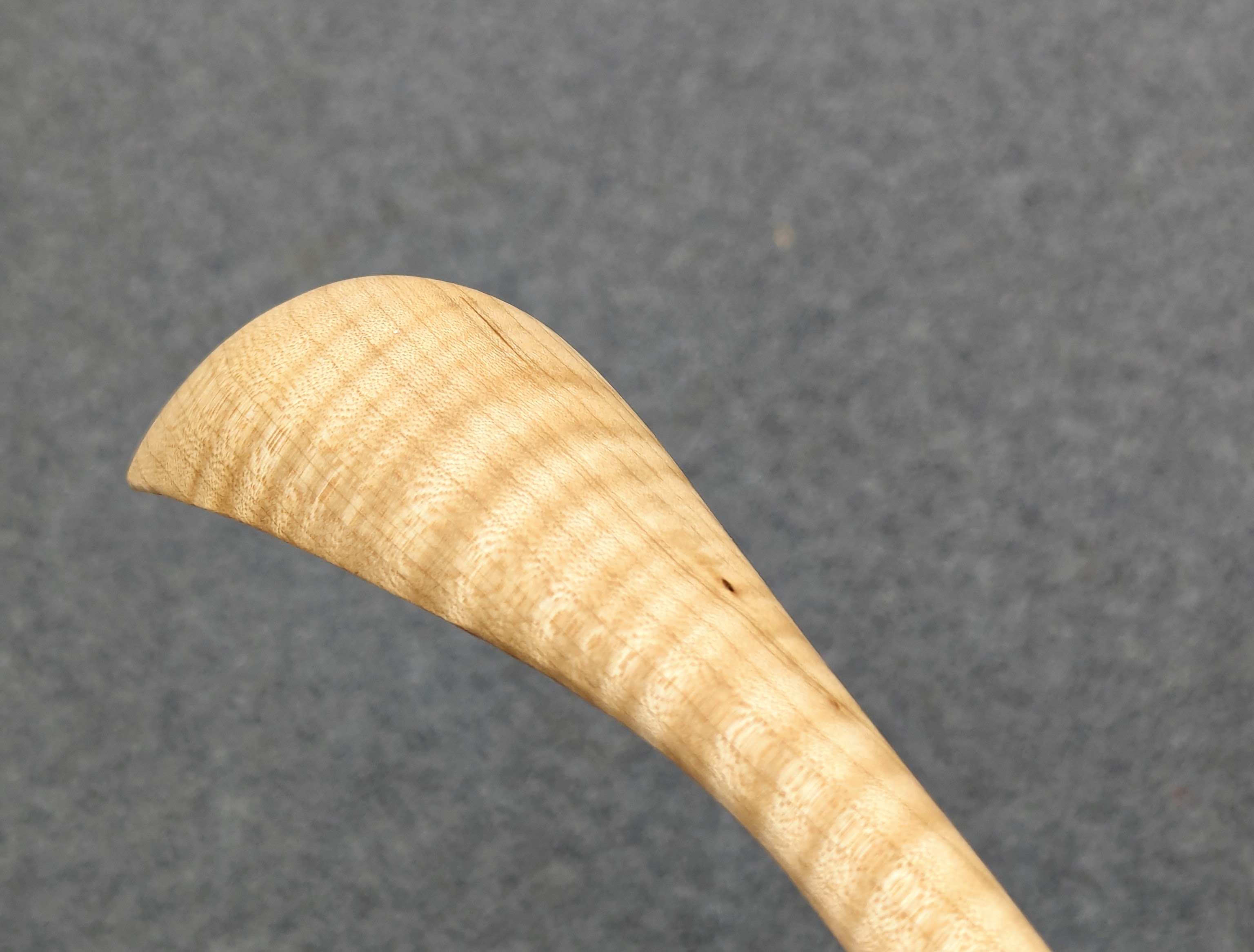 It's the scallops that cause short grain as they are carved from the solid and not bent as some think. So too the walls or bouts of the violin. These curved parts measure as little as 1.5mm in thickness and its curly-grained or figured wood that creates the wholly essential walls of resistance under the great stresses under the straining that comes from the four taut strings and the playing of the instruments. The neck too is under tremendous stress. With all of this in mind, I felt the neck and bowl of the ladles needed similar consideration.