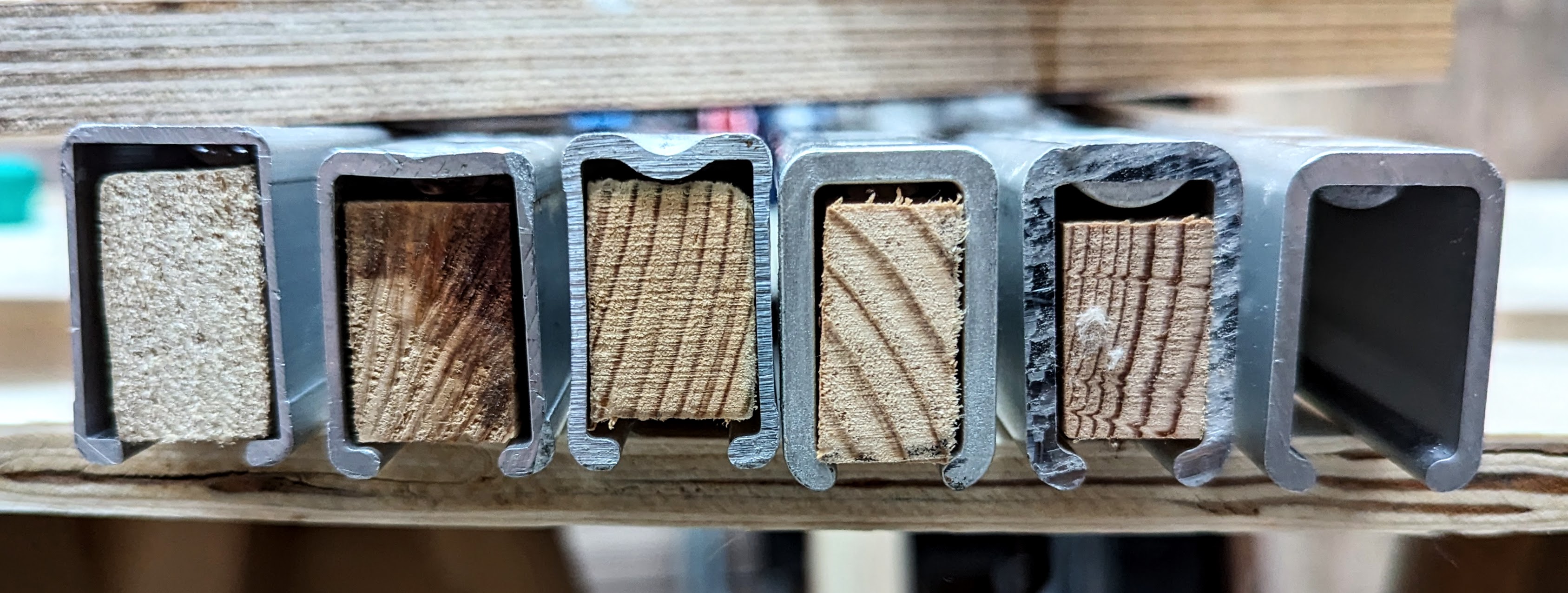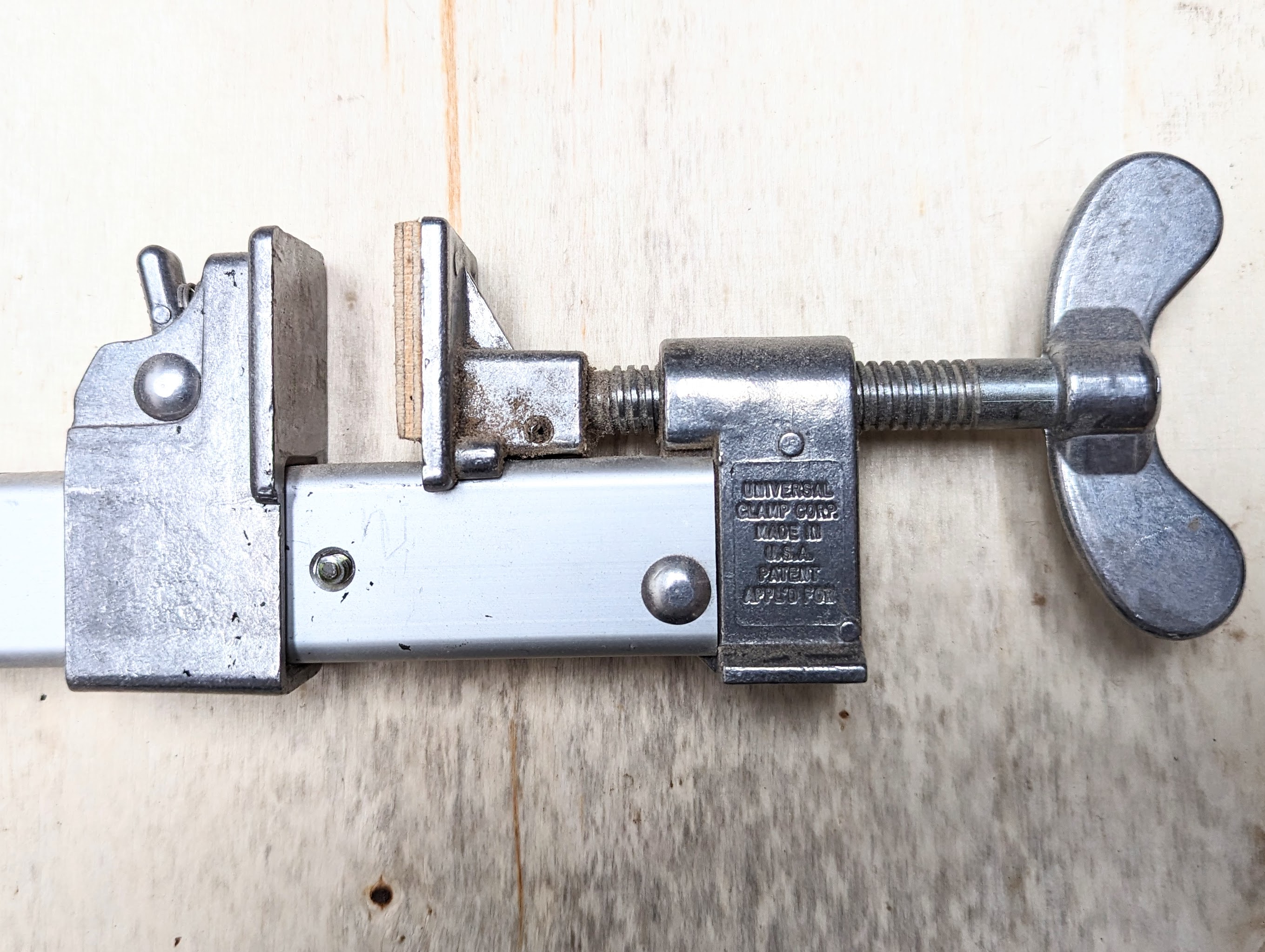 The clamps I now use and prefer to all others are something of a good example of reverse progress relying, like any good lie, on standing in truths stead. From the outside these clamps on the outside all look similarly made. The makers kept the outer the same but shrank the insides by reducing the thickness of the walls. This was done in the interests of competetion, I understand that. There is no doubt that the original aluminium sash clamp with its extruded U or box profile was a substantial clamp––more than adequate for just about all of any woodworkers clamping needs. The Harbour Freight version and then many others too had similar-looking alternatives made but by shrinking the thicknesses of the walls by at least two-thirds and more: not all clamps are created equal or anywhere near. So too the threaded adjusters. The original Acme thread was substantively made with deep, square threads that were well made and accurately matched. Those that followed did not set the same standards and after a short while wear caused the clamps to jam and to bend under very little pressure. The three clamps to the right of the six below are substantially made while the two on left of centre are much thinner and the far left one resembles the tinfoil used in baking.