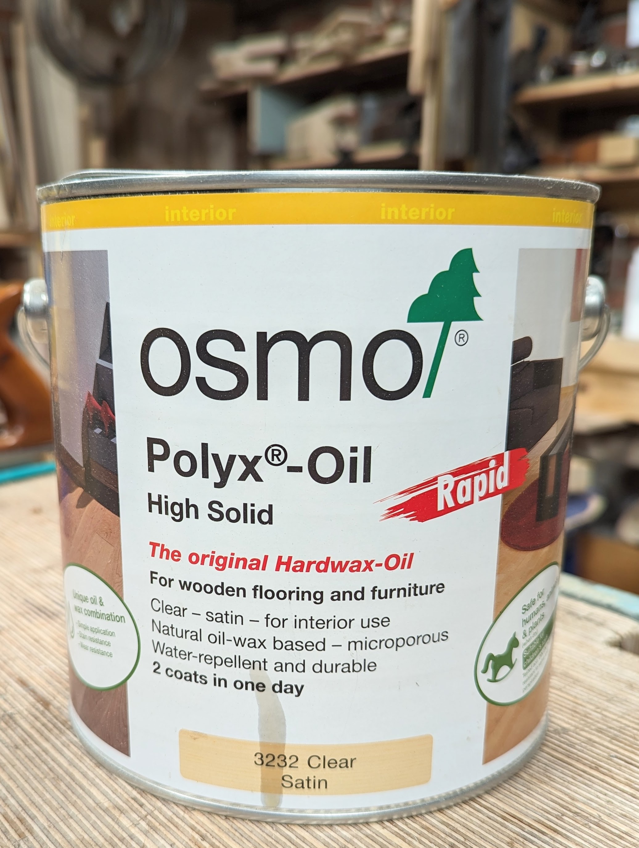 Osmo polyx hard wax-oil rapid satin is a clear, fast drying, finish suitable for everything from wooden floors and can also be used on Cork and for the treatment of furniture surfaces (i.e. Table tops). The finished surface is durably tough and hard-wearing and is water-repellent and dirt-resistant. The finish is resistant against wine, beer, cola, coffee, tea, fruit juices, milk and water etc. What the etc is I don't know. When dry according to DIN 68861 - 1C (German industrial Norm). dirt can easily be removed without trace. Renovating, even partially, is easy. Just clean and re-treat worn areas: no sanding, no repair marks, no removal of previous polyx-oil finish. The wear resistance of floors treated with Osmo polyx-oil even exceeds that of conventional parquet seals and varnishes.