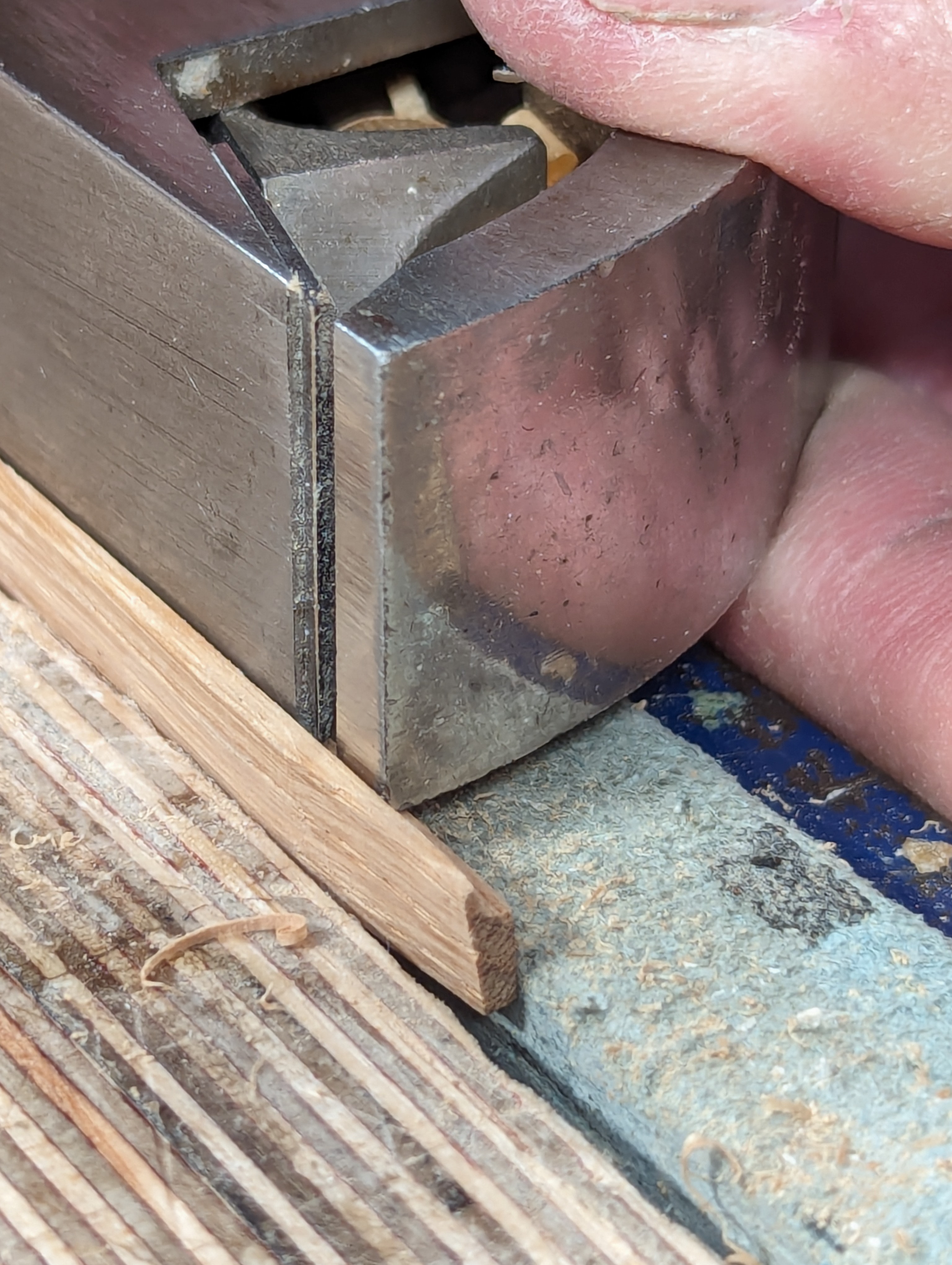 The wedge best used for retention is a 1:7 ratio but it can be any angle you like because retention is not reliant on the wedging action but the vise you install the assembled unit into. The wedge shape is more used as a stop-and-secure element to help as you install the unit in the vise rather than a friction fit hold. Also. the parallel saw kerf to house the card scraper in can go past the support surface. That way you can adjust to anythinness you want and you can incrementally change the settings simply by loosening the clamps. That said, once the scraper is installed, and when you have used it to thickness your strip, you can either tap the end of the wedge for an extra shaving or two or you can move the strip you are thicknessing to the outer edge and press the scraper plate lightly with your fingers and pull the strip at the same time. Press the plate more or less or repeatedely for thinning further.