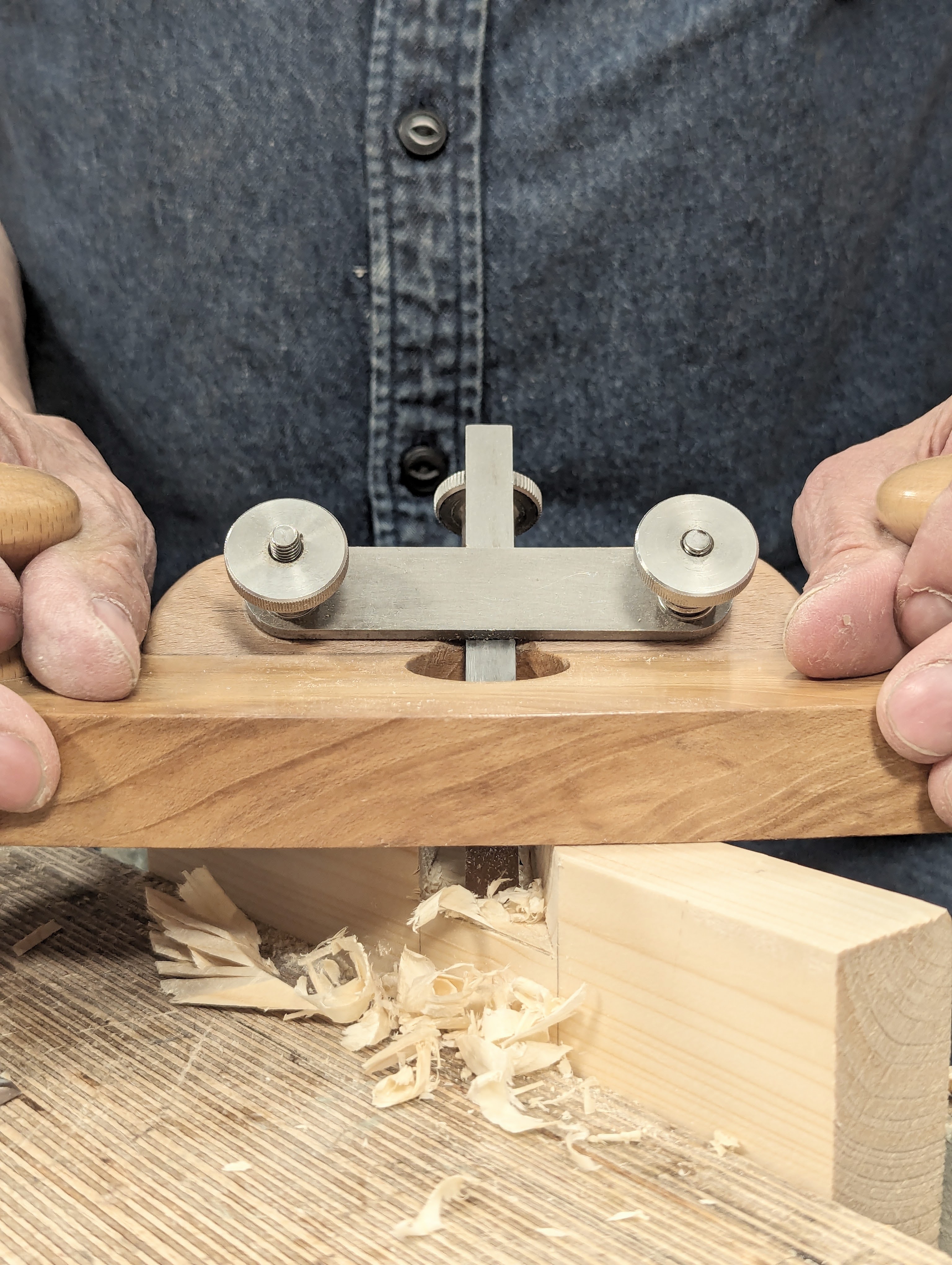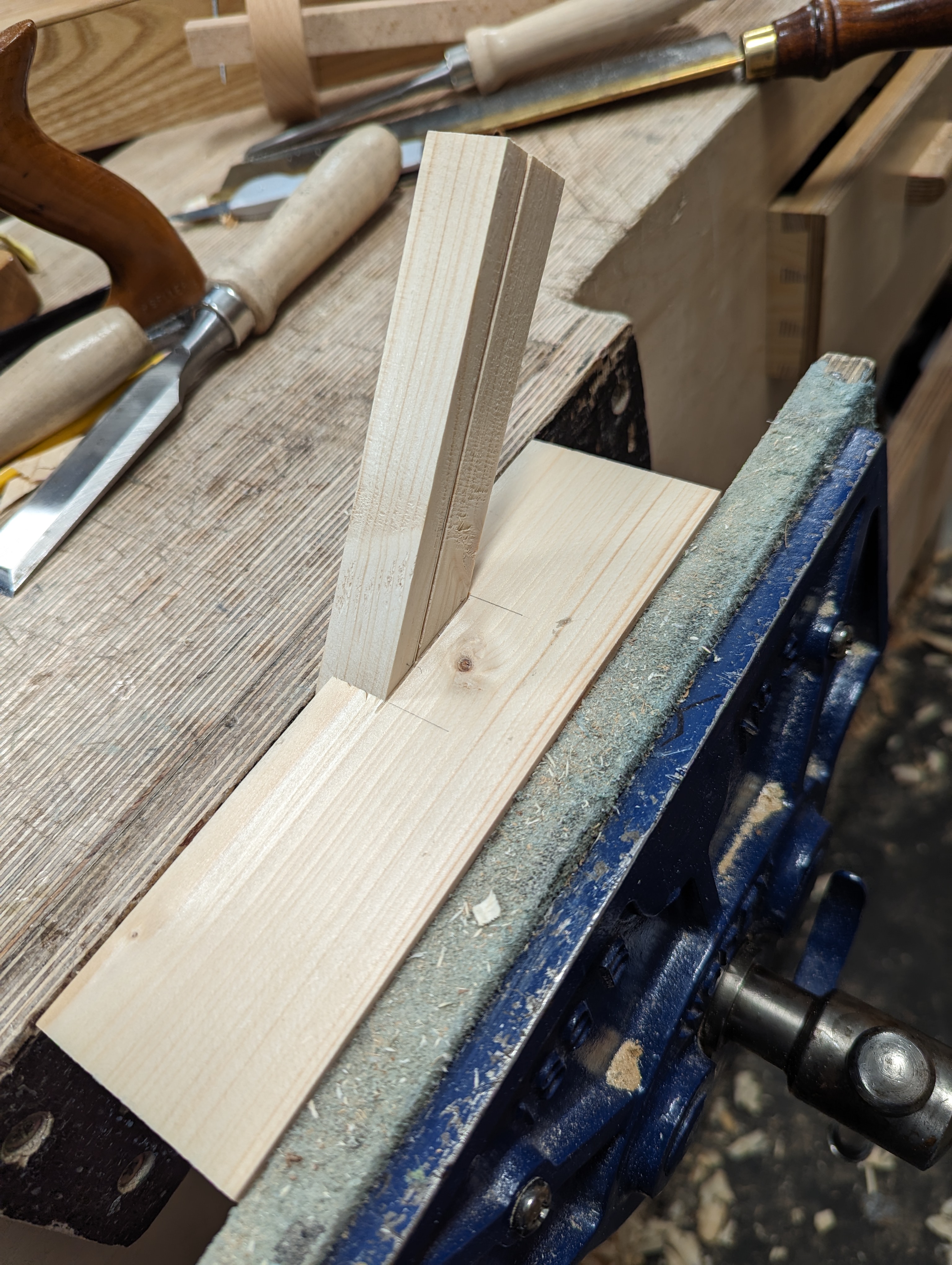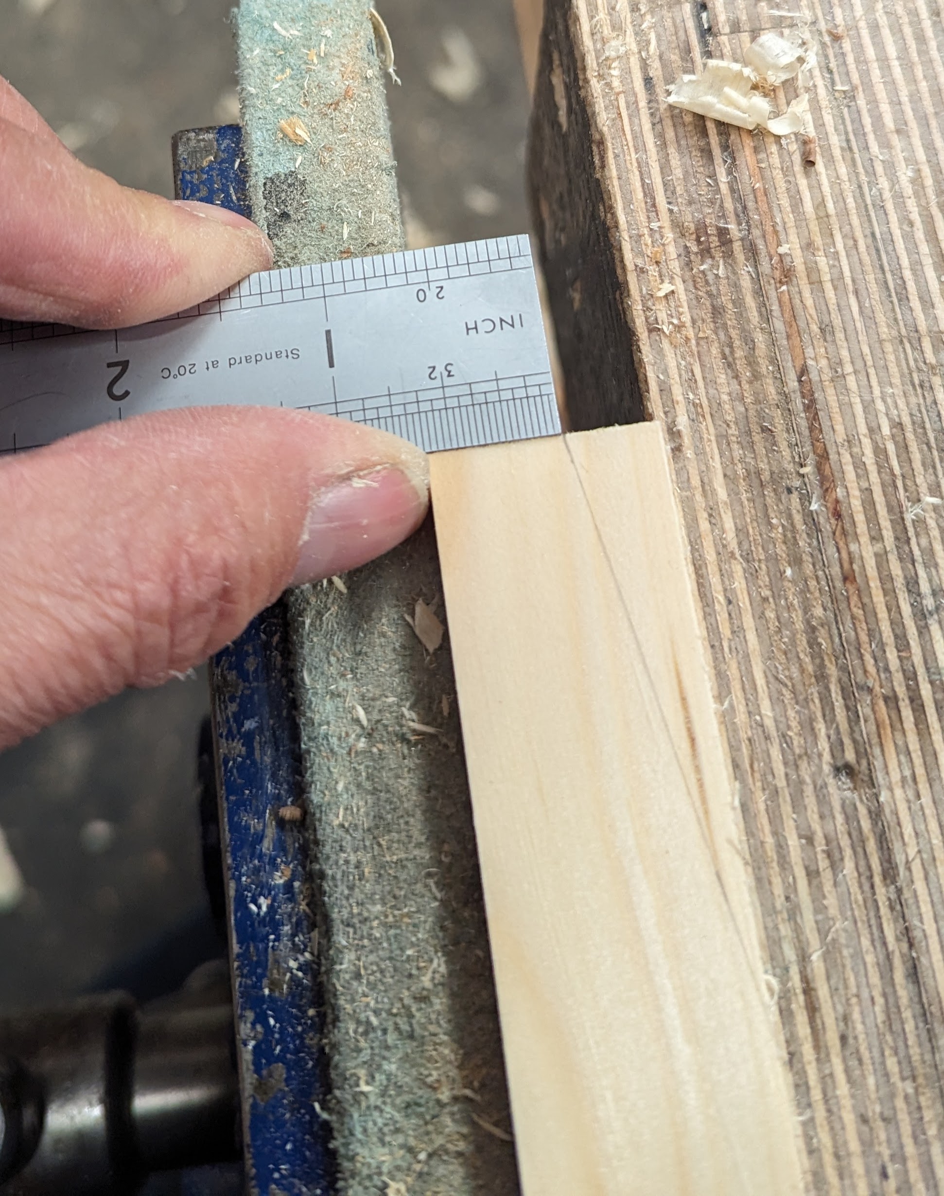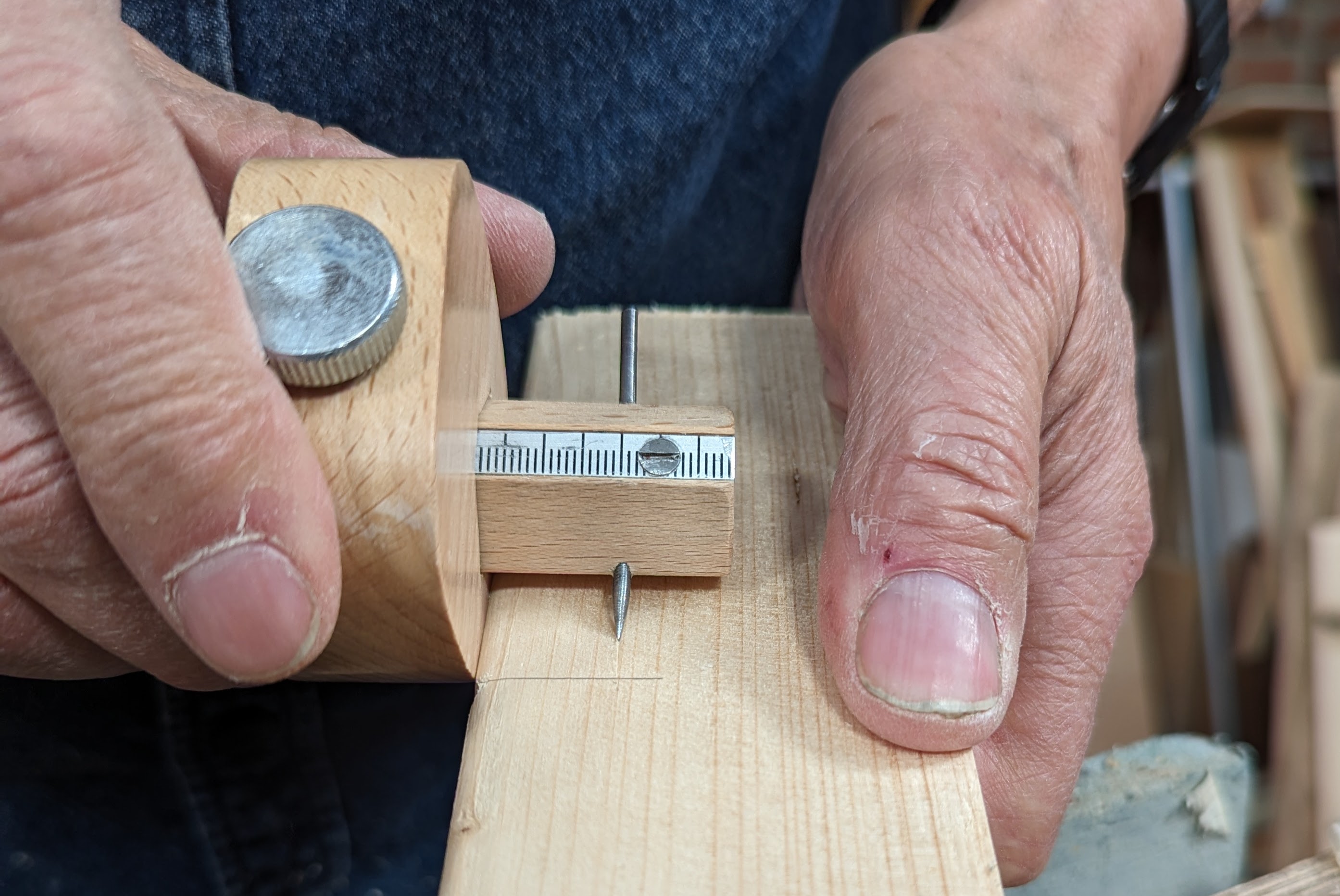 Notice my technique for using the gauge by clamping the stem in the vise and pulling the wood to the gauge point and against the stock of the gauge.