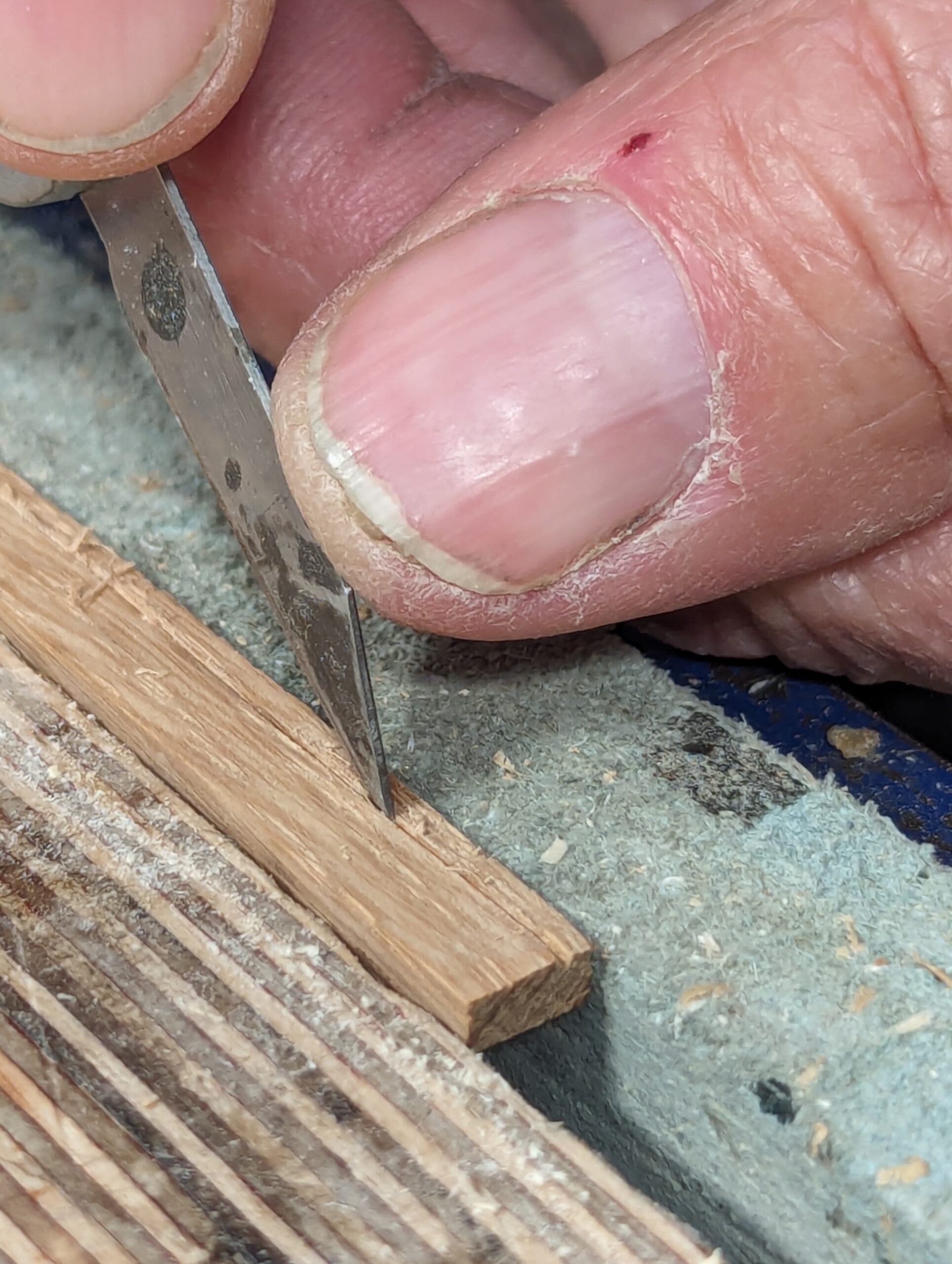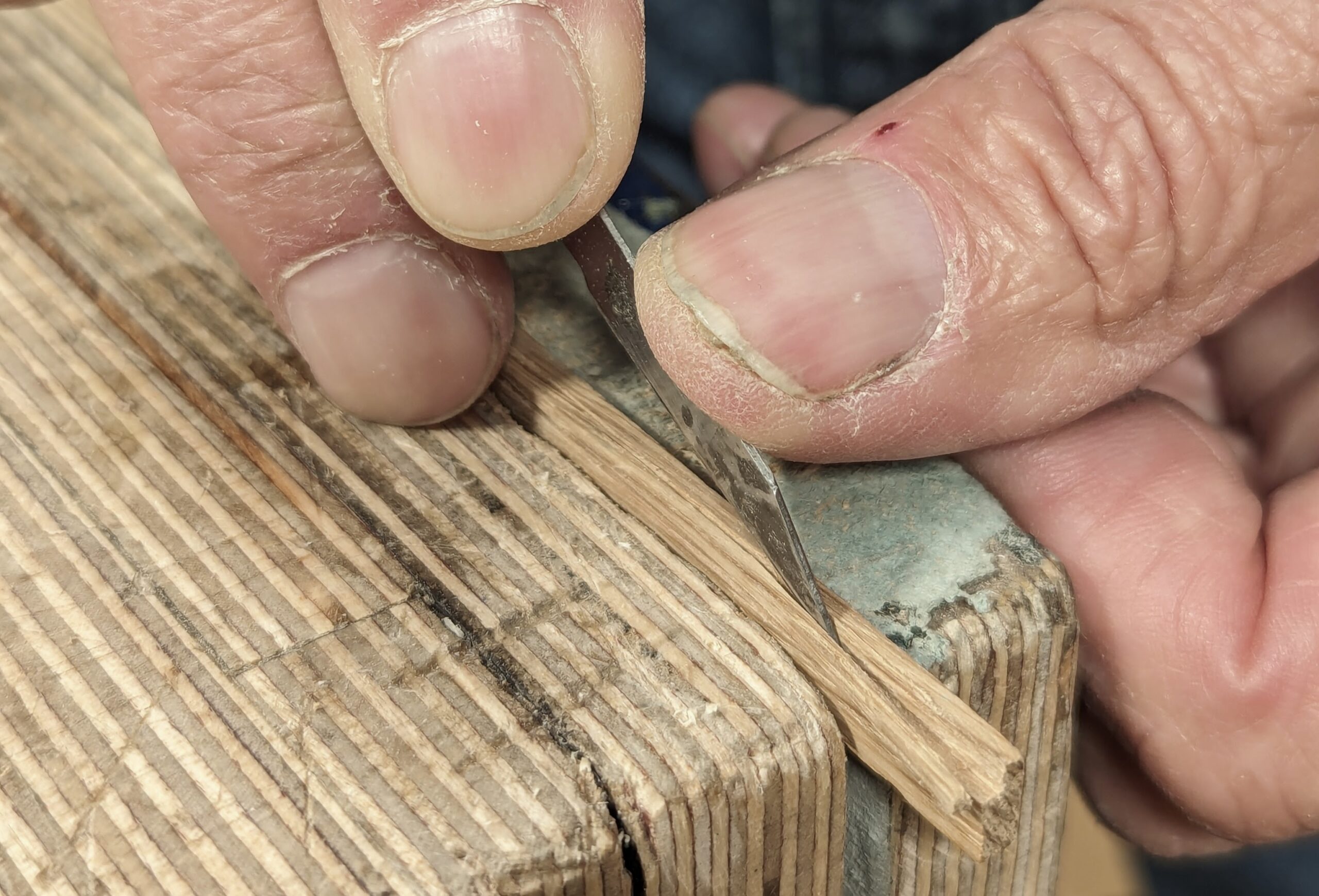 Use a sharp knife to part the fibres down into the gauge lines but not too deep in the first pass as this is likely to split the main body of wood.