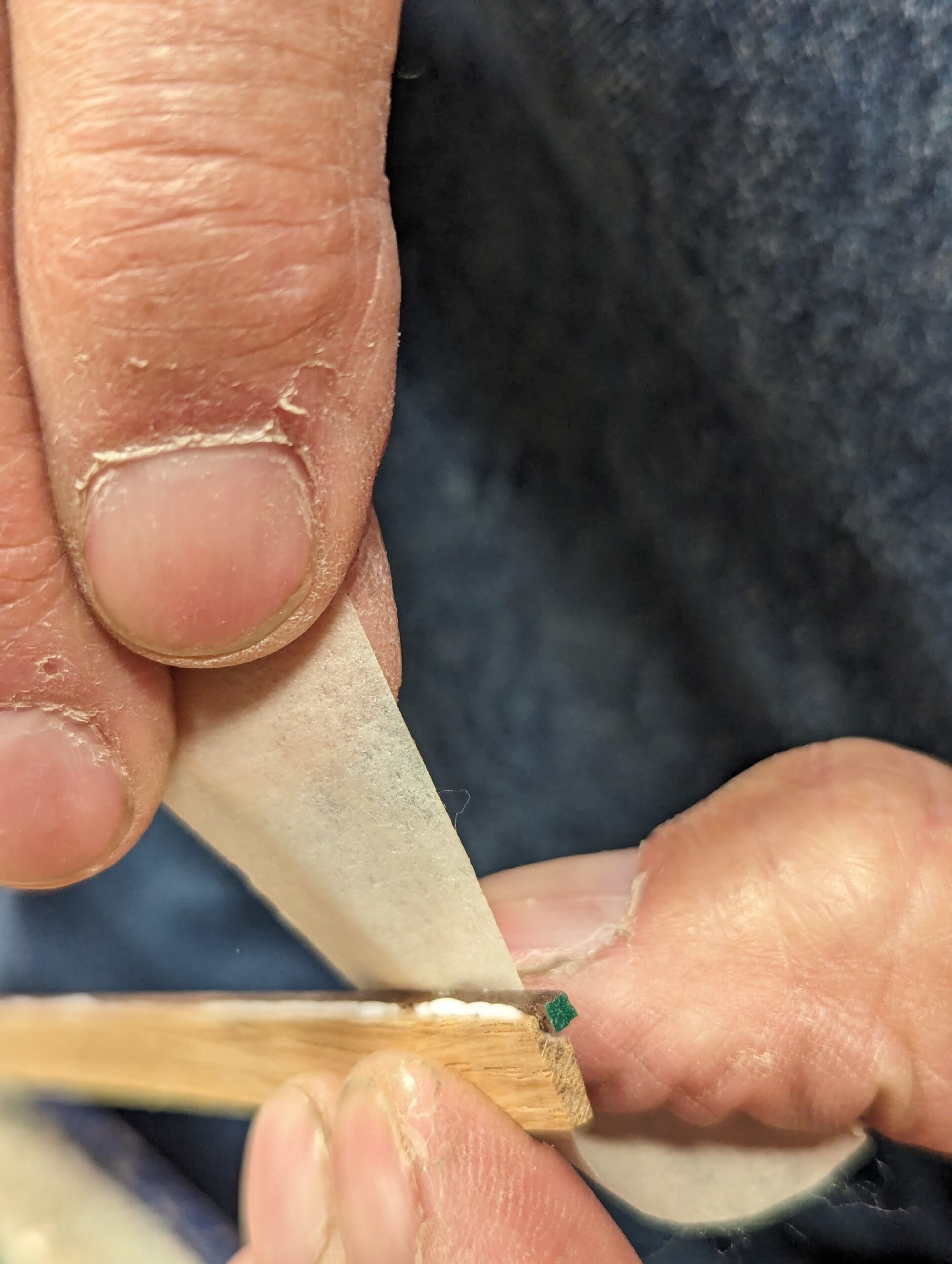 Then I pass the inlay piece into the opening directly adjacent to the wedge where there is zero flex. Previous pulls through the gap were less rigid and the scraper bent just a little under the pulls. Pulling the inlay piece through but tight to the wedge will be the last pull and this will give you a perfectly thicknessed size.