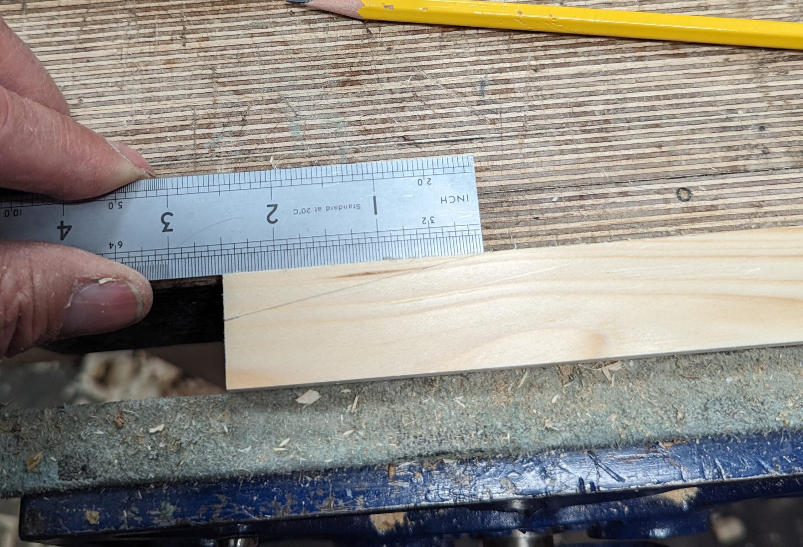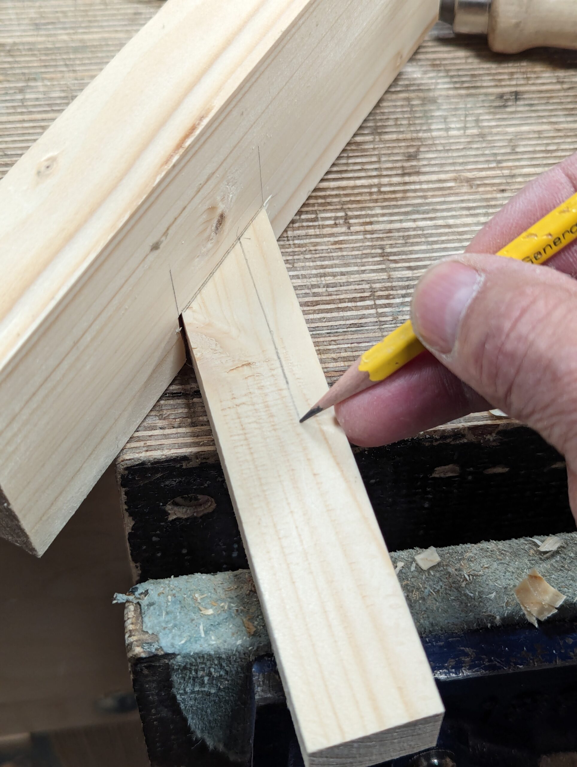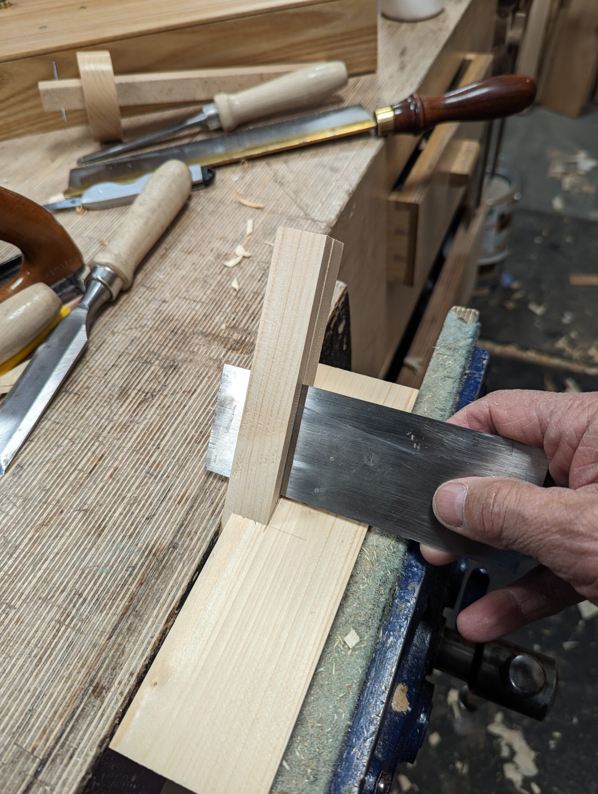 Notice my technique for using the gauge by clamping the stem in the vise and pulling the wood to the gauge point and against the stock of the gauge.