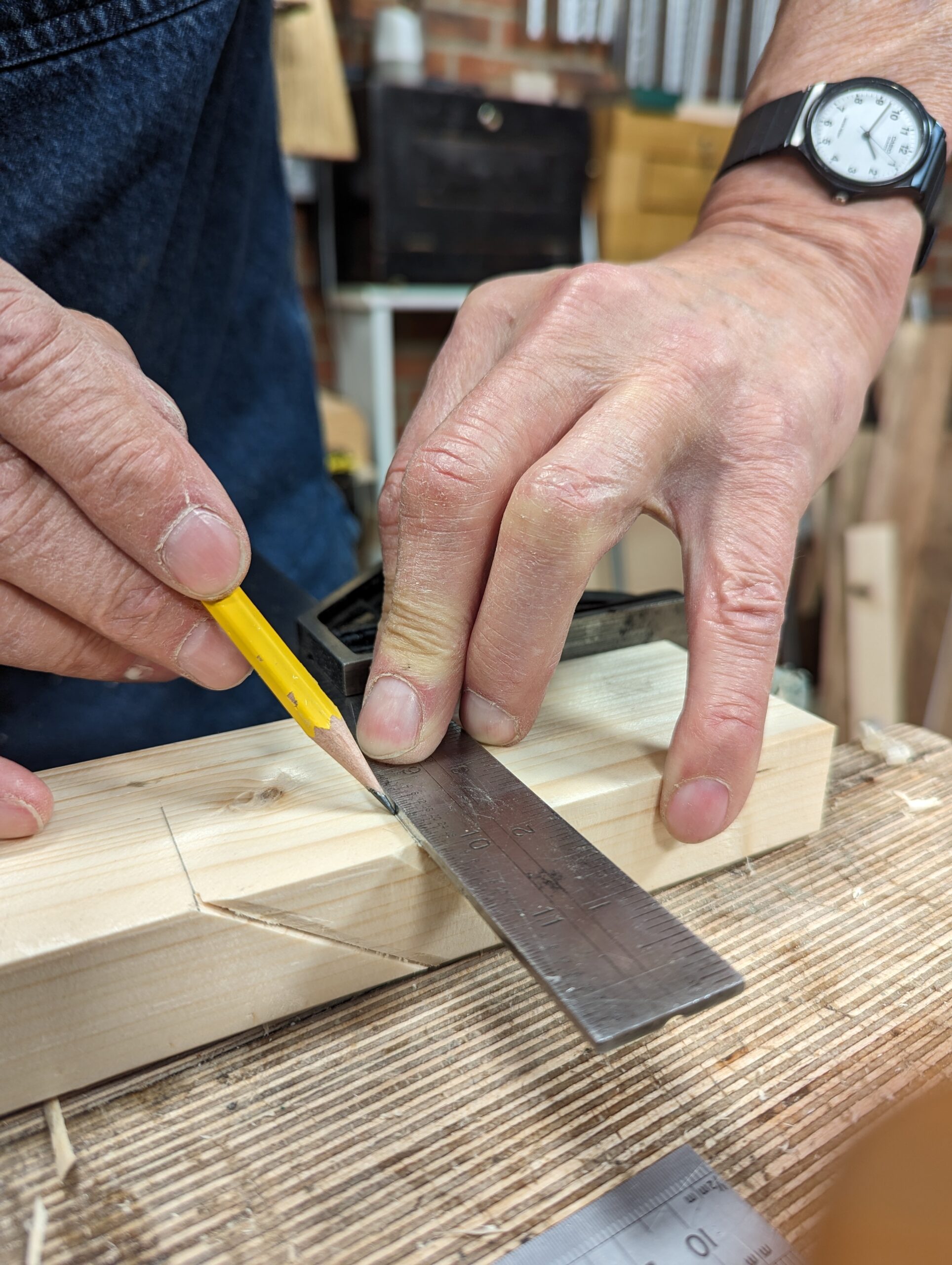 Square a guideline to saw to on either side of the edge onto both the large flat faces, top and underside.