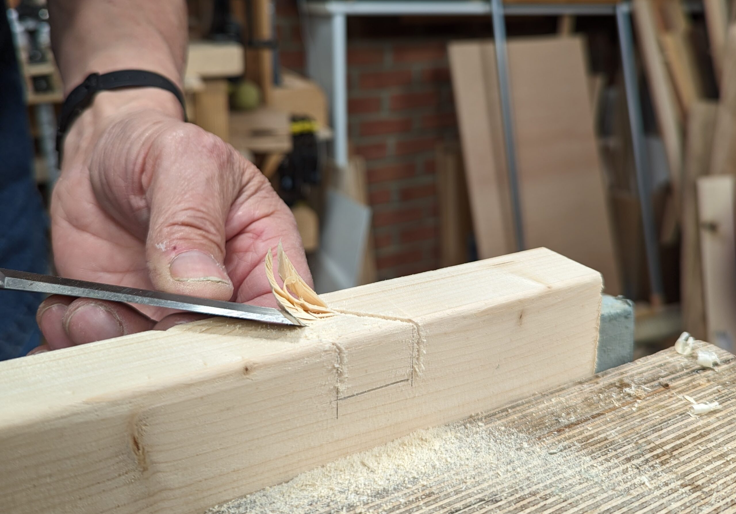 Remove the waste in between with a chisel and route out the final fibres level with a hand router plane or work to the two gauge lines from both sides with a chisel.