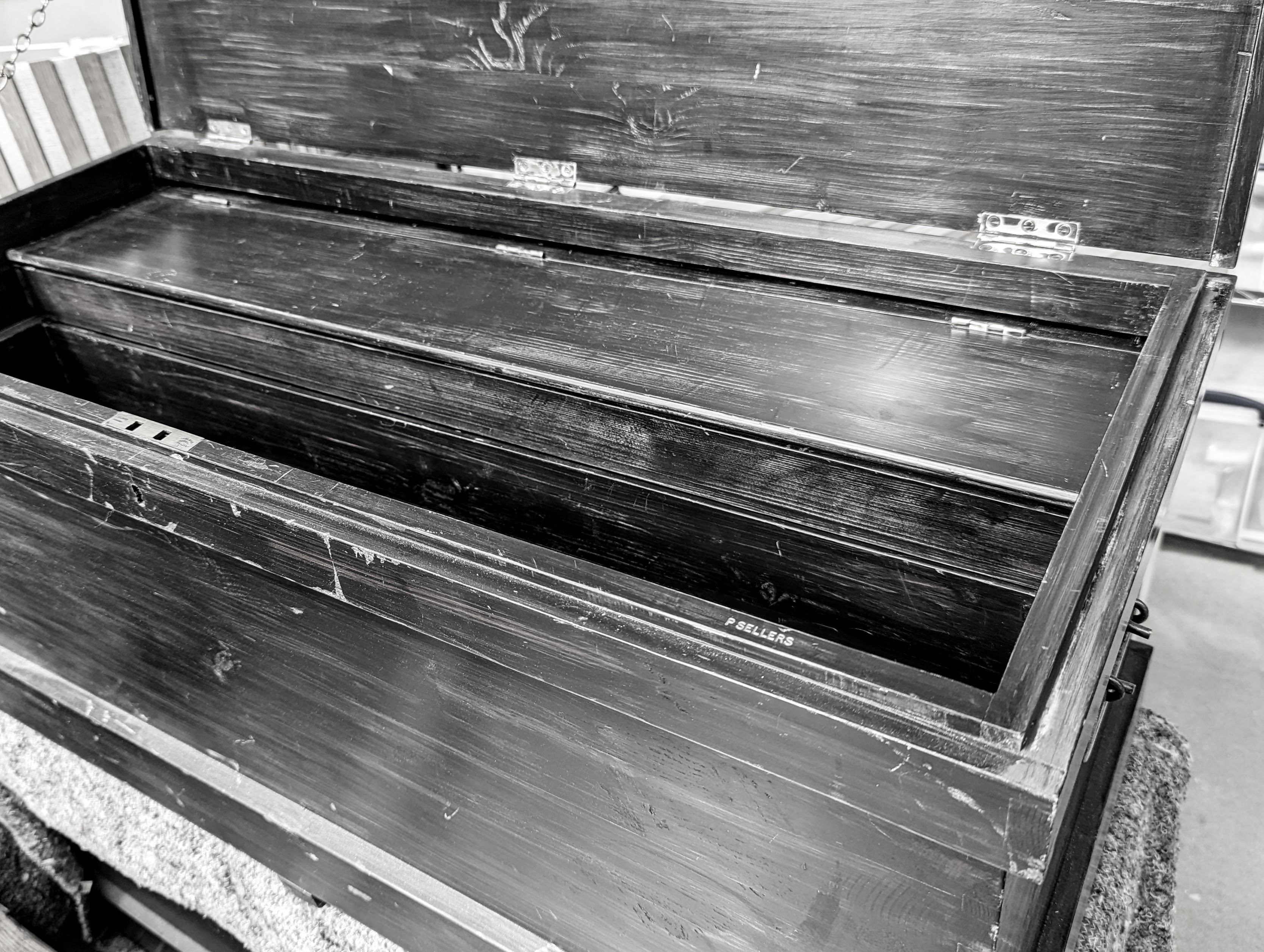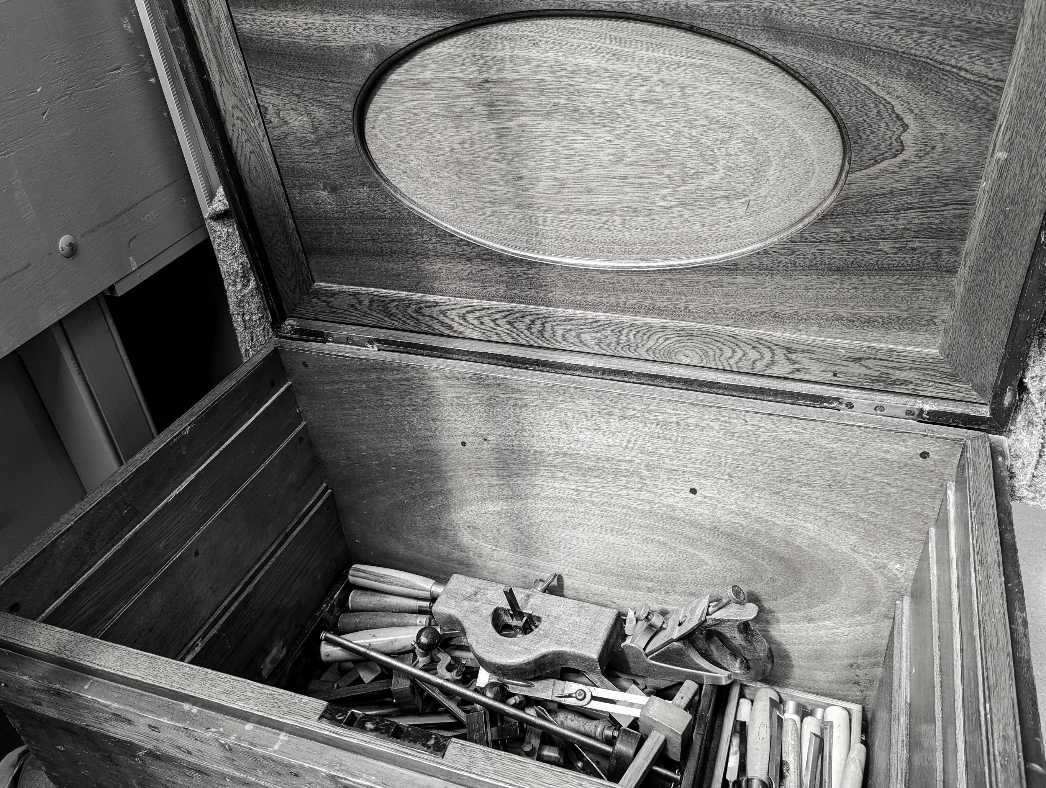 Toolboxes as actual boxes would once have been more tool chests. The portability of tools from workshop to customer was essential to most makers and indeed to the old men I worked with who spoke of handcarts loaded with wood and their tool chests, stepladders and sawhorses to go to work on a house or in business premises and be there for a month or even three. Where the craftsman went, so too did his tools. The box contained handsaws and planes aplenty in different sizes and types. Tills held chisels and other paraphernalia with bent shanks and awkward shapes to cut and fit components and then bobbins for string chalk lines and so forth. Once the tools were rested in the workplace, added equipment would be parked around to support the work, mainly saw horses and planks, but even a bench might arrive for the larger jobs where construction took place for work in situ.