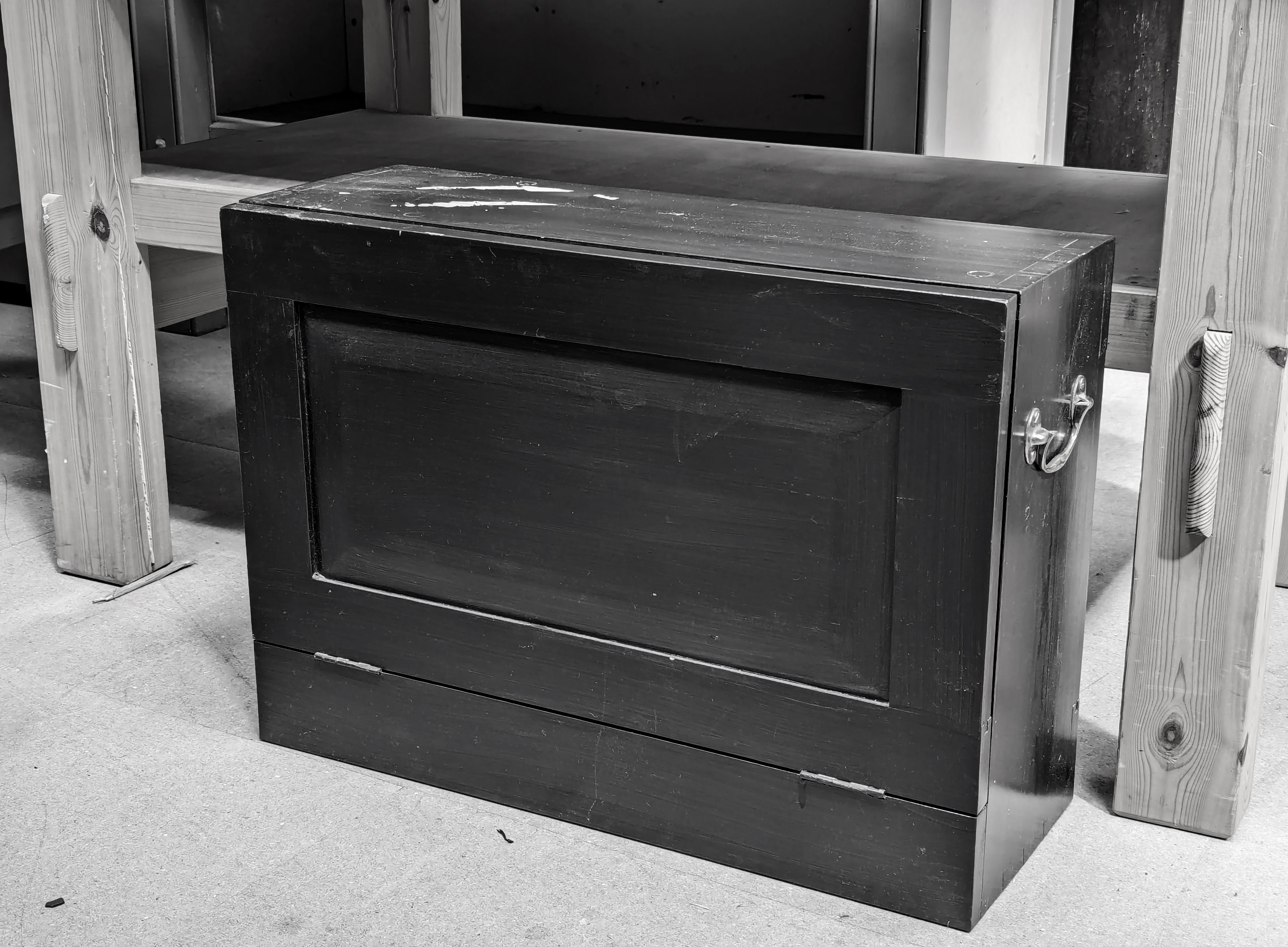 Lift-lid tool chests old and new are far from favourites. I replicated a vintage version for a series of videos and that was a remarkable project for those wanting to learn the classics of traditional hand tooling a work box. Toolboxes with lift-up lids are really not the best to store tools in day-to-day. Once closed, the lid quickly gets covered with wood and equipment. Placed under a workbench means no access at all without pulling an awkward and heavy box out for a plane. Internally, you inevitably find tools piled on tools because many just did not allow a good fit. On site in the heyday of woodworking the chests, maybe two or three of them, would hold the awkward-shaped plough planes and filletsters with stems that took up a mass of space alongside wooden bench planes in various lengths. And then what shall I say about matched pairs of tongue and groove planes alongside a dozen moulding planes for matching up what exists in the house you were working on? Those days are now gone. But they are not so long gone I didn't experience the boxes and the travels with them when I was young. As a joiner coming out of my apprenticeship, I spent the next five years in my journeymanship travelling to different counties to do work. No handcarts any more though, a small green Morris 1000 van did it for me.