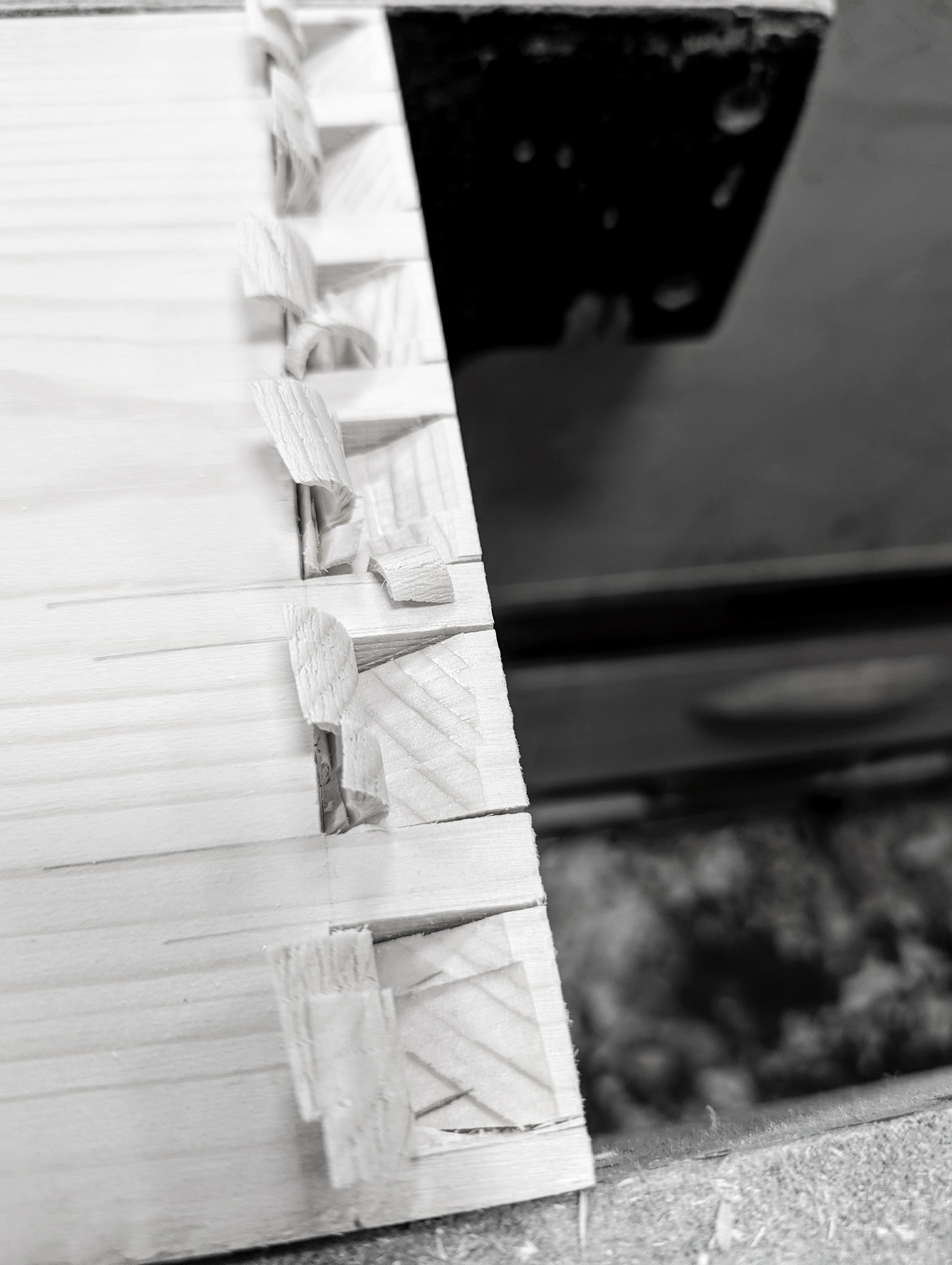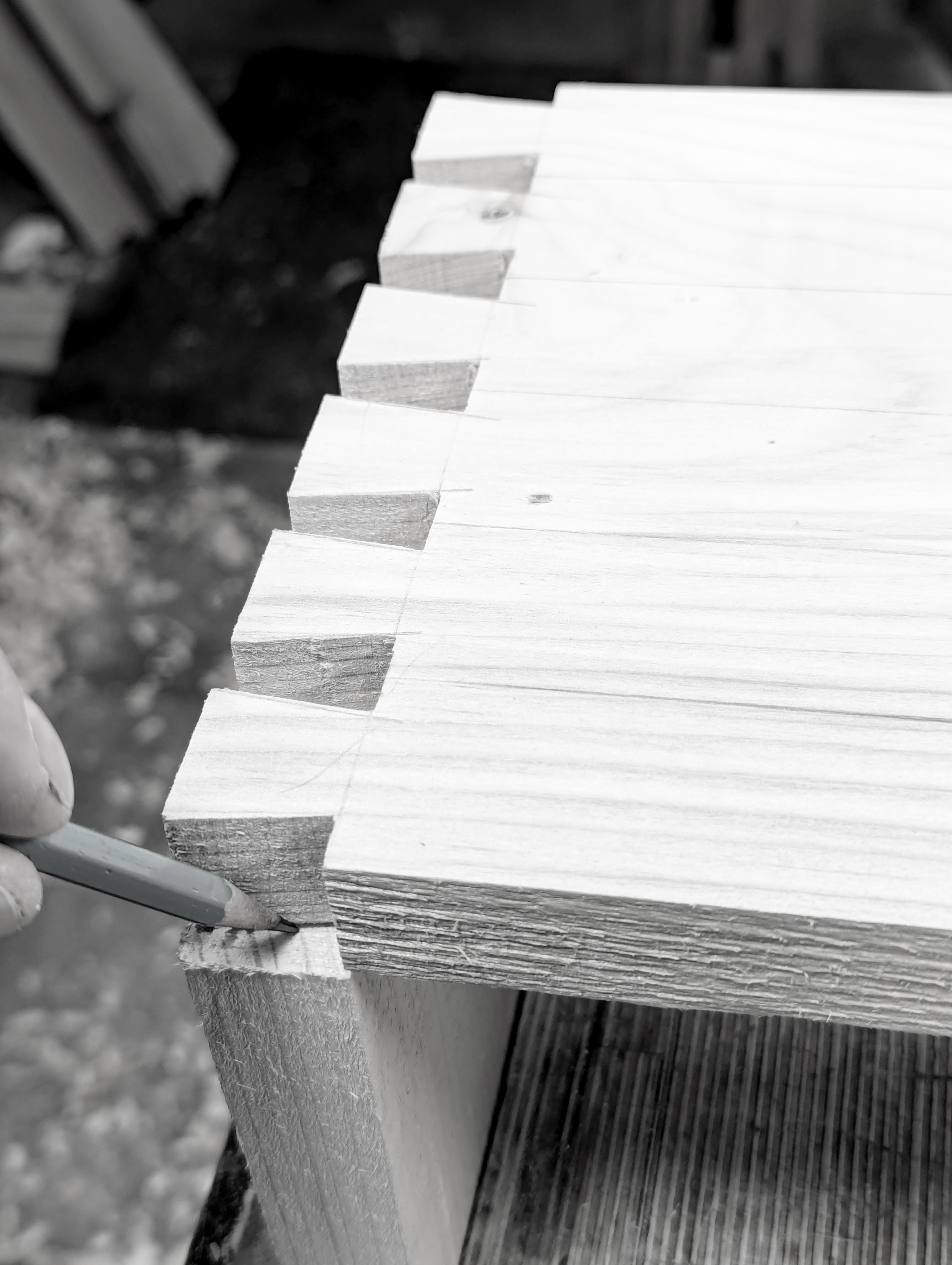 It was the tap-tapping of the tails into the recesses between the pins with the end of a one-inch chisel I remember the most. George had shown me this but did not leave it there. He'd explained Newton's Third Law that for every action (force) in nature there is an equal and opposite reaction. When pressing with my then thin, unmuscular thumbs and fingers the tails no longer moved further in to bottom out, I needed a little extra and a chisel was always close to hand and a good choice. As I tapped, the inserted tail wood exerts pressure and by doing so an equal and opposite pressure to counter mine caused the tails to deepen and almost magically pull themselves into the recess. The tap to each tail sent the pin wood into and between each dovetail just a fraction ahead of whatever was on either side. I could both hear and feel the 'pinch' of tightness as I traversed the expanse of dovetails going first from left to right and then back from right to left. It wasn't what everyone insufficiently calls this fun though, it was the sort of frivolous triviality that lessened what was in reality more a deeper sense of pure exhilaration. To describe victory of this or any kind as mere 'fun' makes it so much less than the realness of it. This very specific and wonderful worked-for victory told me that I could and would always make airtight and watertight dovetail joints to equal those of all of the men in the workshop who bit by bit taught me and were now hovering around to look over my shoulder. These men never criticised me unless I needed it and by that I mean they did not take any talking back or beligerence lightly, but they did critique my work and by this I grew. Big difference.