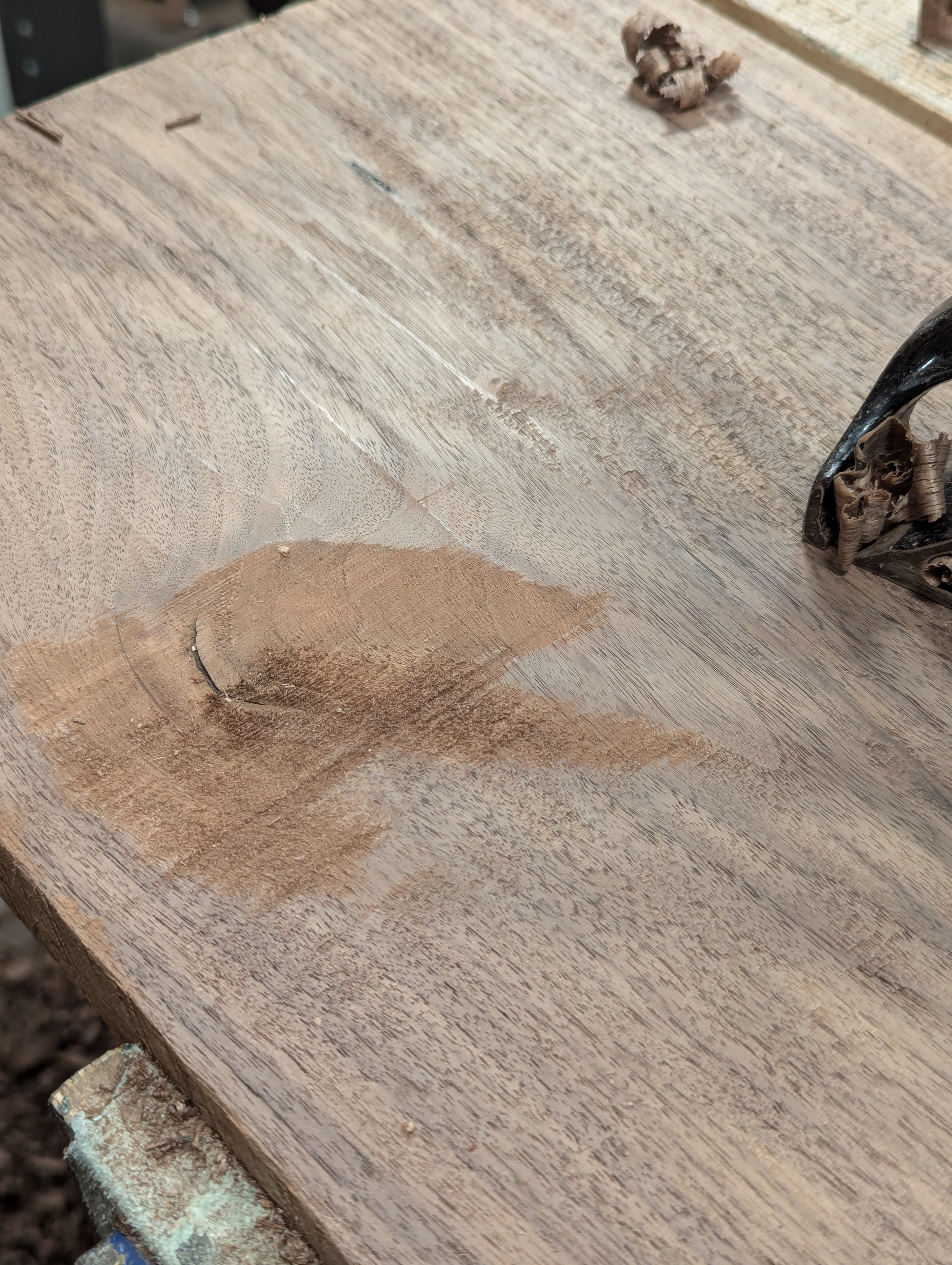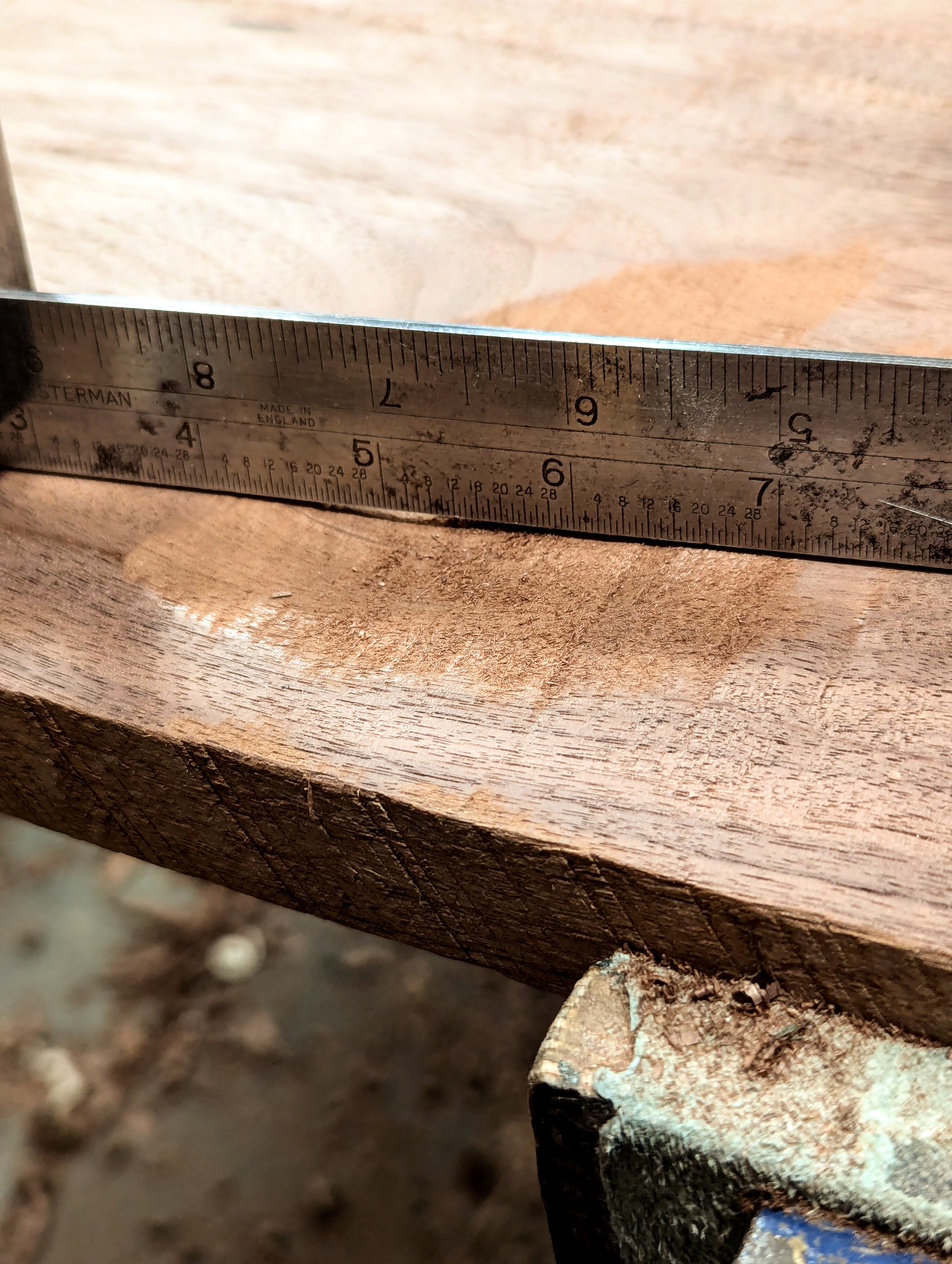 As you can see, the hollow is a good 1/8" deep but to get through to even grain I would likely need to go another 1/16" and that means losing 3/16" in thickness.