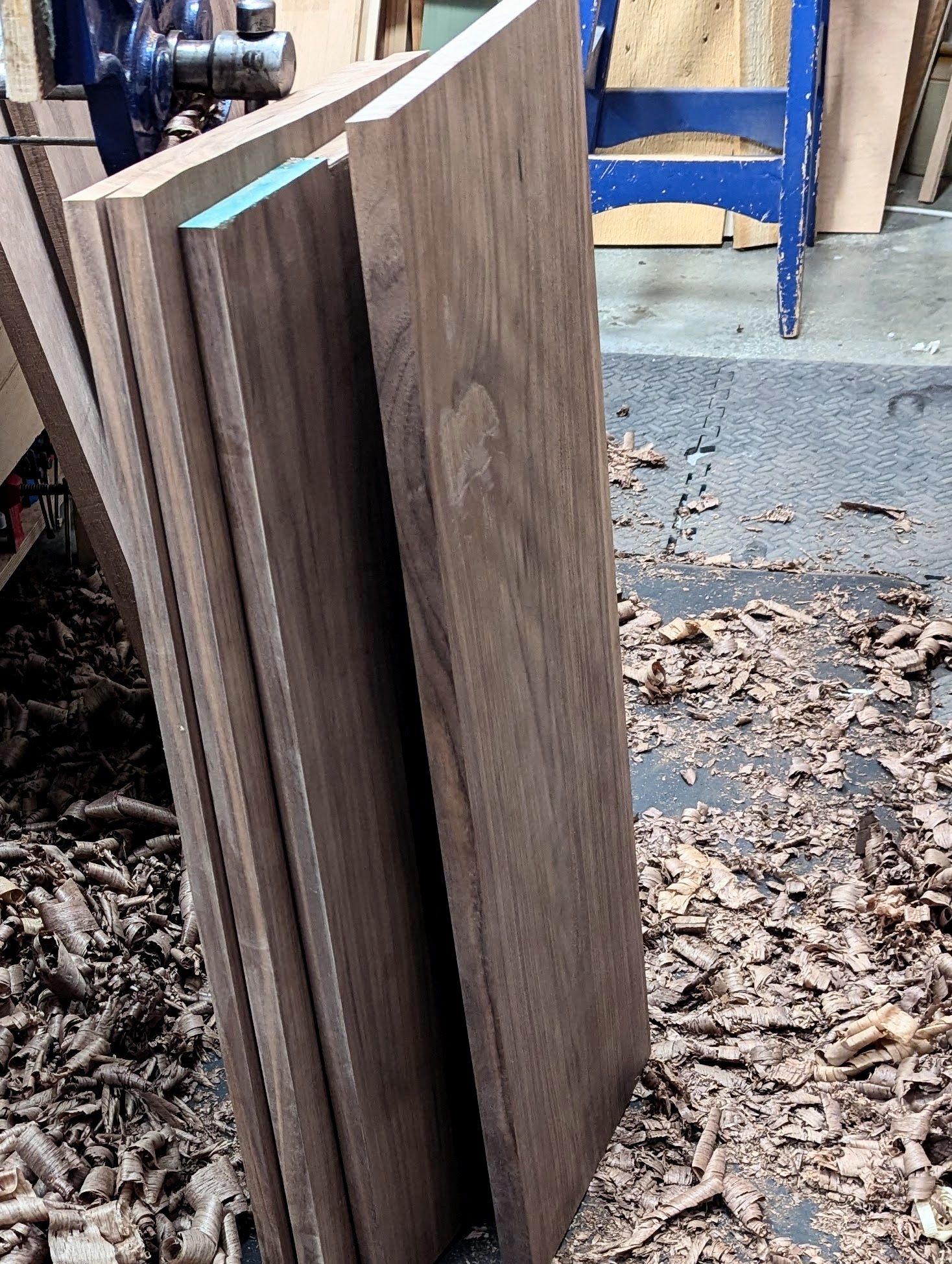 This walnut has some decent colour and even marking to its grain without being flamboyant––probably a US import of Juglans nigra. Cutting the sections to length and roughly ripping to an over-width width size cuts down on the waste and the energy I need to dimension everything. Surprisingly, my material all came out very close to my goal of an even 1" in thickness but one piece had a deeper scallop that would have made my one remaining board too thin.