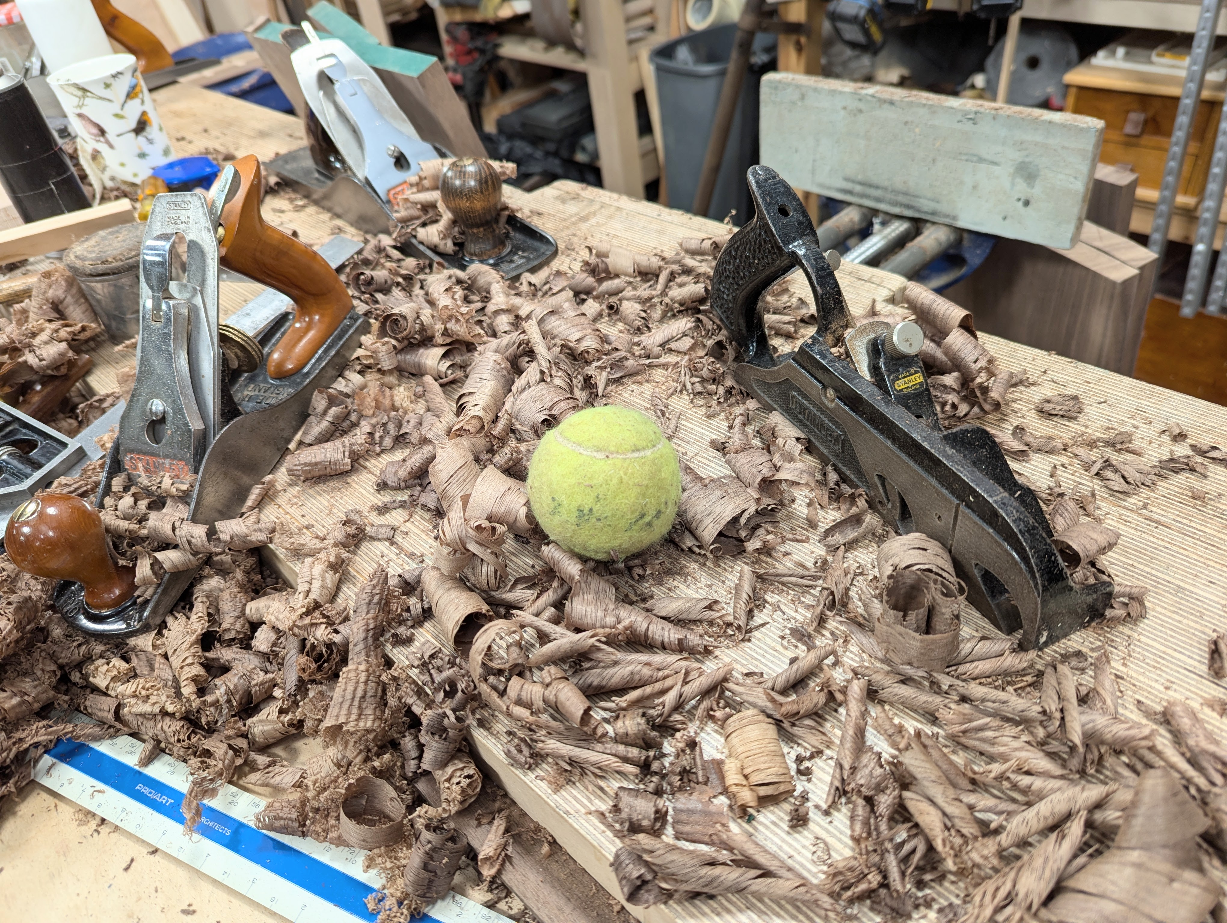 Defects like this, make the rest of the board a fault that needs taking down to the bottom of the lowest point in the hollow. That would mean that the board would be too thin. This trick can save the board and I only did this in this case to give you a trick for down the road. This hollow is on the underside of the top of my cabinet and so would never be seen in the finished piece. Let's call it 'Paul's tennis ball trick.'