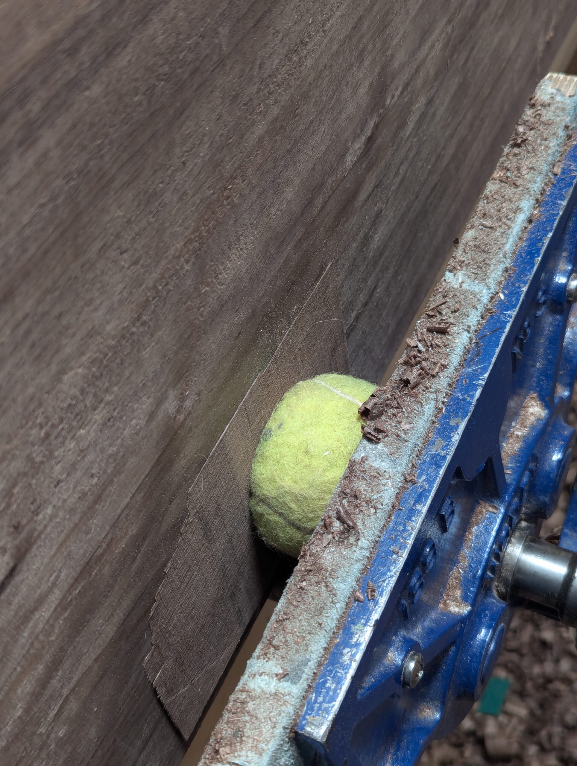 Defects like this, make the rest of the board a fault that needs taking down to the bottom of the lowest point in the hollow. That would mean that the board would be too thin. This trick can save the board and I only did this in this case to give you a trick for down the road. This hollow is on the underside of the top of my cabinet and so would never be seen in the finished piece. Let's call it 'Paul's tennis ball trick.'