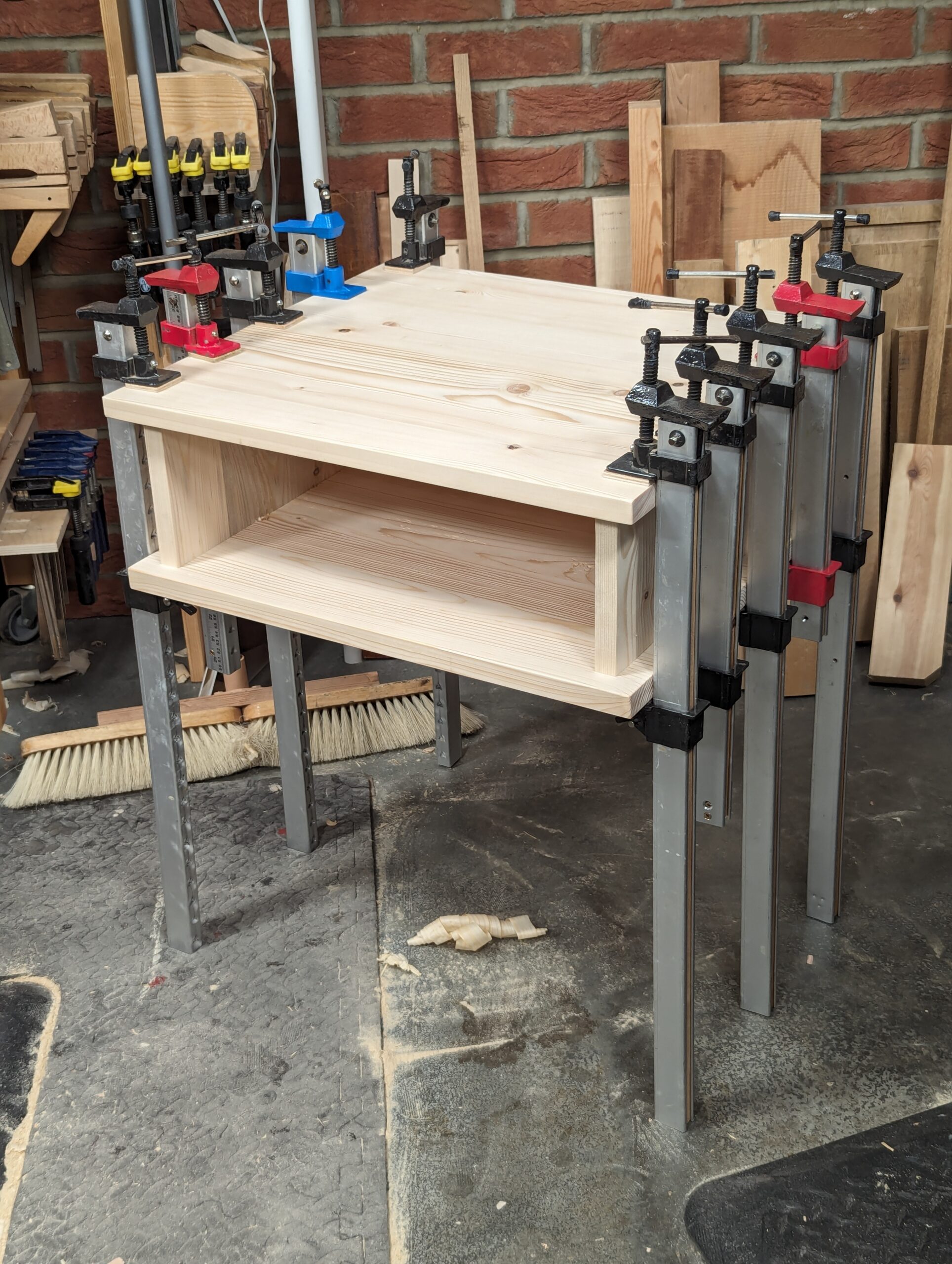 This has been my third design to conclude since the assault but I actually made about ten or more of the three pieces in the development phases of the designs. The first two were relatively small pieces. I did this on purpose as a lead-in back to gradually heavier work and the more demanding energy furniture making with hand tools demands. As on the day of the attack, I didn't know how much I would recover or how serious the damage would be. I now find myself being ever-grateful for the level of recovery I have had. I am always surprised by just how much repetitive work still spikes my appetite for what Texans call the "same ol', same ol." I just love every aspect of my woodworking with hand tools and it never seems to get old. It has been that way for 60 years thus far and I see no waning in my love of the ordinary and then too the extraordinary. If I tire at the end of the day and the work seems a little more tedious than at the start of the day, I clean up, sweep up and put up and write, draw or whatever else is productive for me and the next morning I am just as keen as when I was a fifteen-year-old. The week I started the bedside tables I cut eight housing dadoes in quick succession, 17 " long, 3/4" wide and quarter-of-an-inch deep. Though it's in spruce (relatively soft), the knots and their surrounding grain are a beast to work with with chisels and saws as they are hard and as dense as any other wood you care to name and have no grain run you can reliably follow with your cutting edges. As always, I did enjoy the whole of it still, and what was really nice for me at this stage in my recovery is that I have a few days of working where I experience no pain or strain to my rib area as in recent months. Oh, there is still some discomfort in other parts of my body that I find myself cushioning now and then, and I did have physio to help gain relief, overall I am now doing much better.