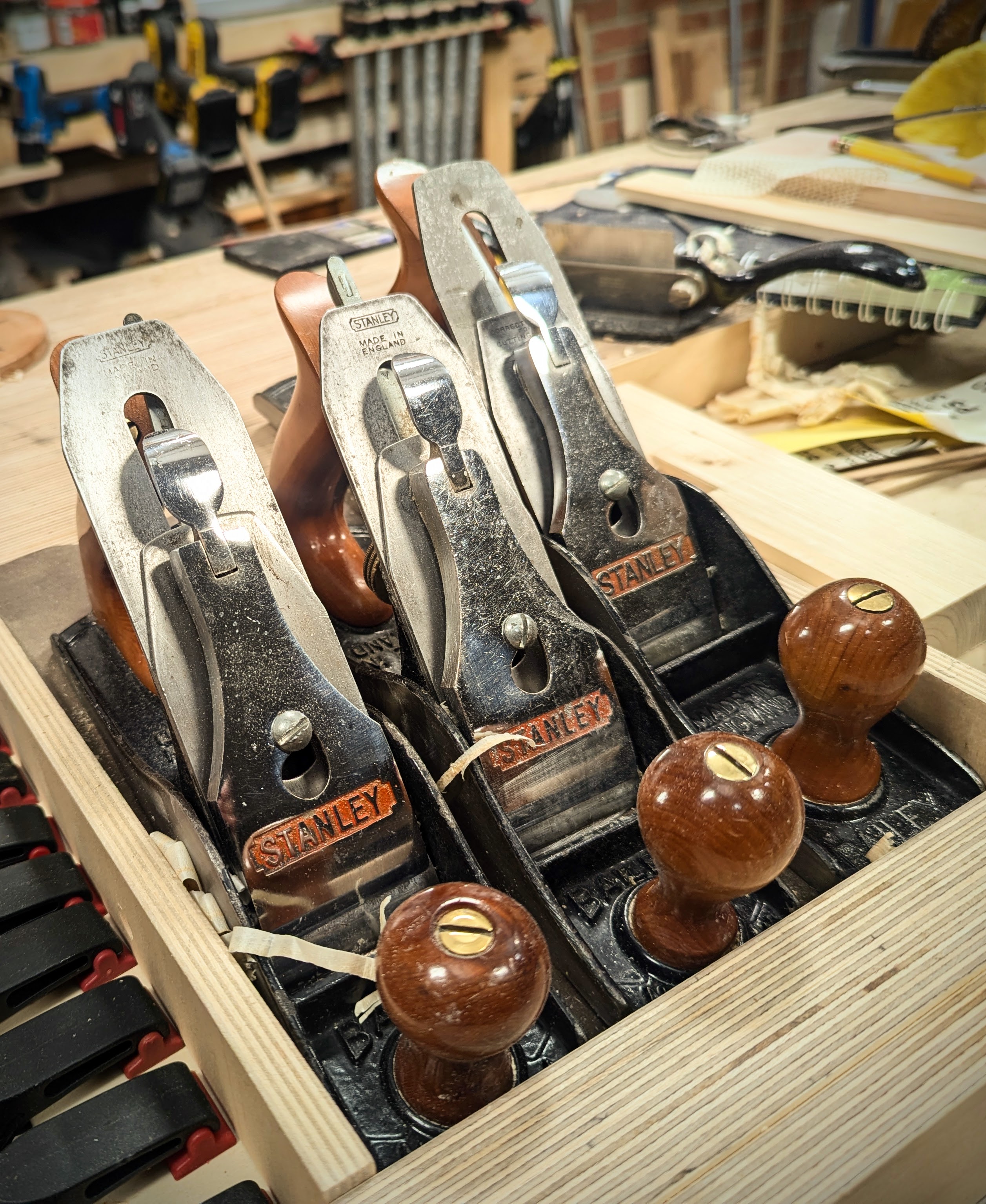 I have bench planes conveniently housed in a carrier at the right end of my bench well. It's inclined and when my hand slides into a tote the plane comes effortlessly to work in a split second. Three planes sit there, my #4 smoother, my #4 scrub plane and my #5 Jack plane. They come out sequentially according to need. Behind me, on my support table, I have other planes including a second regular #4, a #4 1/2 and a #5 1/2. These too get regular use.