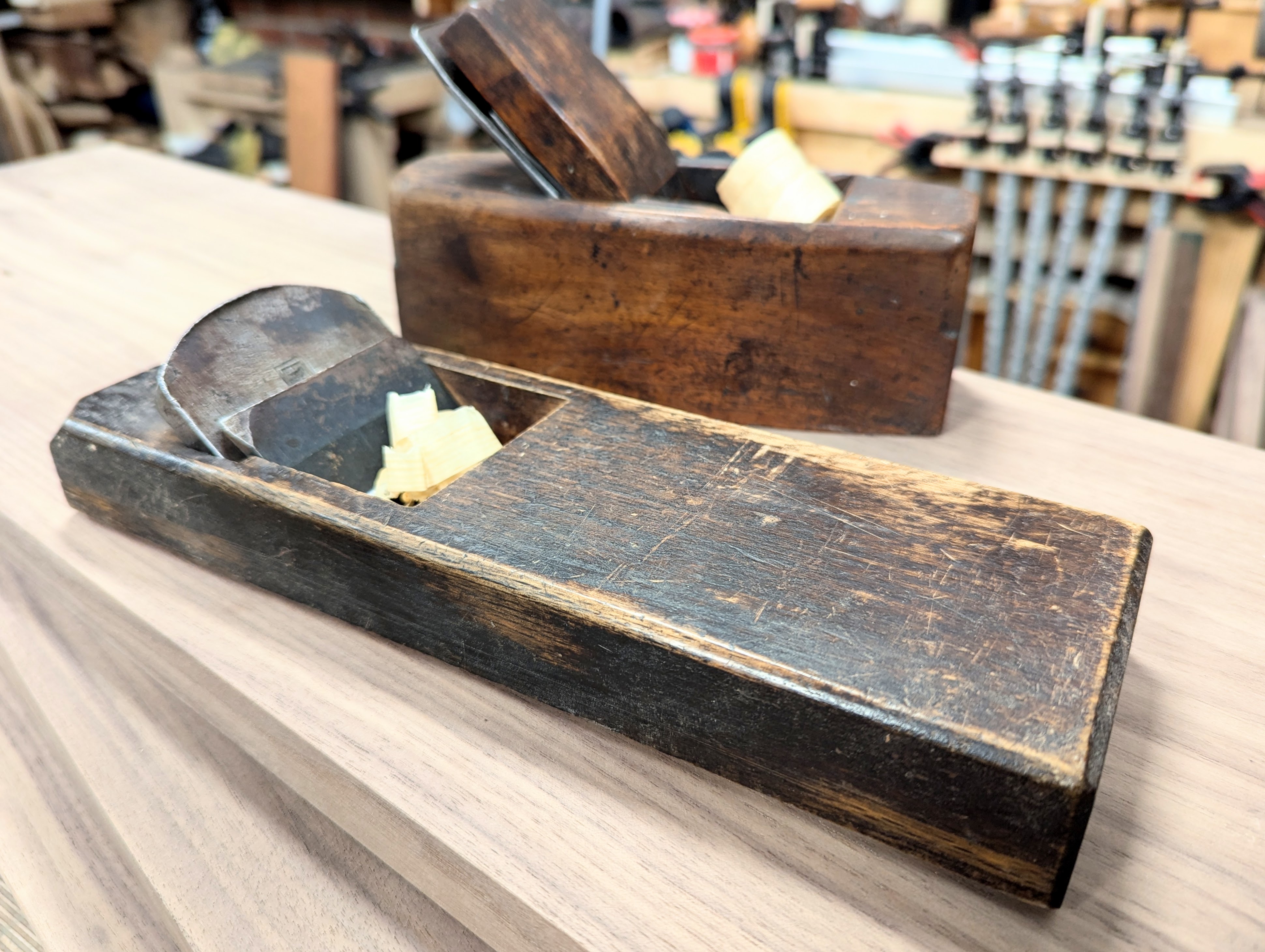 It is more than interesting that in mainland Europe, the makers and users there continued using their preferred wooden planes for bench work. Even in the last seventy years, the all-metal versions have been slow to gather very much ground and that's because all metal planes have twice and three times the level of friction on the wood that wood on wood does. Over the longest period, European woodworkers making for a living continued for a century beyond the invention of the cast, all-metal versions and never really transitioned through to fully or even partially adopt the cast-metal options as standard equipment. Not so in the US and British realms. But there was good reason not to. We tend to think that cast metal planes will be the more advanced method of woodworking which is far from true. Look at some wooden planes, perhaps the top one I am using, and then a dozen others that I use, and I doubt that they were used for less than fifty years of daily and continuous use.
