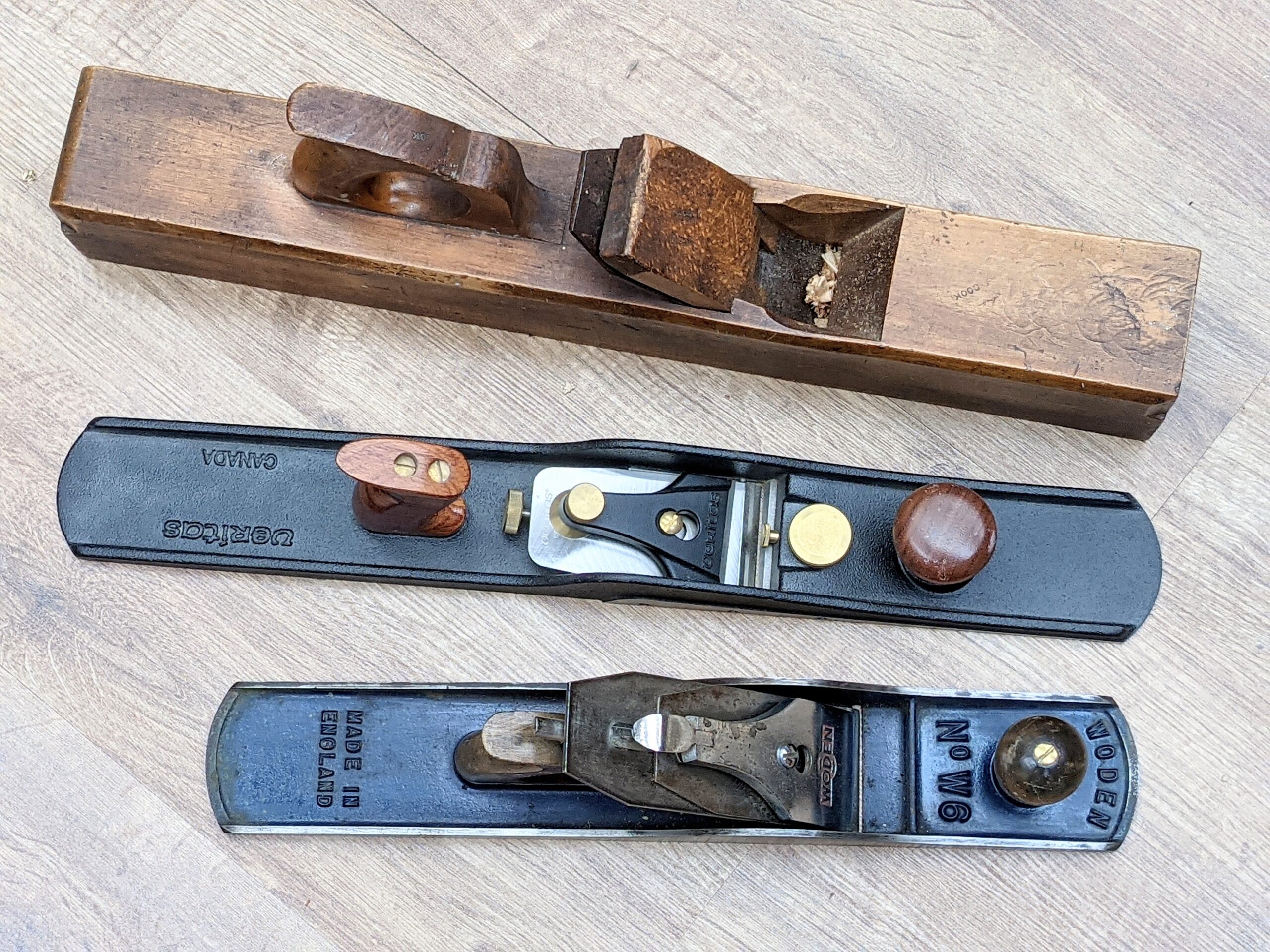 If I only had access to the above planes to flatten boards for a tabletop or true-up four-by-fours for table legs my so-said "Go-to" (and that's the last time I will ever use this lower-grade term) plane would not be among them. If this was what was offered and I had to choose one for the task, it would be the wooden top version even though I do enjoy owning the other types. The ratio of use might be ten to one for the wooden one and then equally for the other two but you'll get substantially greater success on planing flat wood with the Bailey-pattern bevel-down bench plane than you will with the Veritas simply because low-angle bevel-ups fair less well and tend to tear the grain wherever you get rising grain in opposition to the planing direction. So, the first choice is the wooden version, the second the Woden and the third the Veritas, but remember I am talking about general planing of face grain here.
