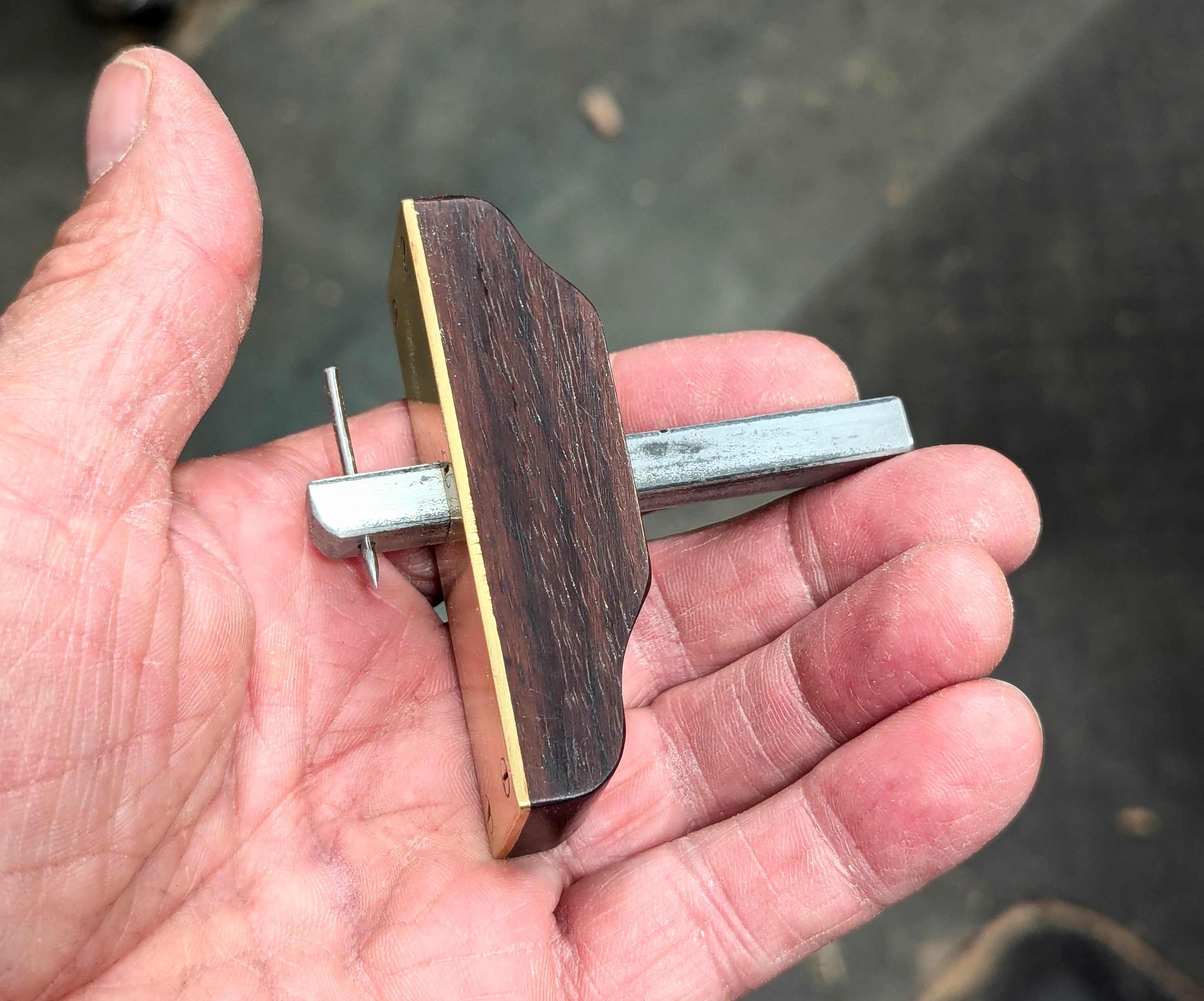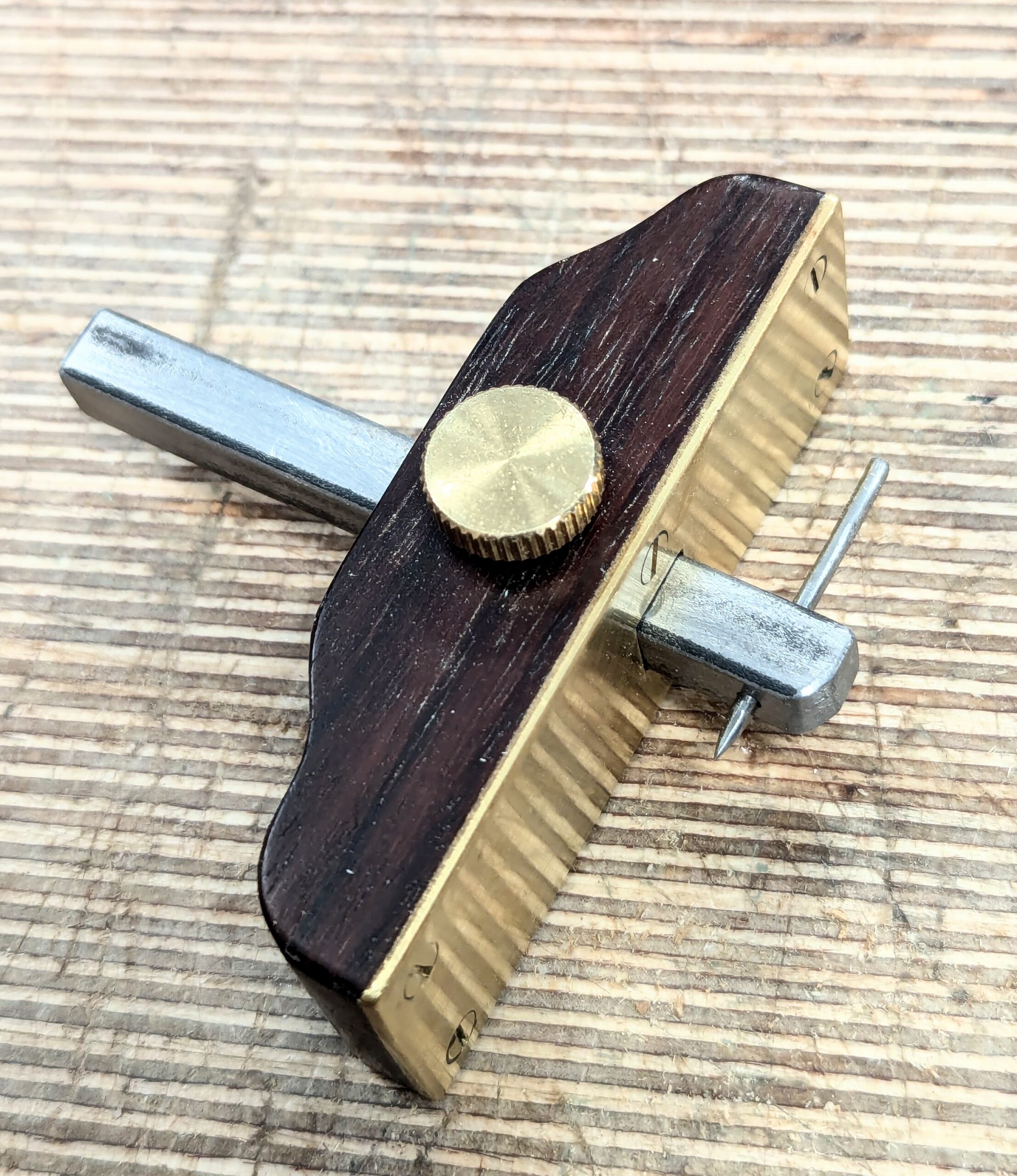 For this tool, Hannah used part of a brass door plate for a wear surface, a short section of 1/16" diameter piano wire for the 1 1/4" long pin, a scrap of rosewood from a salvaged cabinet and a door knob spindle for the stem. The six brass screws were new and so too the 6mm by 12mm long brass thumbscrew. The workmanship is very lovely.