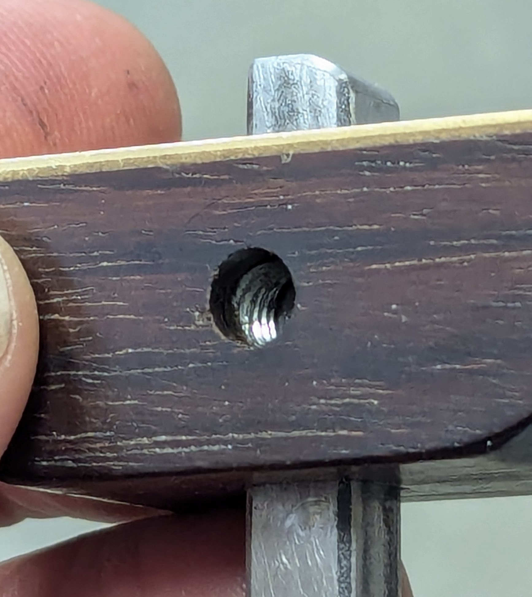 Behind the brass plate, Hannah recessed a nut corresponding to the size of the 6 mm thread of the thumbscrew. Quite tricky to get it to align but align it does.