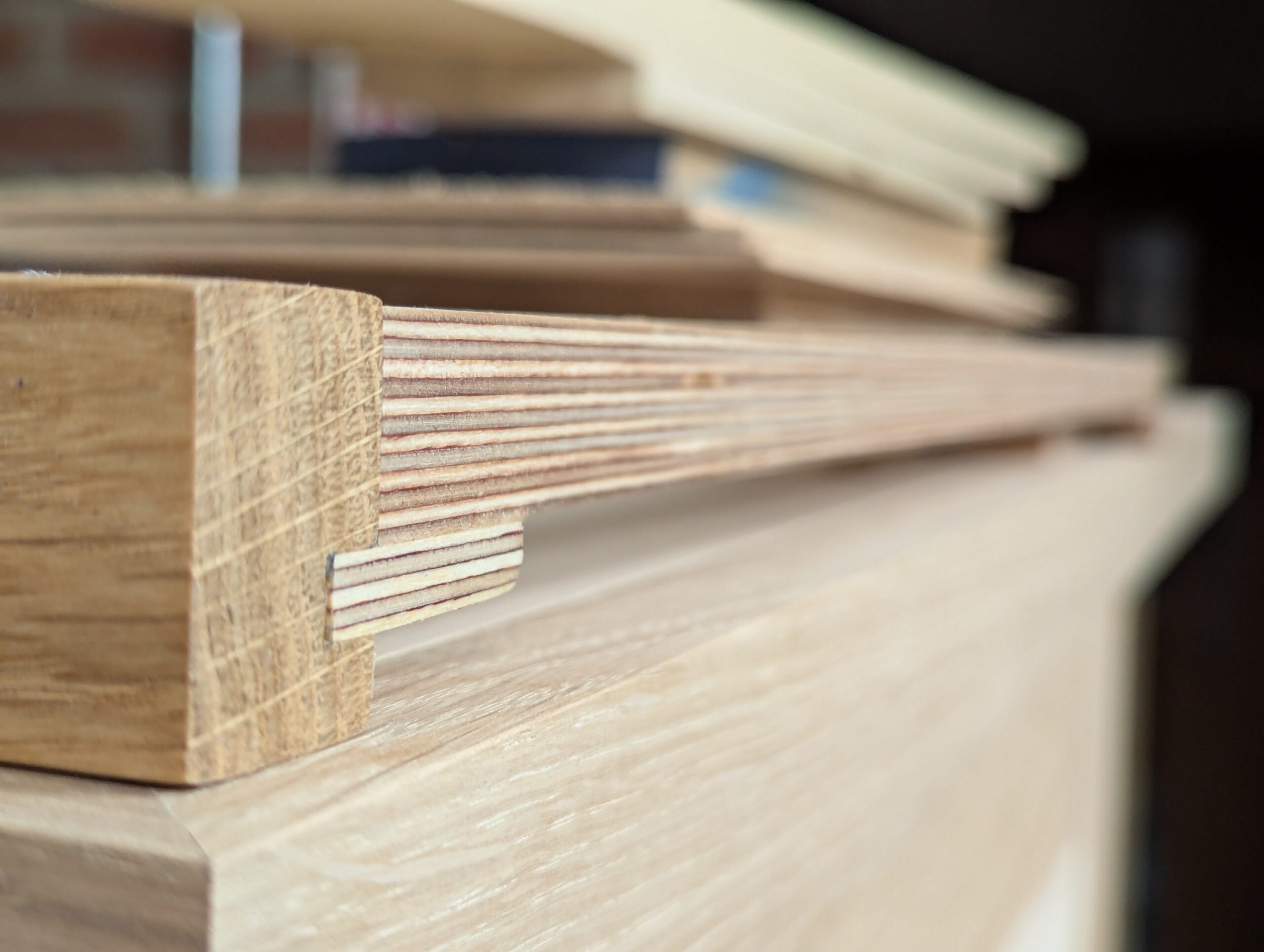 These past few weeks my ideas developed along a new line in design. In this project I used sheets of either quarter-inch or three-quarter inch birch plywood as the main panels but then added quarter-inch plywood tongues to the edges for fully engaging into hand ploughed grooves in the solid wood. It's a stunningly strong concept and it is indeed all done with only hand tools which critically is what I wanted. I felt we could be advantaged by a quality concept that has indeed become traditional in use and in something that saves considerable panel-making time.