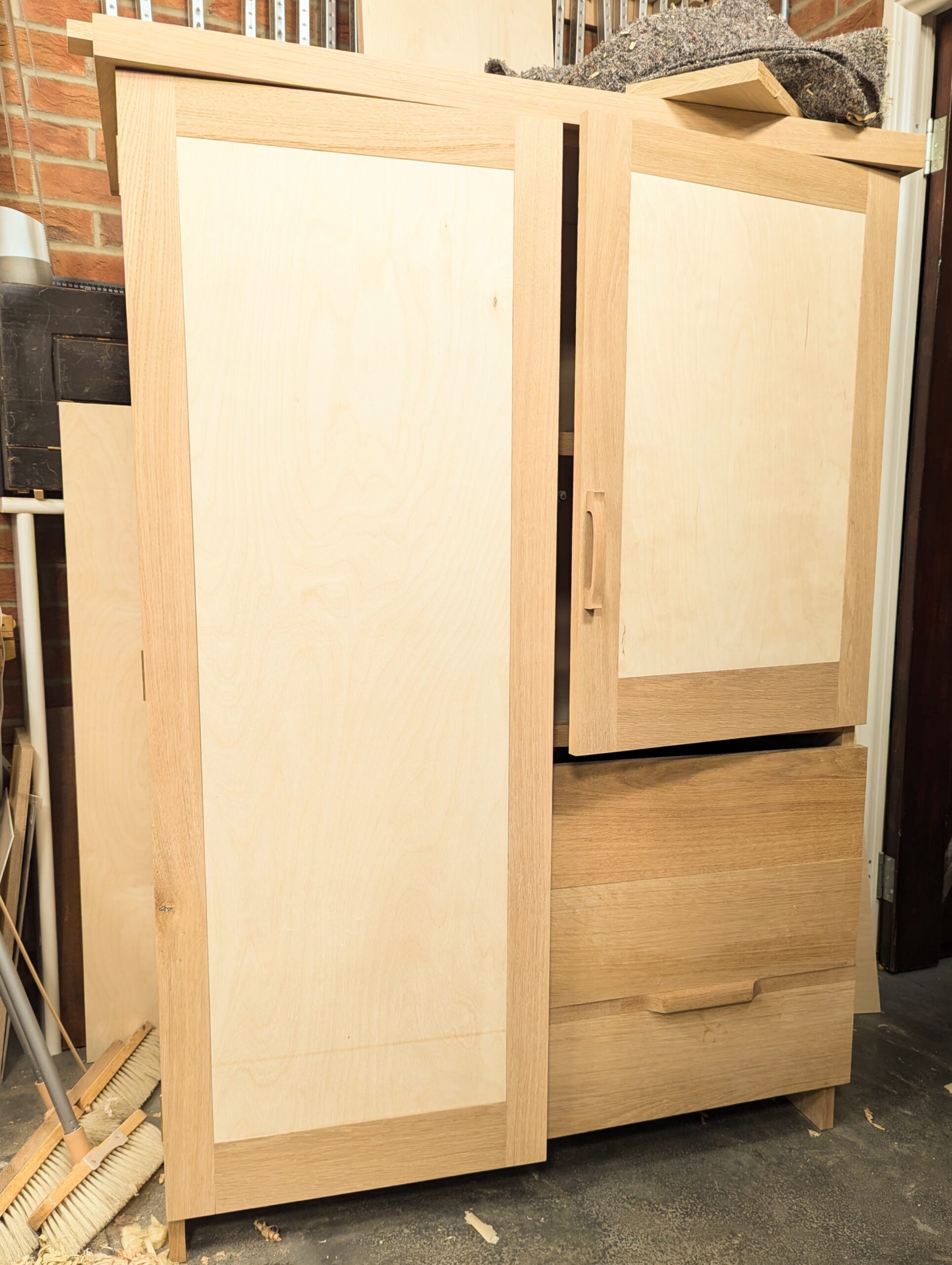 To make my cupboard I did not want lips to my panels and neither did I want planted stops or moulds holding the panels in place. The frames are near flush with plywood facing on the outside. It's quite an unusual design. I had an idea that the concept would give me something a bit, well, different. I also thought it would be robust. What I did not know was that it would be incredibly robust and so stout that I cannot move it easily on my own.