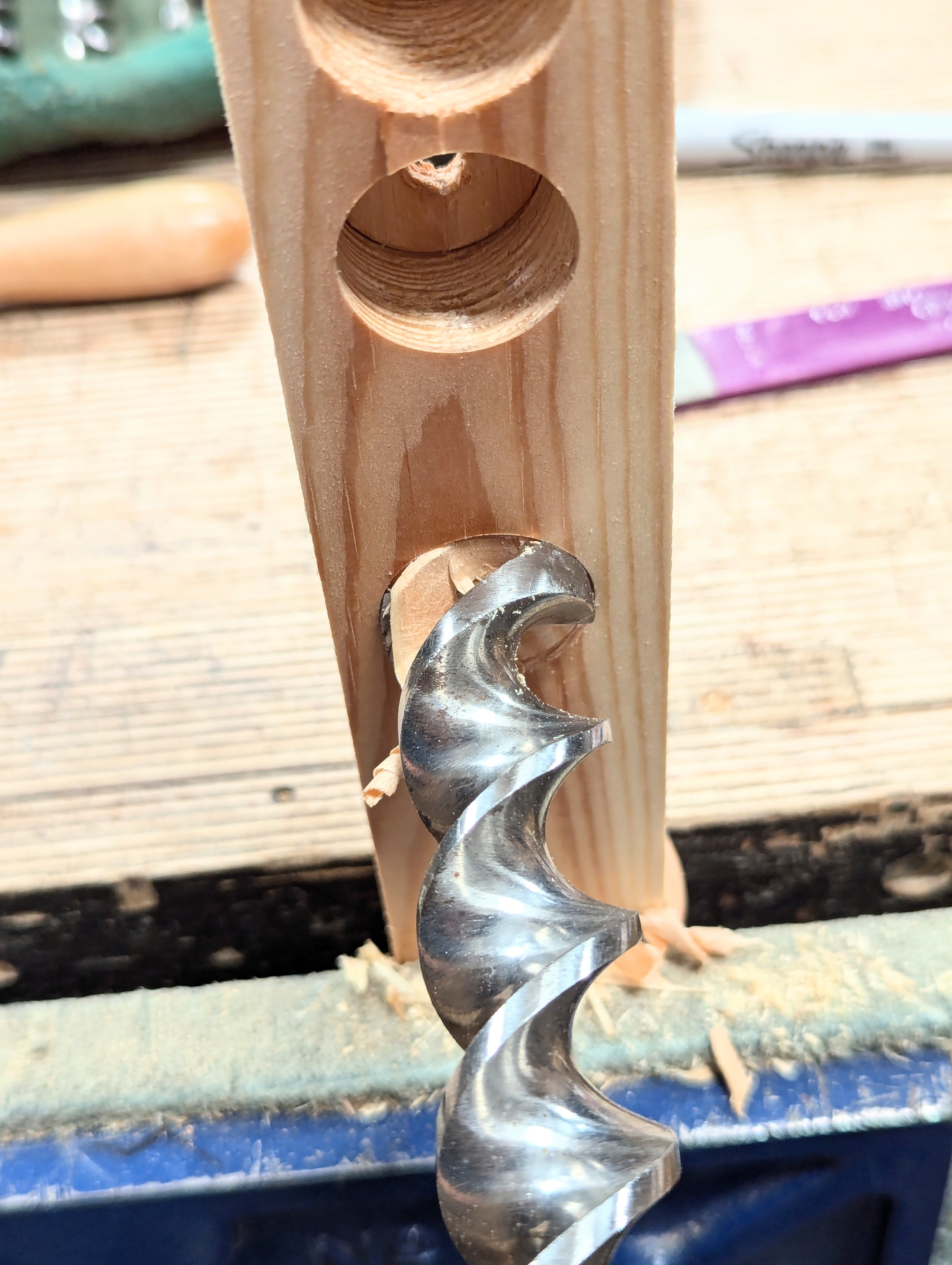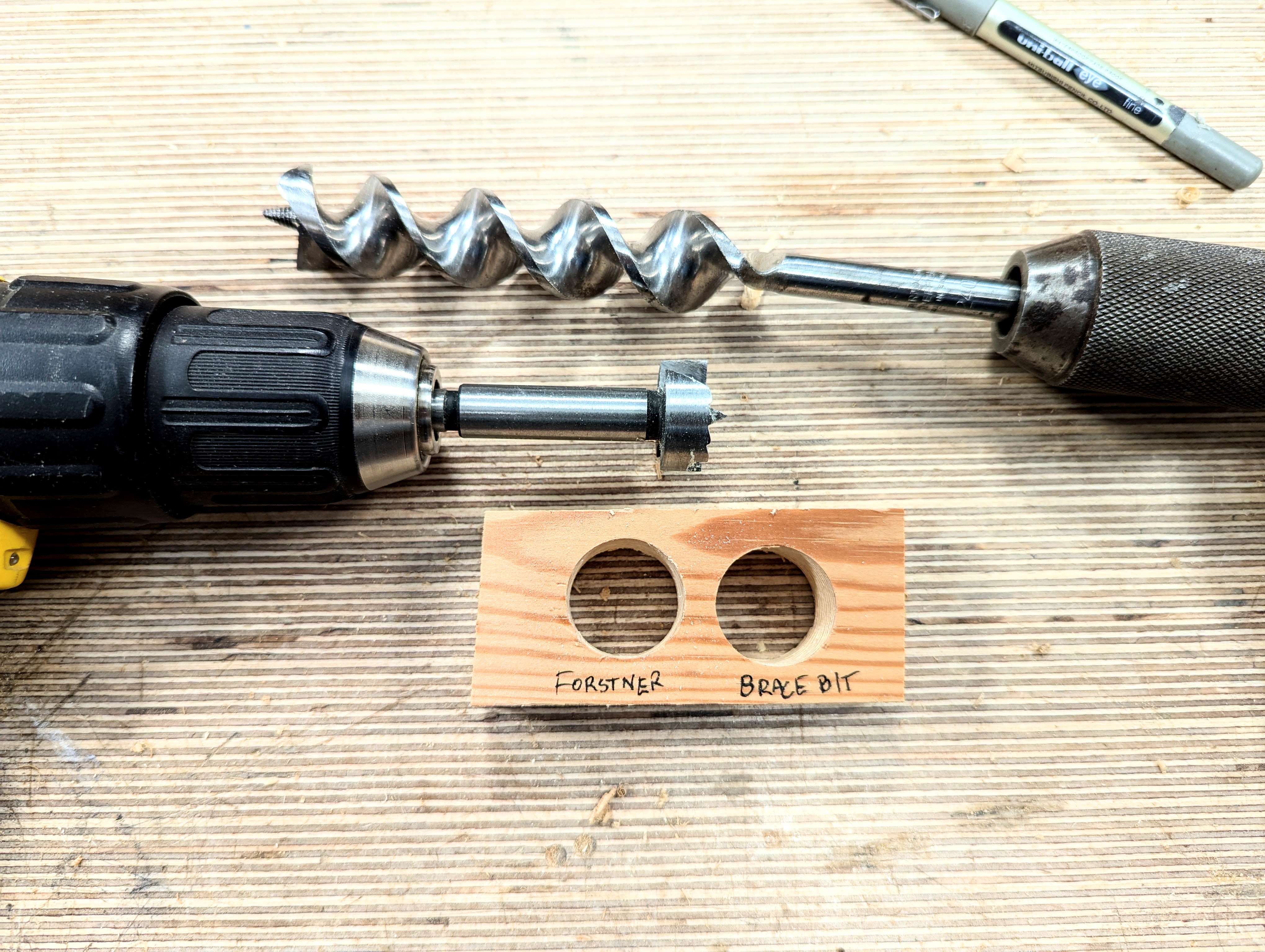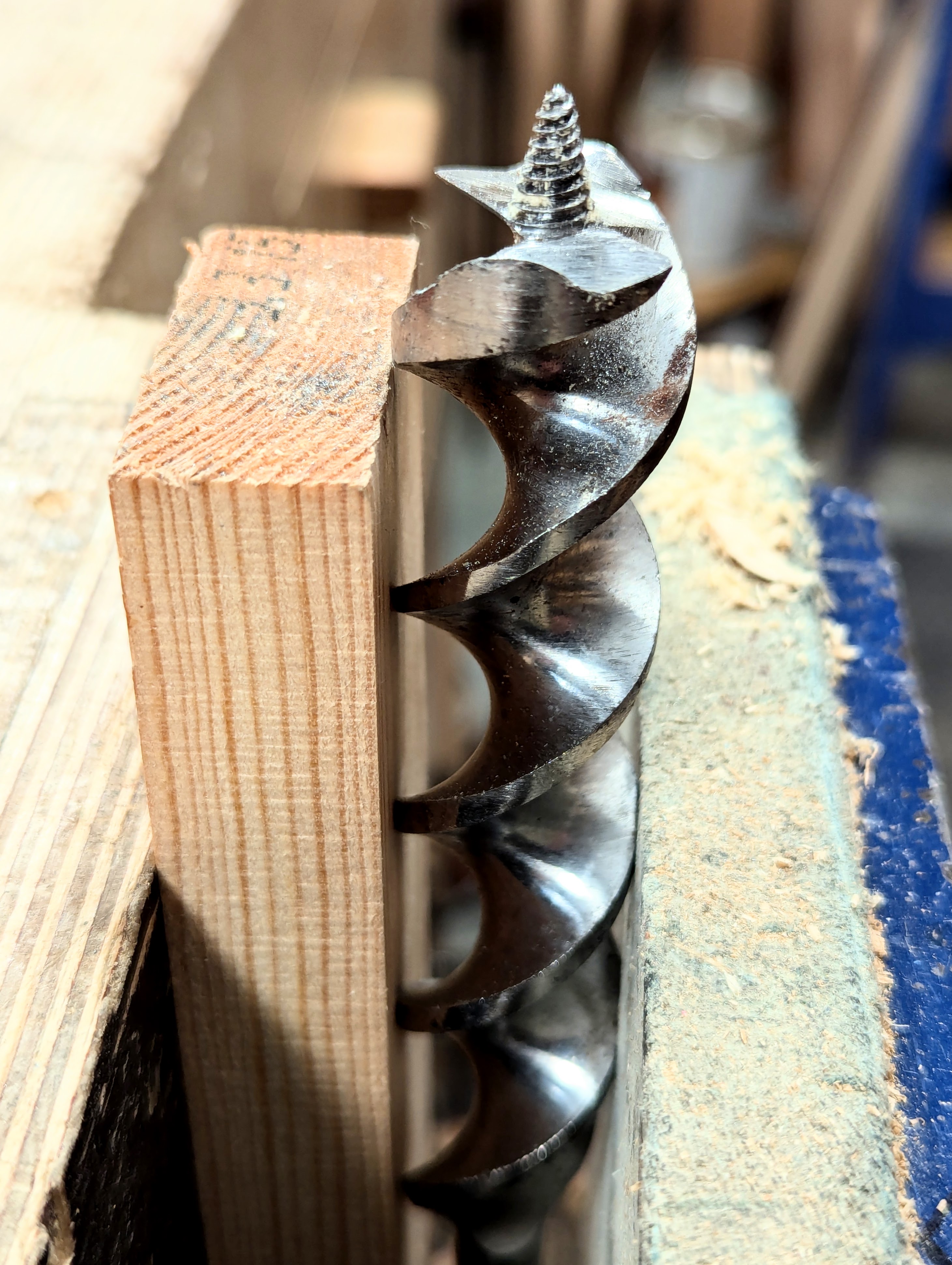 I drilled holes with each bit and found some needed small five-stroke, five-second tweaks to refine the cutting parts. As I said, all the snails were in pristine shape. These twists pull the bit into the wood alongside your pressure pushing the brace at the wood. You can actually count the turns to establish how deep each revolution takes you, so in the case of my 1" bit, each revolution deepens the hole by precisely 1/16". I set up a drill driver with a newly sharpened, 25mm Forstner bit and drilled through a 3/4" piece of pine. It took 41 seconds. Then I bored a hole next to is with a brace and bit, 1" (25mm) and that took 9 seconds. The quality of the holes was the same. One hole with the battery driven Dewalt drill-driver took 1025 revolutions plus a continuous human energy, without which it would not be able to drill. The brace bit would still drill without my energy pushing, but the energy used is not to push the bit into the wood, but only to keep it engage so that it pulls itself into and through the wood. I cannot say what the difference in human energy was because I have no way nor any desire to measure it, but it felt like less than 10% of the energy I employed with the drill driver.