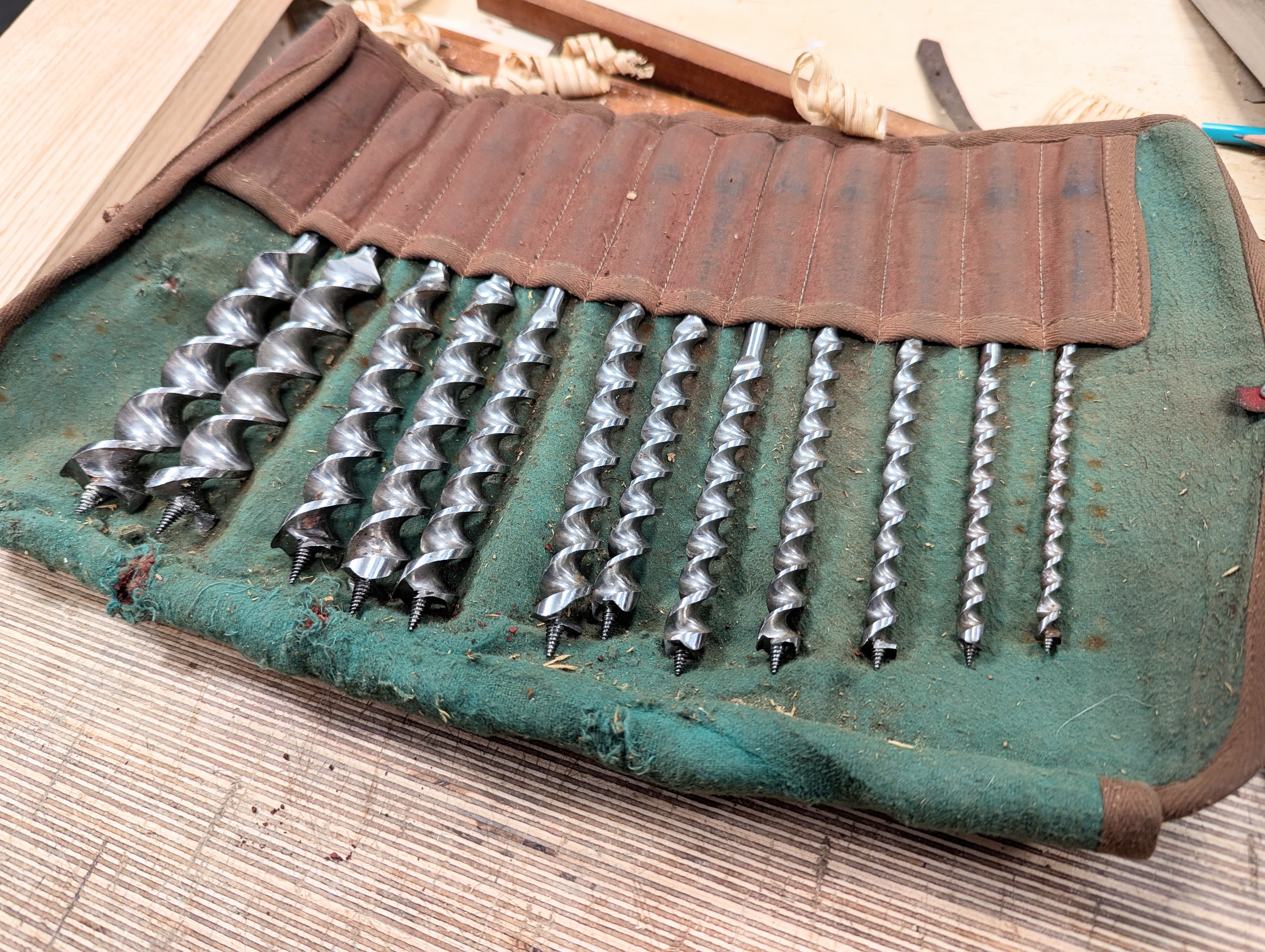 I'd been looking and waiting for this set of auger bits for a couple of years. It's not the scarcity or finding this particular set that took the time, but finding the level of cared-for quality I knew to look and wait for. What exactly was it I was looking for? Firstly, I was wanted clear close-ups of the business end of each bit. The thread of what's referred to as the 'snail' needs to be all there right up to the very tippy-top of the spiral, if possible, and in good condition too. Then next, I needed the outer spurs to be undamaged and definitely not broken off or mangled and the rakers inside each of these spurs and each side of the snail should be lower than the cutting edges of the spurs. The spurs cut the circumference of the hole just ahead of the rakers, and the rakers then come in behind like a paring chisel to lift and remove the now-severed waste. Additionally, I was looking for the character of the former owner. Who was he, and what was his job?