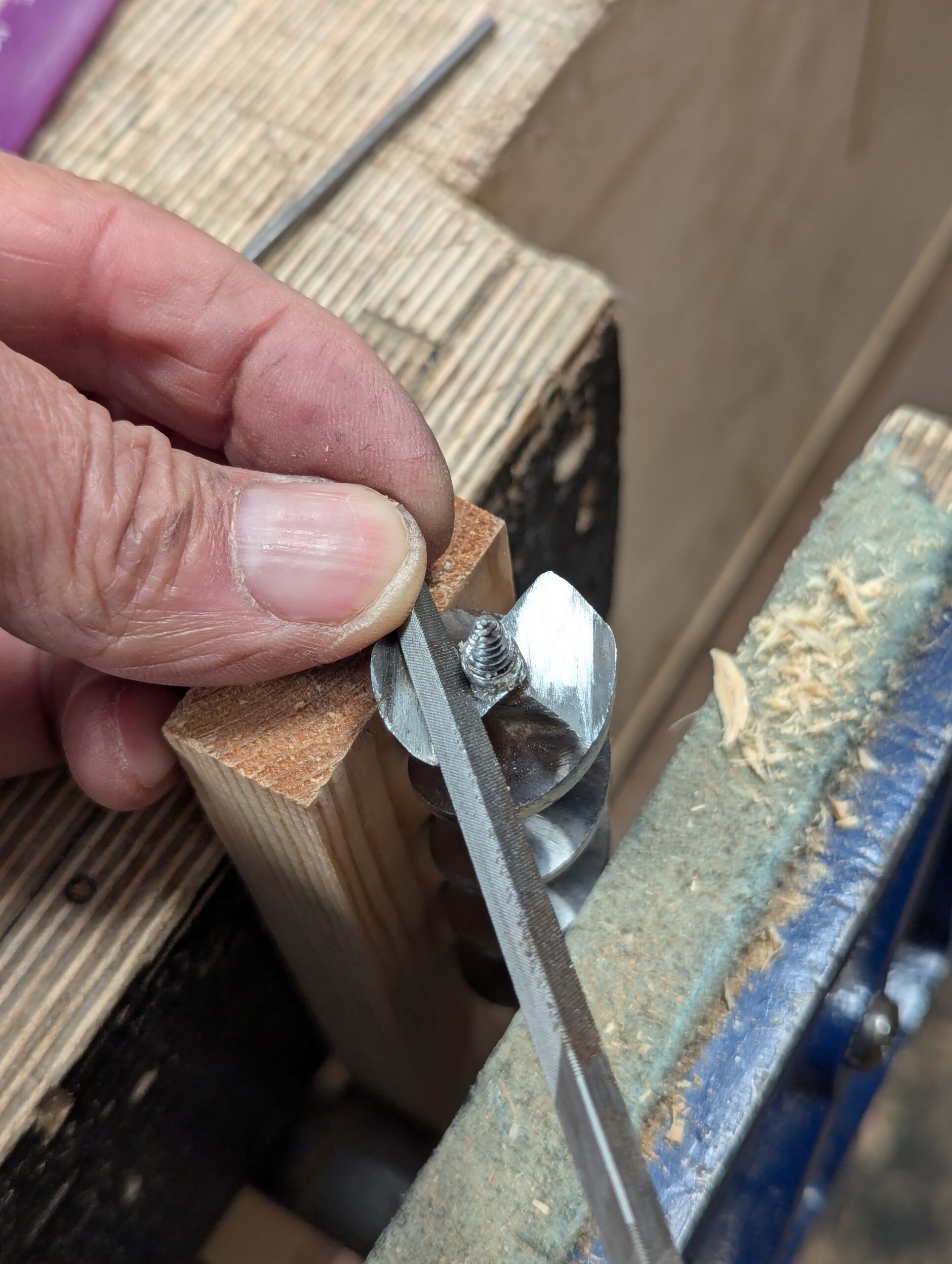 My first sharpening with the saw file is on the top side of the inner incline of the rakers, each side of the snail. For this work, I use the top end of the stick as a platform, lean the bit away from me and file the incline with the saw file first. There is a tendency to steepen the angle of presentation to get to the edge quicker, but this is false economy, it is important to bring the high point furthest away from me down rather than keep 'thickening' the angle.