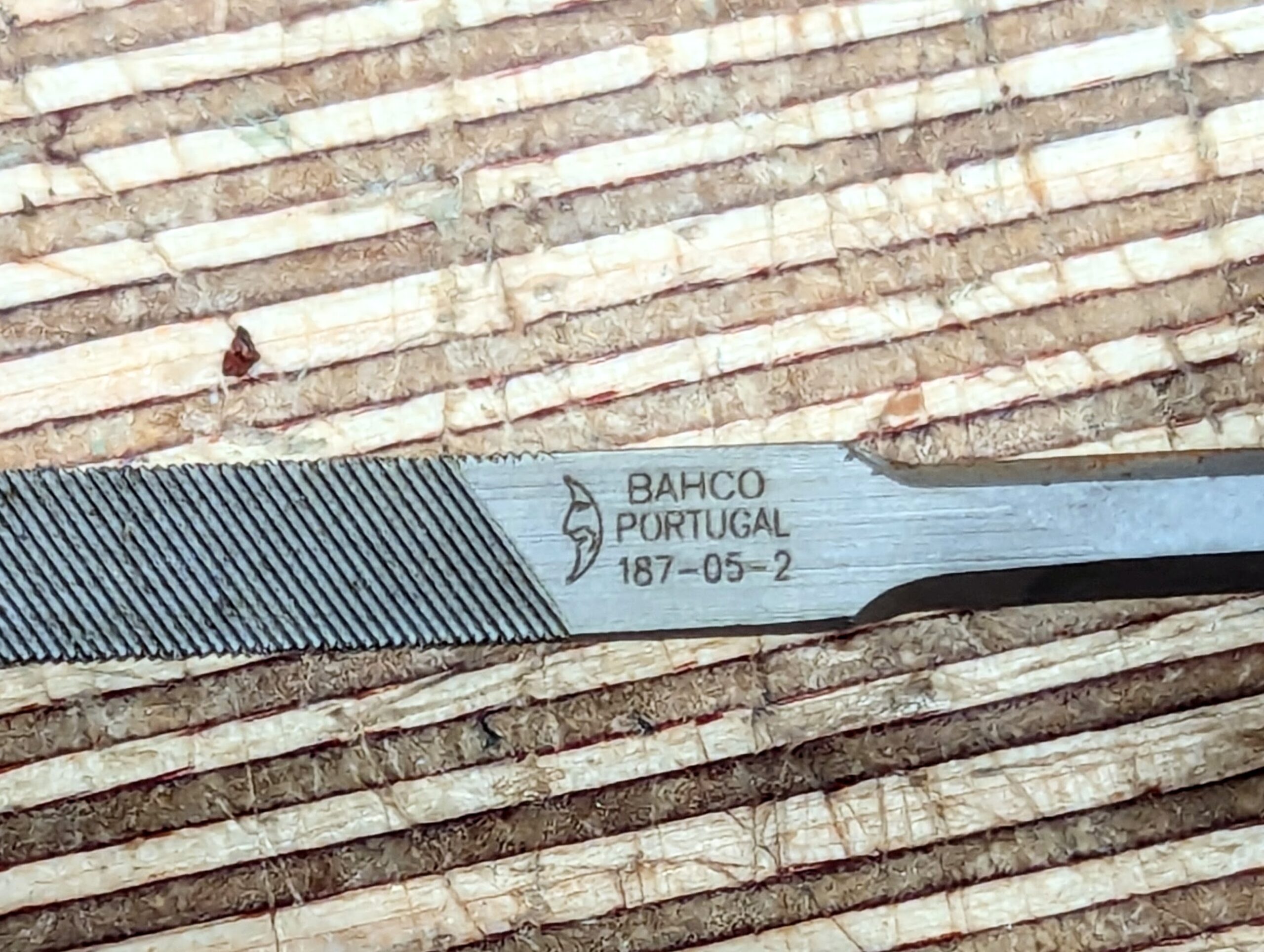 For sharpening the bits, I used a Bahco saw file 187-05-2 so no need to go out and buy something special, just your regular saw file. I like to use a refining file to get nearer to a sharper edge, even though the saw file gets a decent cutting edge. This additional file is round on one face and flat on the other. Because it tapers to a narrow boat-shaped point, it allows you to get tight into the inside corners. This useful file is a Bahco Oberg 304-16-4. Remember that these files are not a single use throwaway item. The saw file should sharpen 30 saw sharpenings easily, so that's a few years for many of you.