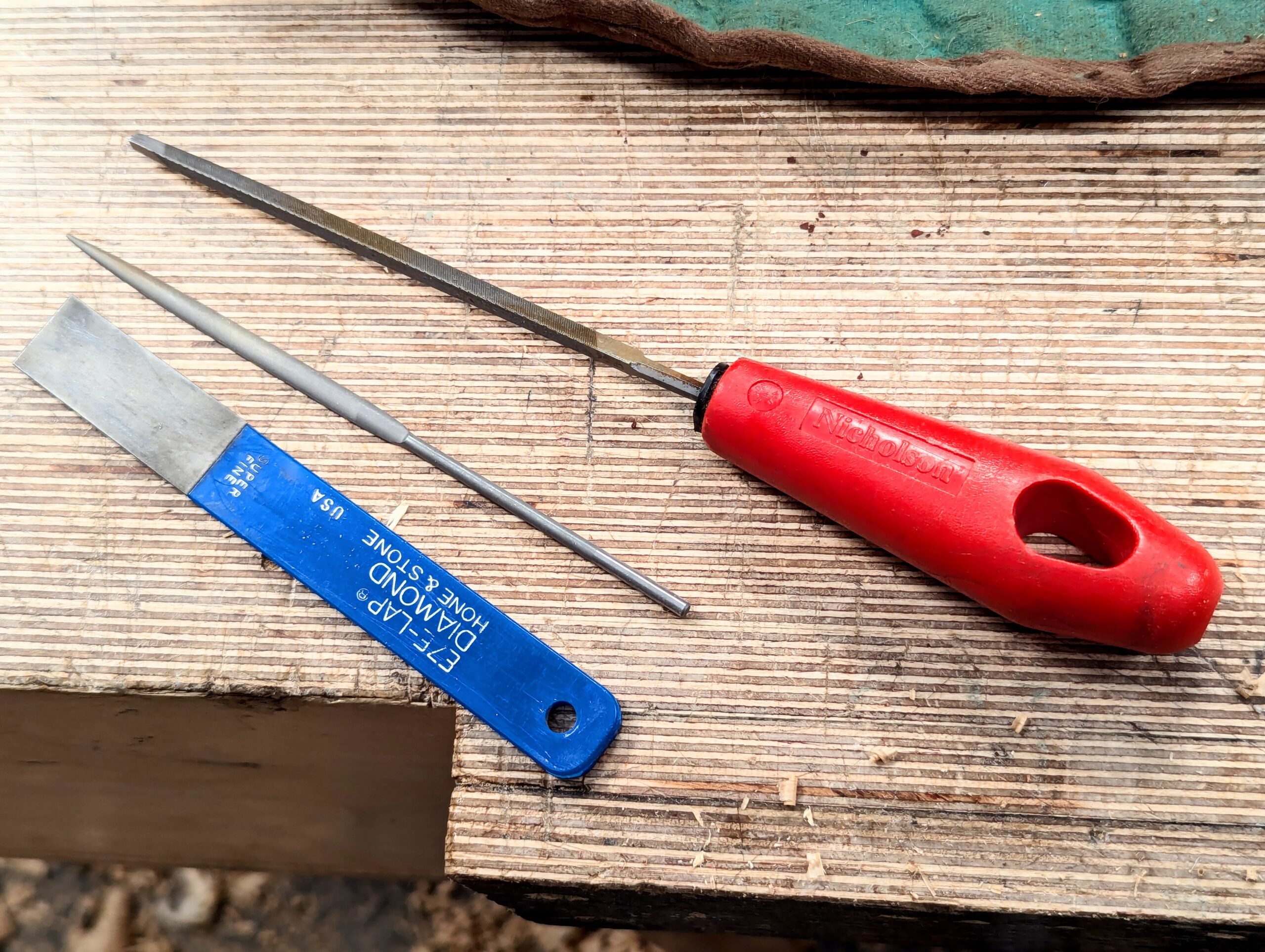 After the saw file, I switched to the refining file, working at the same pitch. The last level, which is a bit of a luxury really, is with a super-fine diamond hone. I must say here that this is a luxury level and far from essential. I just happen to have a diamond hone, and it only takes a few seconds to improve the edge, so I do it.