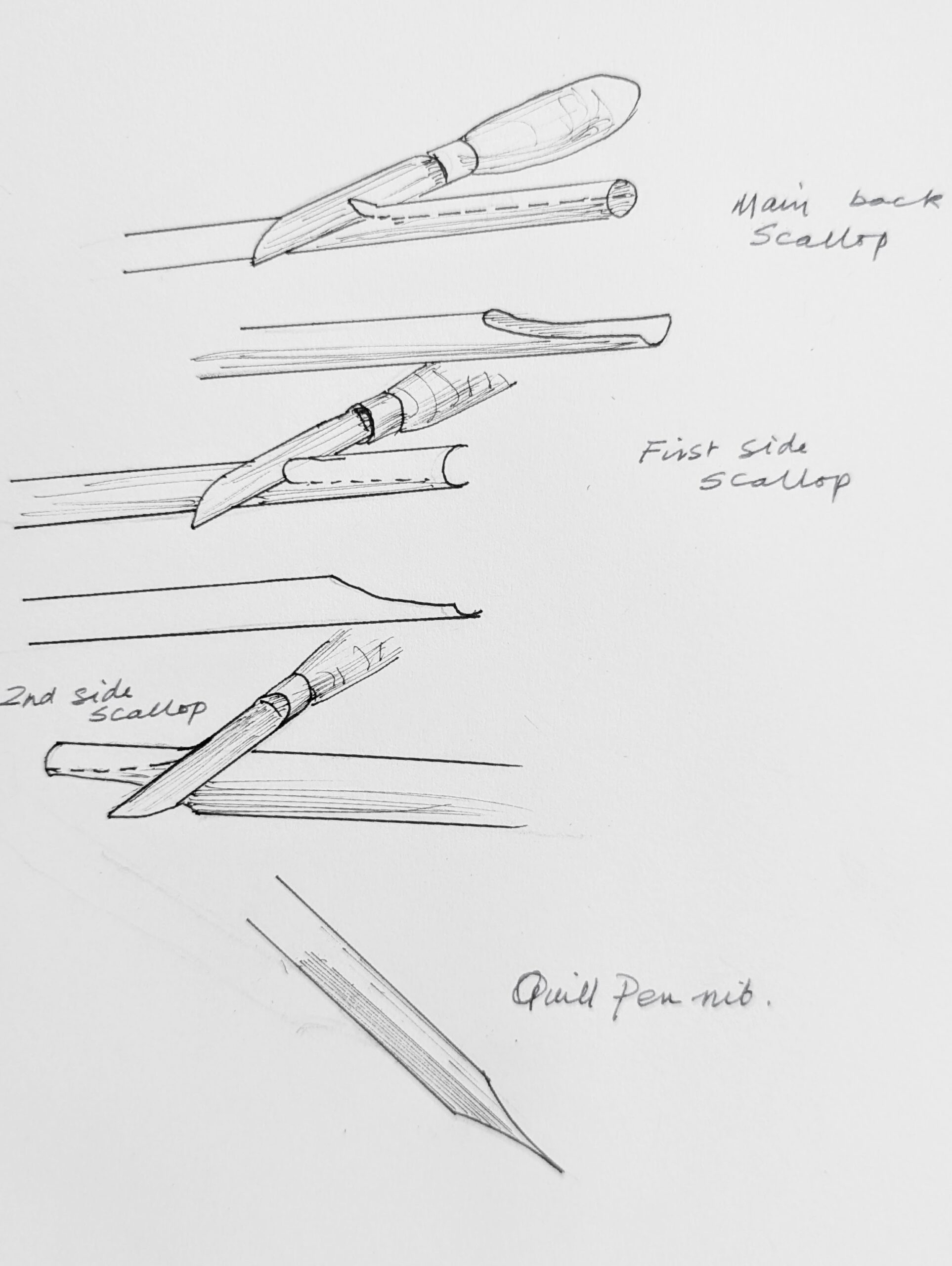I think it goes to show that one of the most basic skills on the planet, sharpening, owned by all at one time, was the basic skill of honing a decent cutting edge. I carry a knife in my pocket everywhere I go. I wouldn't be without one. Mine's a single bladed lambs-foot pocket knife with a rigidly good blade that, though not a lock knife, stays. I don't think any man in my youth ever left home without a decent pocket knife. In the UK, we call them penknives. Pen and pocket knives are one and the same. Why did we call them pen knives? Because back in time, the penknife was used to sharpen the feather quills used for dipping ink pens to write with. After a while, the sharp point of the quill would turn or become damaged and lose the crispness needed for fine writing. Three quick scallops gave you a new point to write with.