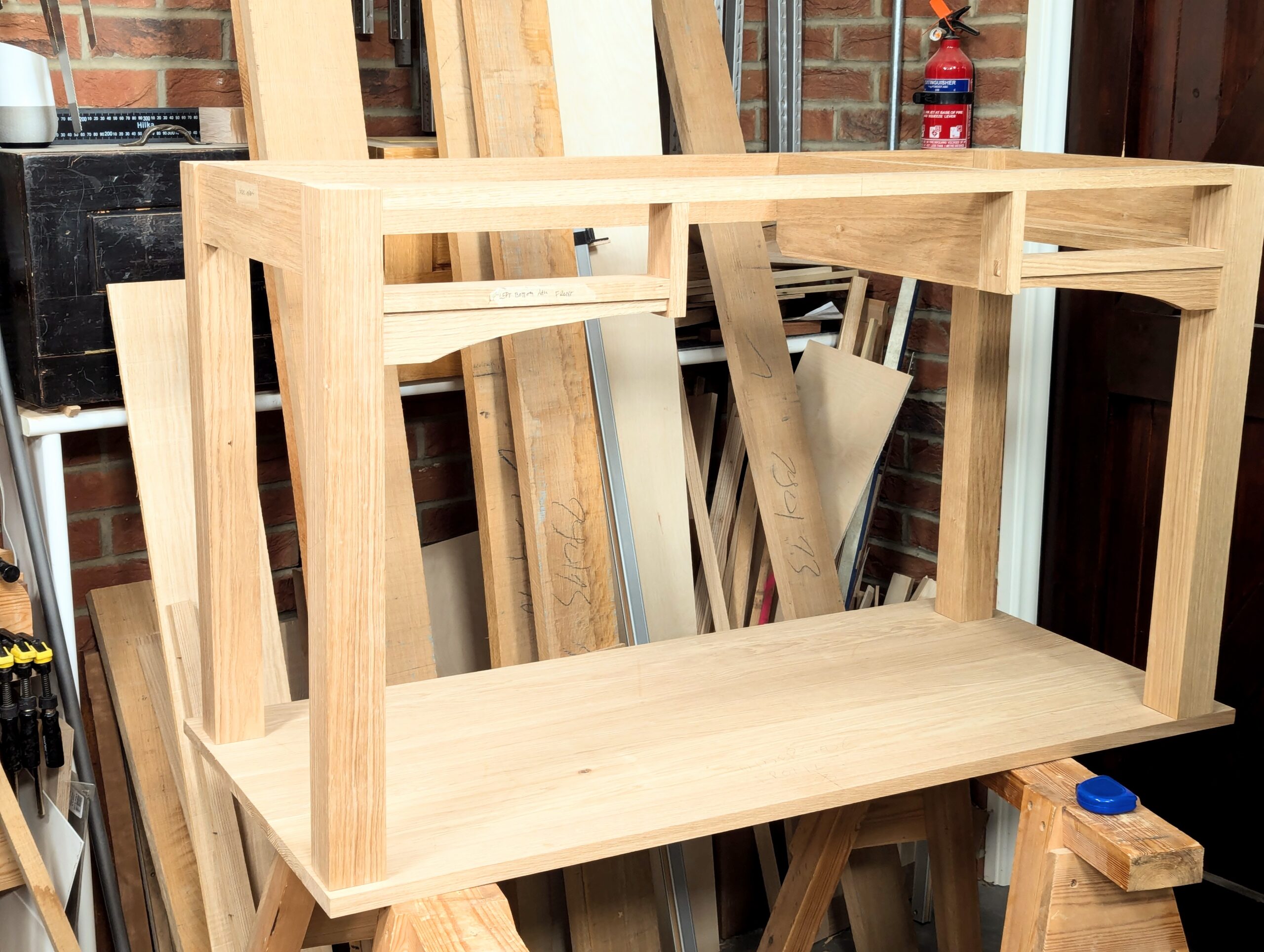 Planing the wood, oak especially, I think, is almost always pure joy. Perhaps it's because it is so very easy to plane and scrape, so responsive, I suppose, but it also has so much character and the appearance changes under every stroke taken. How can this not enrich any maker's life. People will always say to me how much they "love wood", when the reality is that all they actually get is the merest snapshot with the wood beneath its plastic coat of some kind of varnish. It's true too that rarely will they actually touch the real wood either, let alone split, plane and saw it. It's also a sad thing and I am sorry to say it, though they may well believe differently, that is also true when a person makes using machine methods only. Sensory perception is magnified a hundred times simply by using hand tools, whereas machines mainly minimise and even by necessity eliminate the deeper involvement hand tools demand. For safety reasons, machining with some of the most dangerous machines available, you must wear protection for 95% of tasks. I know many if not most woodworkers with a machine setup do not, but that's up to them. It's their health and safety.